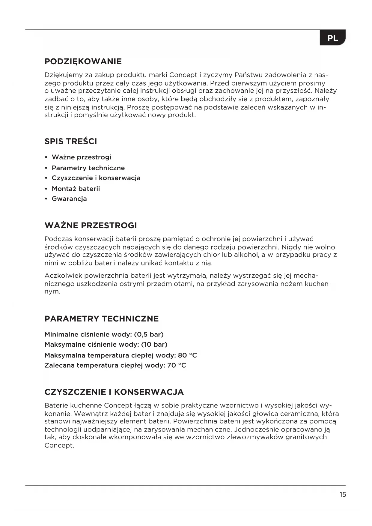 Baterie kuchenne Concept łączą w sobie praktyczne wzornictwo i wysokiej jakości wy- konanie. Wewnątrz każdej baterii znajduje się wysokiej jakości głowica ceramiczna, która stanowi najważniejszy element baterii. Powierzchnia baterii jest wykończona za pomocą technologii uodparniającej na zarysowania mechaniczne. Jednocześnie opracowano ją tak, aby doskonale wkomponowała się we wzornictwo zlewozmywaków granitowych Concept.16