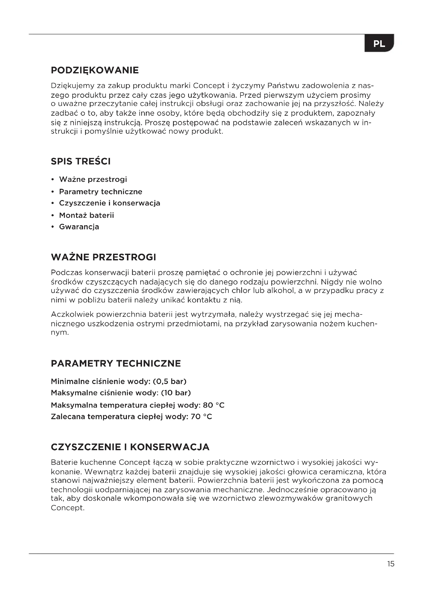 Podczas konserwacji baterii proszę pamiętać o ochronie jej powierzchni i używać środków czyszczących nadających się do danego rodzaju powierzchni. Nigdy nie wolno używać do czyszczenia środków zawierających chlor lub alkohol, a w przypadku pracy z nimi w pobliżu baterii należy unikać kontaktu z nią. Aczkolwiek powierzchnia baterii jest wytrzymała, należy wystrzegać się jej mecha- nicznego uszkodzenia ostrymi przedmiotami, na przykład zarysowania nożem kuchen- nym. PARAMETRY TECHNICZNE Minimalne ciśnienie wody: (0,5 bar) Maksymalne ciśnienie wody: (10 bar) Maksymalna temperatura ciepłej wody: 80 °C Zalecana temperatura ciepłej wody: 70 °C