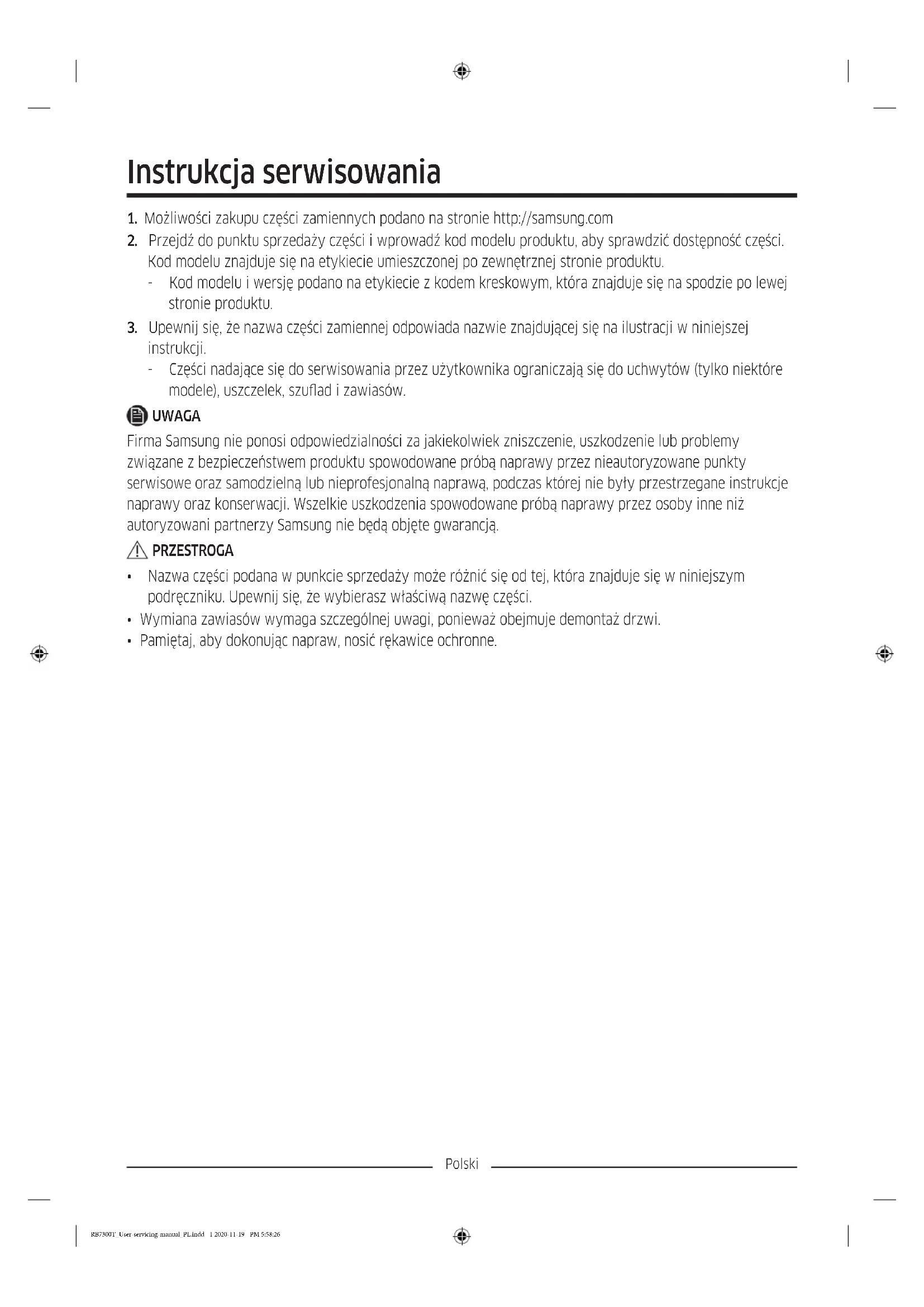 - Pamiętaj, aby dokonując napraw, nosić rękawice ochronne. RB7300T_User-servicing-manual_PL.indd 1 2020-11-19 PM 5:58:26Polski Rzeczywisty wygląd i dostarczone elementy urządzenia mogą się różnić w zależności od modelu i kraju.