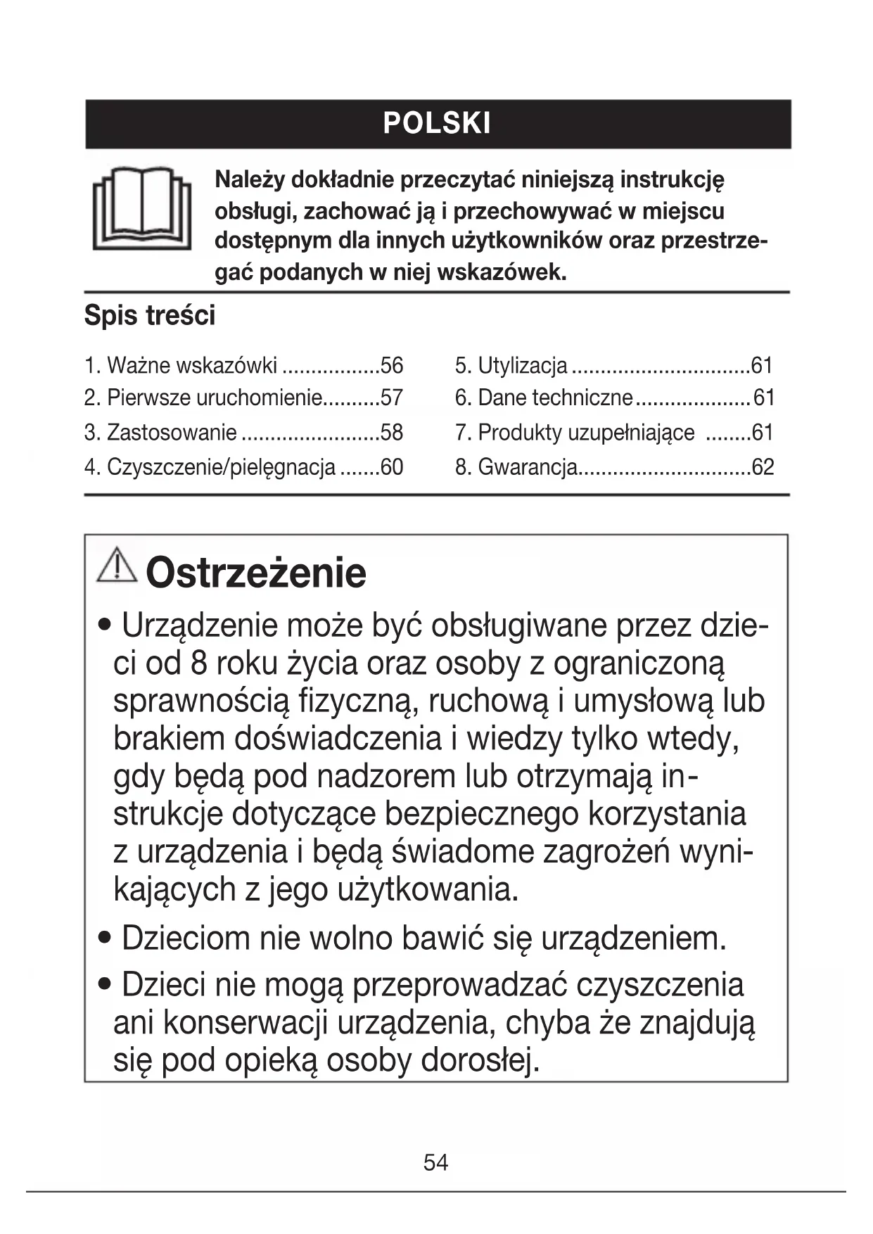 - Dzieci nie mogą przeprowadzać czyszczenia ani konserwacji urządzenia, chyba że znajdują się pod opieką osoby dorosłej. POLSKI Spis treści 1. Ważne wskazówki p. 562