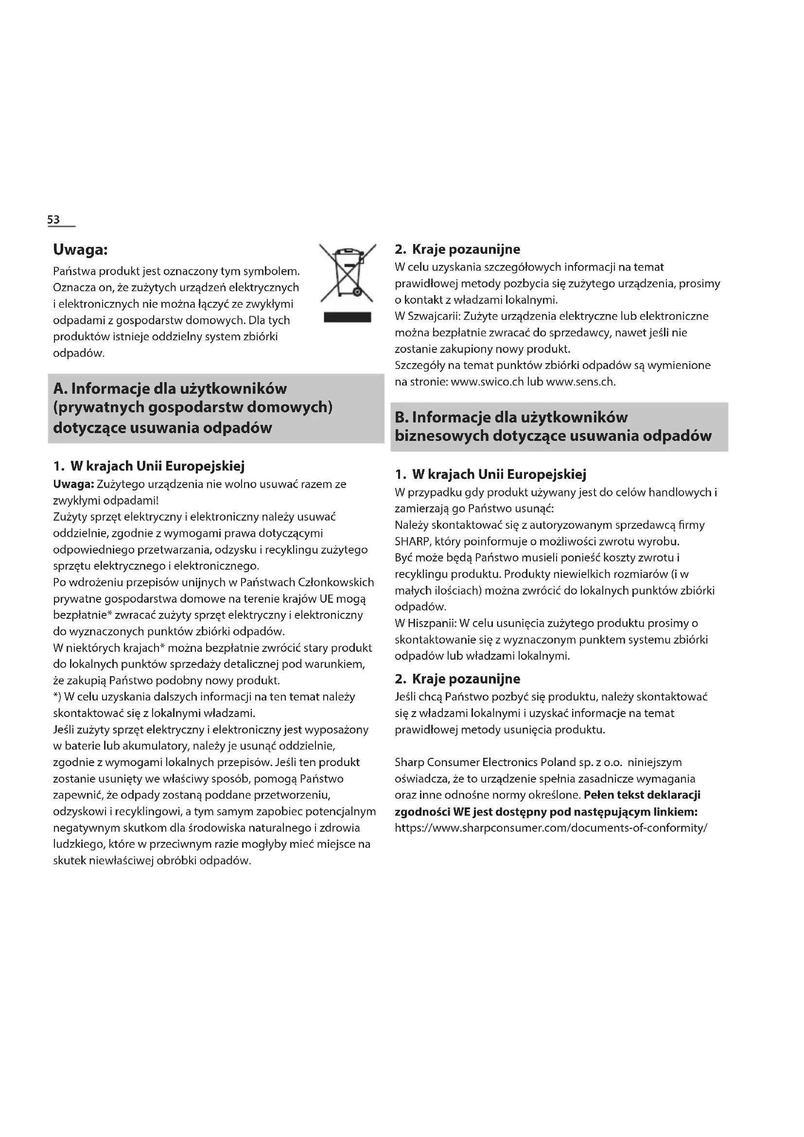 Szanowny Kliencie, Dziękujemy Ci za zakup urządzenia SHARP. Informujemy, że Twoje uprawnienia gwarancyjne są wskazane w Europejskiej Karcie Gwarancyjnej. W celu uzyskania jej warunków, prosimy o jej ściągnięcie ze strony internetowej www.sharpconsumer.eu lub zwrócenie się do sprzedawcy, u którego urządzenie zostało nabyte. Kopia warunków karty gwarancyjnej może być Państwu przesłana za pośrednictwem poczty elektronicznej lub tradycyjnej, po skierowaniu prośby na adres service.pl@sharpconsumer.eu lub po kontakcie telefonicznym pod numerem +48-22-1253453. W celu skorzystania z uprawnień gwarancyjnych, konieczne jest zachowanie dowodu zakupu urządzenia.