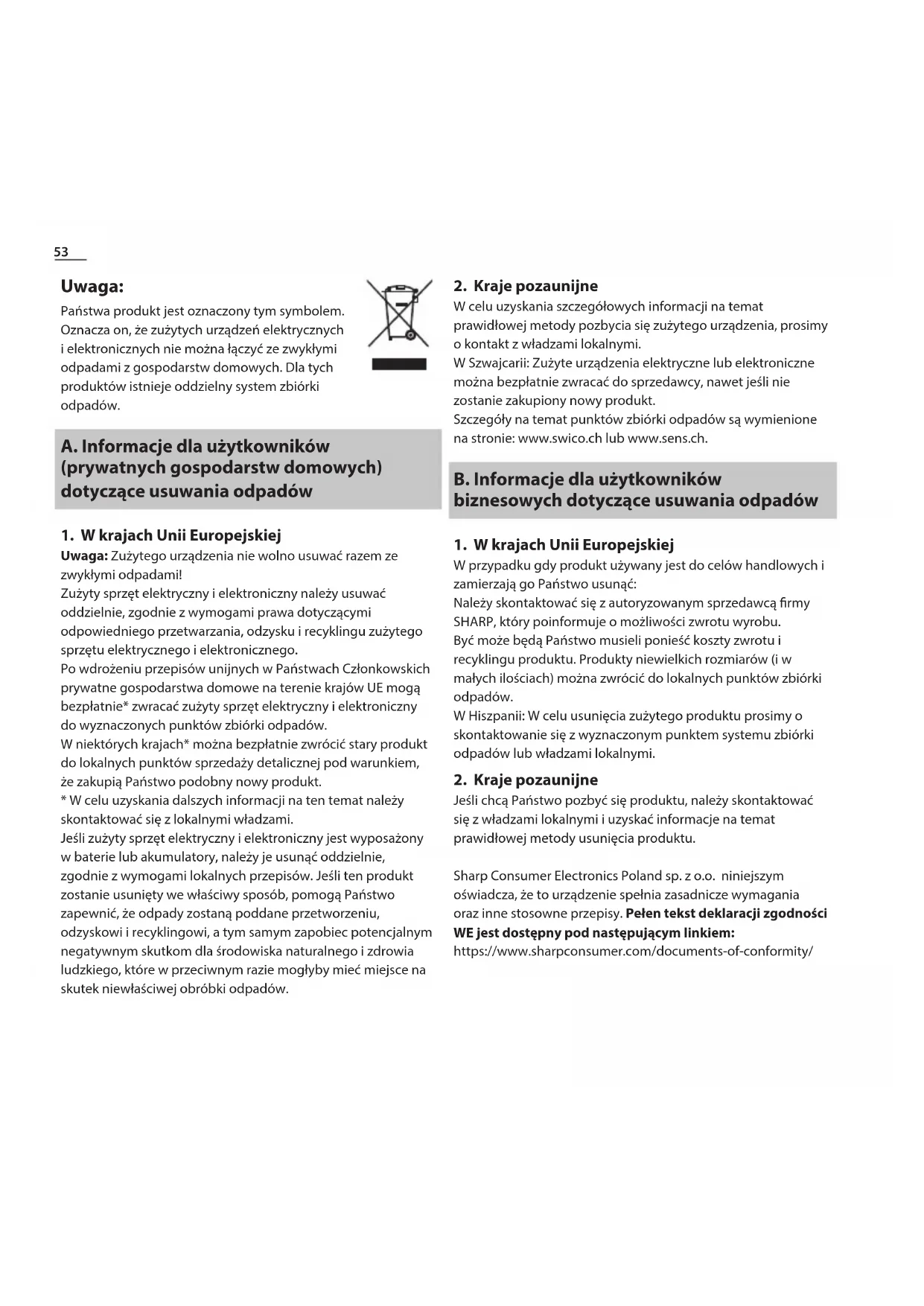 W przypadku gdy produkt używany jest do celów handlowych i zamierzają go Państwo usunąć: Należy skontaktować się z autoryzowanym sprzedawcą rmy SHARP, który poinformuje o możliwości zwrotu wyrobu. Być może będą Państwo musieli ponieść koszty zwrotu i recyklingu produktu. Produkty niewielkich rozmiarów (i w małych ilościach) można zwrócić do lokalnych punktów zbiórki odpadów. W Hiszpanii: W celu usunięcia zużytego produktu prosimy o skontaktowanie się z wyznaczonym punktem systemu zbiórki odpadów lub władzami lokalnymi.
