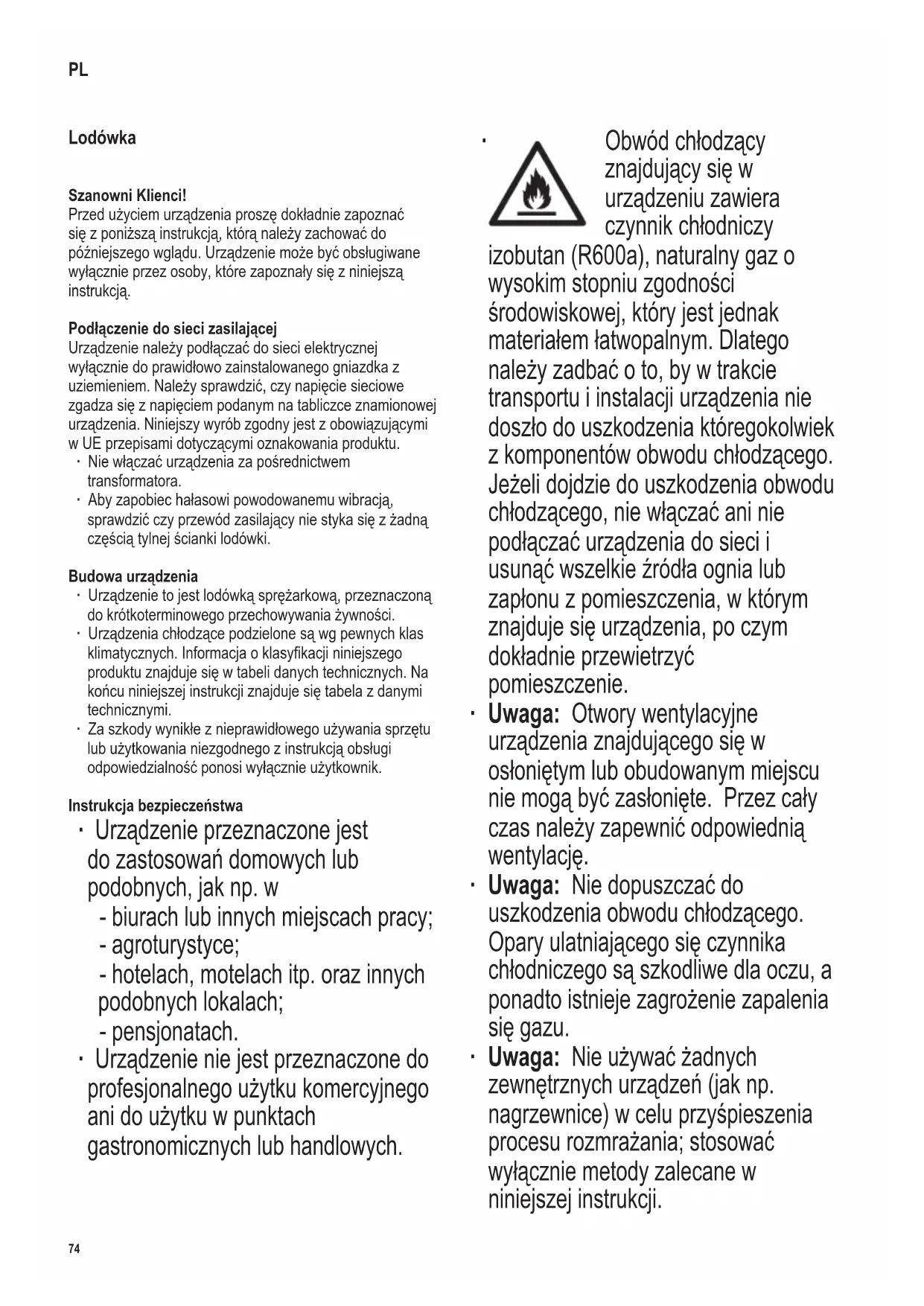 Obwód chłodzący znajdujący się w urządzeniu zawiera czynnik chłodniczy izobutan (R600a), naturalny gaz o wysokim stopniu zgodności środowiskowej, który jest jednak materiałem łatwopalnym. Dlatego należy zadbać o to, by w trakcie transportu i instalacji urządzenia nie doszło do uszkodzenia któregokolwiek z komponentów obwodu chłodzącego. Jeżeli dojdzie do uszkodzenia obwodu chłodzącego, nie włączać ani nie podłączać urządzenia do sieci i usunąć wszelkie źródła ognia lub zapłonu z pomieszczenia, w którym znajduje się urządzenia, po czym dokładnie przewietrzyć pomieszczenie. ∙ Uwaga: Otwory wentylacyjne urządzenia znajdującego się w osłoniętym lub obudowanym miejscu nie mogą być zasłonięte. Przez cały czas należy zapewnić odpowiednią wentylację. ∙ Uwaga: Nie dopuszczać do uszkodzenia obwodu chłodzącego. Opary ulatniającego się czynnika chłodniczego są szkodliwe dla oczu, a ponadto istnieje zagrożenie zapalenia się gazu. ∙ Uwaga: Nie używać żadnych zewnętrznych urządzeń (jak np. nagrzewnice) w celu przyśpieszenia procesu rozmrażania; stosować wyłącznie metody zalecane w niniejszej instrukcji. PL75 142 x 208 mm ∙ Uwaga! Nie używać żadnych innych urządzeń elektrycznych (np. maszyny do robienia lodu) wewnątrz zamrażarki, chyba że niniejsza instrukcja wyraźnie mówi inaczej. ∙ Przed podłączeniem urządzenia do sieci należy dokładnie sprawdzić, czy nie zostało ono – w tym także przewód zasilający – uszkodzone podczas transportu. W przypadku stwierdzenia jakiegokolwiek uszkodzenia, nie wolno podłączać urządzenia do zasilania. ∙ Przy ustawianiu urządzenia powinno upewnić się, że przewody elektryczne nie są zaplątane lub uszkodzone. ∙ Nie należy ustawiać przenośnych gniazdek elektrycznych lub źródeł zasilania w pobliżu tylnej strony urządzenia. ∙ Urządzenie nie jest przeznaczone do przechowywania substancji wybuchowych, jak np. pojemniki z palnym aerozolem. ∙ W przypadku sprzedaży, przekazania osobie trzeciej lub utylizacji urządzenia w przeznaczonym do tego miejscu, należy zwrócić uwagę na obecność czynnika izolującego cyklopentan C