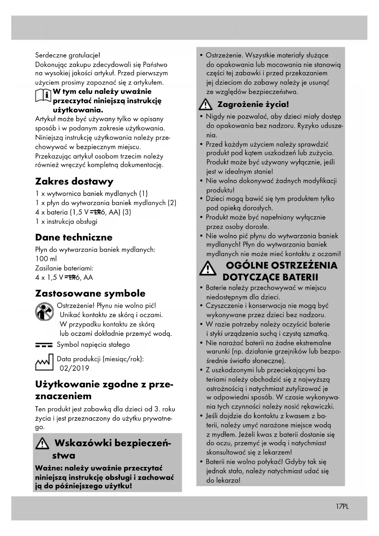 mać ruch koła obrotowego (1f). Przechowywanie, czyszcze- nie Należy zawsze przechowywać produkt w suchym i czystym miejscu w pomieszczeniu o kontrolowanej temperaturze. Czyścić wyłącznie przy użyciu wilgotnej ście- reczki. WAŻNE! Nie czyścić przy użyciu agresywnych środków czyszczących. Wskazówki dotyczące usu- wania odpadów Artykuł i materiały opakowaniowe należy usunąć zgodnie z miejscowymi przepisami. Materiały opakowaniowe jak np. worki foliowe nie mogą dostać się w ręce dzieci. Materiały opakowaniowe należy przechowywać w miejs- cu niedostępnym dla dzieci.19PL Zutylizować produkt i opakowanie w sposób przyjazny dla środowiska. Kod materiału do recyklingu służy do oznaczenia różnych materiałów przeznaczonych do zwrotu do przetwór- stwa wtórnego (recyklingu). Kod składa się z symbolu, który powinien odzwierciedlać cykl odzysku, oraz numeru oznaczającego materiał. Urządzeń oznakowanych znajdującym się obok symbolem nie wolno wyrzucać razem z odpadami z gospodarstwa domowego. Urządzenia elektryczne i elektroniczne muszą być zbierane i utylizowane oddzielnie. Należy uzyskać informacje w lokalnej gminie odnośnie utylizacji zgodnej z przepisami. Przed utylizacją należy wyjąć baterię z artykułu. Usuwanie baterii Należy zwrócić uwagę: Baterie są odpadami specjalnymi, które zgodnie z przepisami nie mogą być wyrzucane razem z odpadami z gospodarstwa domowego. Zużyte baterie można oddać bezpłatnie w gminnych punktach zbiorczych lub do sklepu. Udostępnia się tu odpowiednie pojemniki na odpady. Wskazówki dotyczące gwa- rancji i obsługi serwisowej Produkt został wyprodukowany bardzo staran- nie i podczas stałej kontroli. Państwo otrzymują na ten produkt trzy lata gwarancji od daty zakupu. Prosimy o zachowanie paragonu. Gwarancja obejmuje tylko błędy materiałowe lub fabryczne i traci ważność podczas używania produktu nie właściwie i nie zgod- nie z jego przeznaczeniem. Państwa prawa, w szczególności zasady odpowiedzialności z tytułu rękojmi, nie zostaną ograniczone tą gwarancję. W razie ewentualnych reklamacji należy skontaktować się pod niżej podanym numerem infolinii lub poprzez pocztę elektroniczną. Nasi współpracownicy omówią z Państwem jak najszybciej dalszy przebieg sprawy. Z naszej strony gwarantujemy doradztwo. Czas gwarancji nie zostanie przedłużony przez ewentualnie podjęte naprawy na podstawie gwarancji, prawnej odpowiedzialności z tytułu rękojmi czy dokonania bezpłatnej naprawy. Dotyczy to również wymienionych i naprawi- onych części. Po upłynięciu czasu gwarancji powstałe naprawy są płatne. IAN: 313534 Serwis Polska Tel.: 22 397 4996 E-Mail: deltasport@lidl.pl20 CZ Srdečně blahopřejeme! Vaším nákupem jste se rozhodli pro výrobek vy- soké kvality. Před prvním použitím se s výrobkem dobře seznamte. Pozorně si k tomu přečtěte násle- dující návod k použití. Výrobek používejte pouze tak, jak je popsáno, a v uváděných oblastech použití. Tento návod dobře uschovejte. Při předání výrobku dále dalším osobám s ním rovněž předejte všechny podklady. Obsah balení 1 x stroj na mýdlové bubliny (1) 1 x tekutina s mýdlovými bublinami (2) 4 x baterie (1,5 V LR6, AA) (3) 1 x návod k obsluze Technické údaje Tekutina s mýdlovými bublinami: 100 ml Napájení baterie: 4 x 1,5 V LR6, AA Použité symboly Upozornění! Tekutinu nepijte! Vyhněte se kontaktu s kůží a očima. V případě kontaktu s pokožkou nebo očima důkladně omyjte vodou. Symbol pro stejnosměrné napětí Datum výroby (měsíc/rok): 02/2019 Použití dle určení Tento výrobek je hračka pro děti od 3 let, je určen jen pro soukromé použití. Bezpečnostní pokyny Důležité: Čtěte tento návod k obsluze pozorně a bezpodmínečně si ho pone- chejte!
