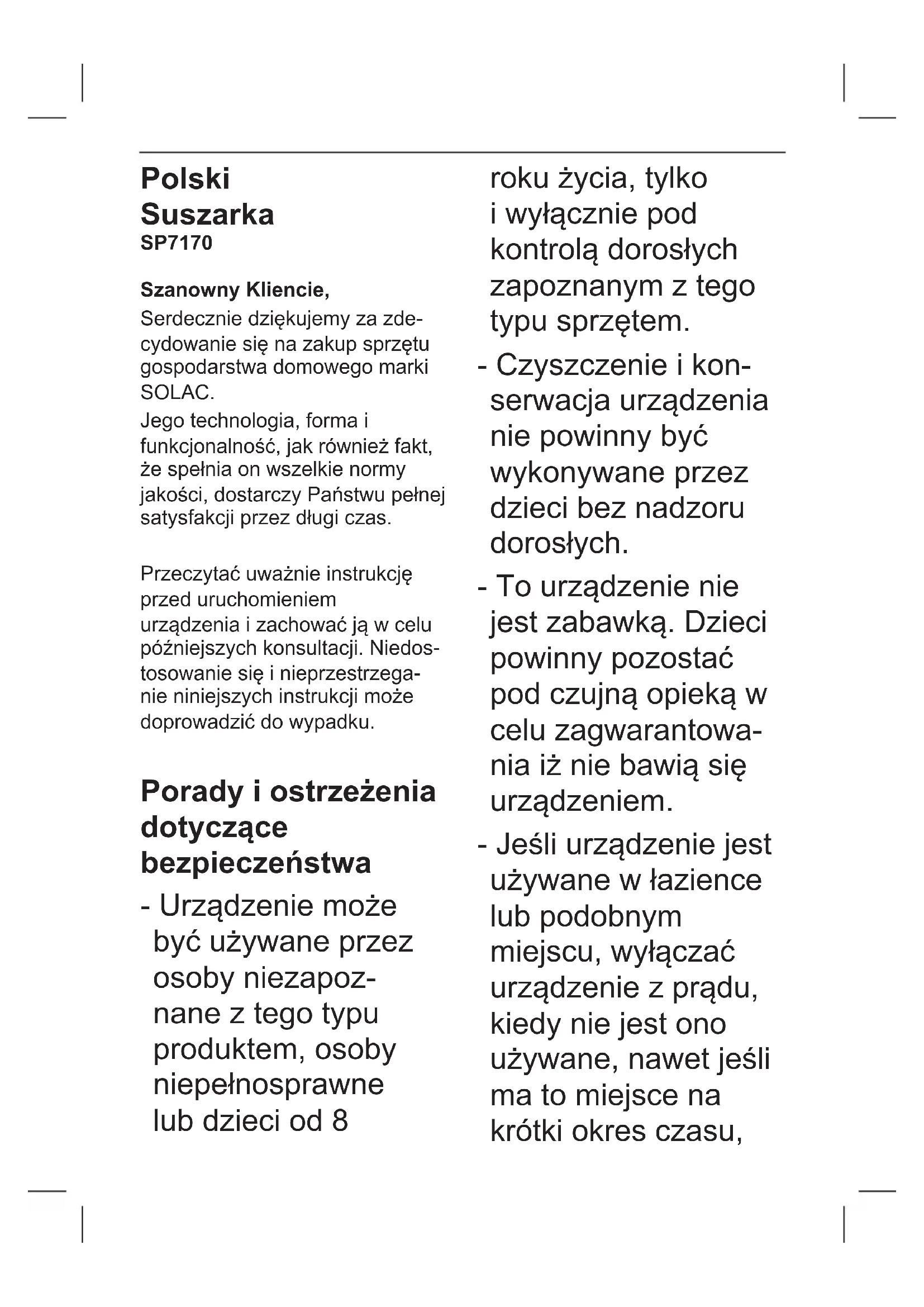 NOST PRODUKTU - Materiály použité k zabalení tohoto přístroje jsou zahrn- uty v souboru, klasikaci a recyklačním systému. Pokud chcete tyto materiály zlikvido- vat, použijte příslušně označené veřejné kontejnery pro každý typ materiálu. - Produkt neobsahuje koncen- trace látek, které by mohly být považovány za škodlivé pro životní prostředí. Tento symbol znamená, že po skončení životnosti přístroje je třeba tento zanést na autorizované místo pro oddělený sběr a recyklaciodpadních elektrických a elektronických zařízení (OEEZ). Tento přístroj je v souladu se směrnicí 2014/35/EU o nízkém napětí, směrnicí 2014/30/ EU o elektromagnetické kompatibilitě, směrnicí 2011/65/ EU o omezení používání některých nebezpečných látek v elektrických a elektronických zařízeních a směrnicí 2009/125/ EC o požadavcích na ekodesign výrobků spojených se spotřebou energiePolski Suszarka SP7170 Szanowny Kliencie, Serdecznie dziękujemy za zde- cydowanie się na zakup sprzętu gospodarstwa domowego marki SOLAC. Jego technologia, forma i funkcjonalność, jak również fakt, że spełnia on wszelkie normy jakości, dostarczy Państwu pełnej satysfakcji przez długi czas. Przeczytać uważnie instrukcję przed uruchomieniem urządzenia i zachować ją w celu późniejszych konsultacji. Niedos- tosowanie się i nieprzestrzega- nie niniejszych instrukcji może doprowadzić do wypadku. Porady i ostrzeżenia dotyczące bezpieczeństwa - Urządzenie może być używane przez osoby niezapoz- nane z tego typu produktem, osoby niepełnosprawne lub dzieci od 8 roku życia, tylko i wyłącznie pod kontrolą dorosłych zapoznanym z tego typu sprzętem. - Czyszczenie i kon- serwacja urządzenia nie powinny być wykonywane przez dzieci bez nadzoru dorosłych. - To urządzenie nie jest zabawką. Dzieci powinny pozostać pod czujną opieką w celu zagwarantowa- nia iż nie bawią się urządzeniem. - Jeśli urządzenie jest używane w łazience lub podobnym miejscu, wyłączać urządzenie z prądu, kiedy nie jest ono używane, nawet jeśli ma to miejsce na krótki okres czasu,ponieważ bliskość wody stanowi zagrożenie, nawet jeśli urządzenie jest wyłączone. - Zaleca się sto- sowanie doda- tkowej ochrony instalacji elek- trycznej zasilającej urządzenie w pos- taci urządzenia różnicowoprądowego o maksymalnej czułości 30mA. Poprosić o radę kom- petentnego instala- tora. - UWAGA: Nie należy używać tego aparatu w pobliżu umywalek, zlewów, wanny lub innych zbiorników zawierających wodę. Ten symbol oznacza, że nie należy używać tego urządzenia w pobliżu wody. - W razie awarii zanieść urządzenie do autoryzowanego Serwisu Technicz- nego. Nie próbować rozbierać urządzenia ani go naprawiać, ponieważ może to być niebezpieczne. - Przed podłączeniem maszyny do sieci, sprawdzić czy napięcie wskazane na tabliczce znamio- nowej odpowiada napięciu sieci. - Podłączać urządzenie do sieci elektrycznej o sile co najmniej 16 amperów. - Wtyczka urządzenia powin- na być zgodna z podstawą elektryczną gniazdka. Nigdy nie wymieniać wtyczki. Nie używać przejściówek dla wtyczki. - Nie napinać elektrycznego kabla połączeń. Nie używać nigdy kabla elektrycznego do podnoszenia, przenoszenia ani wyłączania urządzenia. - Nie pozostawiać, by kabel elektryczny podłączenia został schwytany lub pomarszczony. - Kabel podłączeniowy nie może być w kontakcie z gorącymipowierzchniami urządzenia. - Sprawdzać stan elektrycznego kabla połączeń. Uszkodzone czy zaplątane kable zwiększają ryzyko porażenia prądem. - Nie dotykać wtyczki mokrymi rękoma. - Nie używać urządzenia, gdy kabel elektryczny lub wtyczka jest uszkodzona. - Jeśli popęka jakiś element obu- dowy urządzenia, natychmiast wyłączyć urządzenie z prądu, aby uniknąć porażenia prądem. - Nie używać urządzenia, jeśli ono upadło czy kiedy występują widoczne oznaki uszkodzenia, albo jeśli istnieją wycieki. - OSTRZEŻENIE: Utrzymać suche urządzenie. - Nie używać urządzenia mając wilgotne ręce czy stopy, ani będąc boso. - Nie używać urządzenia, jeśli upadło lub jeśli występują wi- doczne oznaki uszkodzenia lub wycieki. - Nie wystawiać urządzenia na deszcz ani narażać na warunki wilgotności. Woda, która dosta- nie się do urządzenia zwiększy ryzyko porażenia prądem. - Temperatura dostępnych powierzchnie może ulec pod- niesieniu, kiedy urządzenie jest podłączone do sieci. - Nie stosować lakierów ani produktów w sprayu w trakcie działania urządzenia. - OSTRZEŻENIE: Aby uniknąć przegrzania nie przykrywać urządzenia. - Należy upewnić się, że zarówno wlot i wylot powietrza nie są zakryte obcymi materiałami jak odzież, zasłony itd. gdy może to grozić pożarem. UŻYWANIE I KONSERWACJA: - Przed każdym użyciem, rozwinąć całkowicie kabel zasi- lania urządzenia. - Nie używać urządzenia jeśli jego akcesoria lub ltry nie są odpowiednio dopasowane. - Nie stosować urządzenia, jeśli zamocowane do niego akceso- ria posiadają wady. Należy je wówczas natychmiast wymienić. - Nie używać urządzenia, jeśli nie działa przycisk włączania ON/ OFF. - Wyłączać urządzenie z prądu, jeśli nie jest ono używane i przed przystąpieniem do jakie- gokolwiek czyszczenia. - Urządzenie to zaprojektowa- ne zostało wyłącznie do użytku domowego, a nie do użytku profesjonalnego czy przemysłowego. - Przechowywać urządzenie w miejsce niedostępnym dla dzieci i/lub osób o ogranic- zonych zdolnościach zycz- nych, dotykowych lub mental- nych oraz nie posiadających doświadczenia lub znajomościtego typu urządzeń. - Sprawdzać, czy kratki wentyla- cyjne urządzenia nie są zapcha- ne kurzem, zanieczyszczeniami czy innymi przedmiotami. - Utrzymywać urządzenie w dobrym stanie. Sprawdzać, czy ruchome części nie są poprzestawiane względem siebie czy zakleszczone, czy nie 