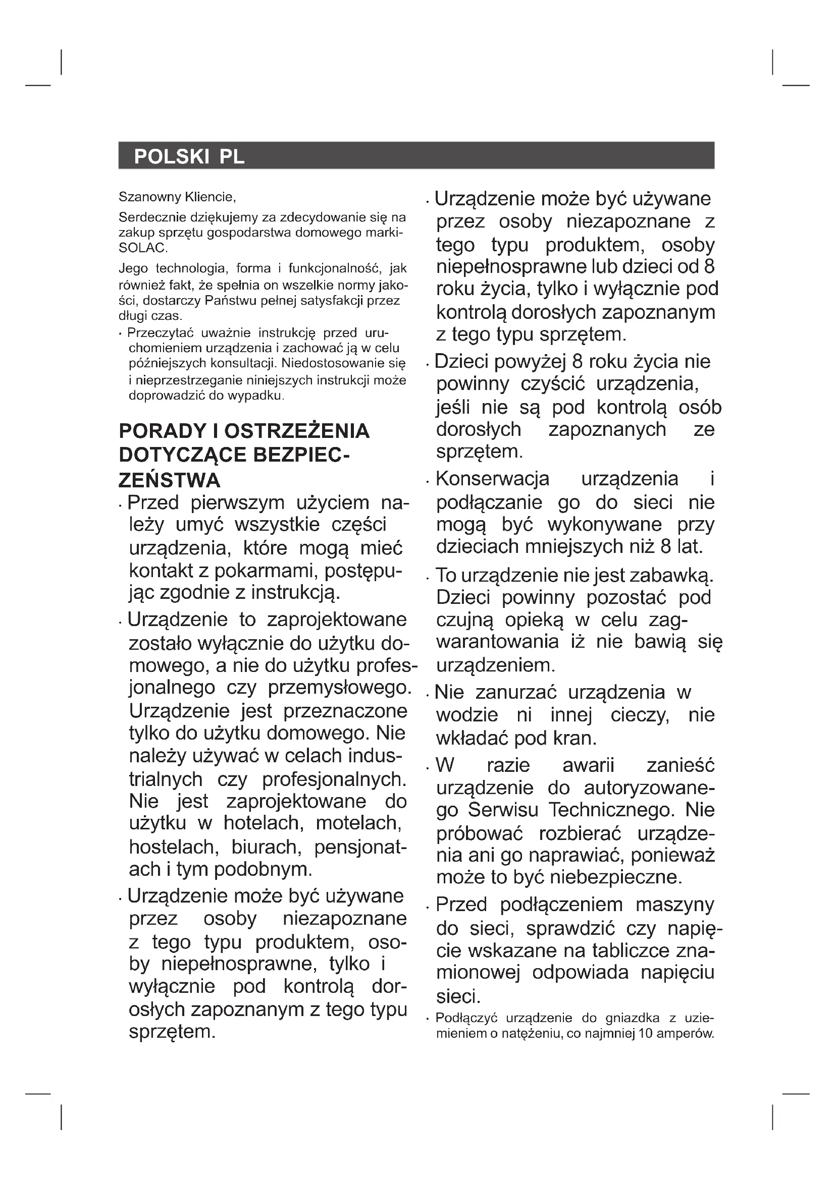 - Produkt nie zawiera koncentracji substancji, które mogłyby być uznane za szkodliwe dla środowiska. Symbol ten oznacza, że jeśli chcecie się Państwo pozbyć tego produktu po zakoń- czeniu okresu jego użytkowania, należy go przekazać przy zastosowaniu określonych środków do autoryzowanego podmiotu zarzą- dzającego odpadami w celu przeprowadzenia selektywnej zbiórki Odpadów Urządzeń Elek- trycznych i Elektronicznych (WEEE). Nieprawidłowości Możliwe przyczyny Rozwiązanie -Wypływa woda z boku pojemnika na ltry. -Filtr nie jest włożony prawidłowo. -Brzeg kosza ltra jest pokryty kawą. -Zespół dystrybutora jest zabrudzony. - Zobacz rozdział “Uzyskiwanie kawy” - Wyczyścić brzegi kosza ltra oraz dystrybutor kawy. - Wyczyścić wilgotną szmatką. -Kawa nie wypływa - Nie ma wody. -Pojemnik na wodę nie jest prawidłowo zamontowany. -Otwory kosza ltra są zatkane, kawa zbyt drobno zmielona lub została zbyt mocno przyciśnięta. - Napełnić pojemnik na wodę. - Upewnić się, że pojemnik jest prawidłowo zamontowany, naciskając na jego górną część. - Opróżnić kosz ltra i umyć go wodą. Wyczyścić zespół dystrybu- tora wilgotną szmatką. Ponownie napełnić kosz ltra i przycisnąć lekko kawę. -Kawa wypływa powoli lub kropla po kropli. - Kawa jest zbyt mocno zmielona lub zbyt mocno ściśnięta. - Upewnić się, że grubość zmielenia jest odpowiednia i, że nie została zbyt mocno ściśnięta.. -Kawa wypływa bez piany -Kawa, która została użyta jest przetermi- nowana lub wyschła. -Kawa nie została odpowiednio ściśnięta. -Kawa jest zbyt grubo zmielona. -Używać świeżej kawy i po otwarciu przechowywać w zamknię- tym pojemniku. -Dobrze ścisnąć (ubić) kawę. -Zmielić drobniej kawę. -Kawa wypływa zbyt szybko -Kawa zbyt grubo zmielona. -Kosz ltra nie zostało odpowiednio napełniony. -Kawa nie została odpowiednio ściśnięta. -Zmielić drobniej kawę. Upewnić się, że kosz ltra został napełniony odpowiednią ilością kawy. -Bardziej ścisnąć (ubić) kawę. -Nie wydobywa się para przez rurkę parownika -Rurka jest zatkana Wyczyścić rurkę parownika wilgotną szmatką, aby usunąć resztki zaschłego mleka i udrożnić otwory za pomocą igły. Naciśnij odpowiedni przełącznik i wypuść parę, aż wyjdzie z siłą i w sposób ciągły.SLOVENSKÝ SK Vážený zákazník, Ďakujeme vám, že ste sa rozhodli zakúpiť si ten- to výrobok značky SOLAC. Technológia, dizajn a účelnosť tohto výrobku spolu so skutočnosťou, že prešiel najprísnejšími skúškami akosti, vám prinesie dlhodobú spokoj- nosť a umožní vám objaviť potešenie z vychut- návania si autentickej espresso kávy.