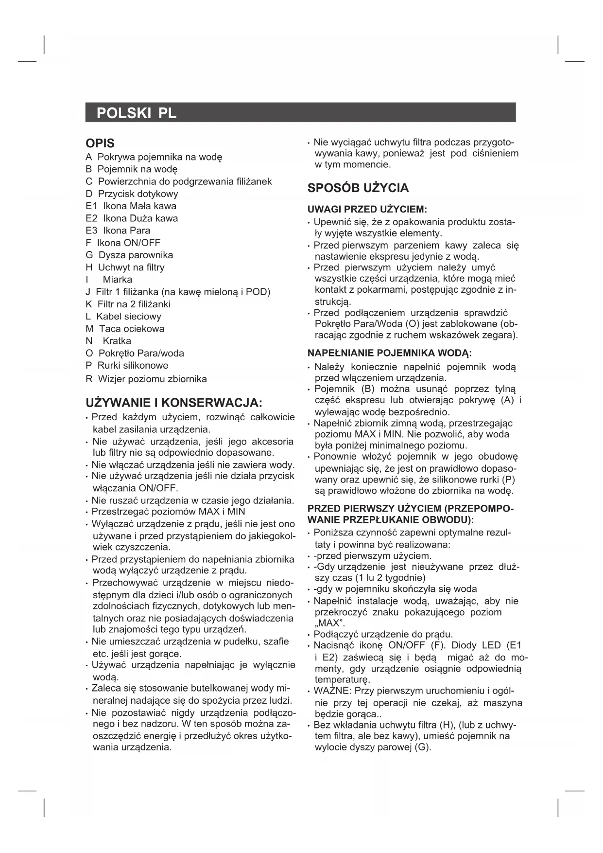 - Při odvápňování tohoto spotřebiče se nedopo- ručují domácí řešení. CSPOLSKI PL OPIS A Pokrywa pojemnika na wodę B Pojemnik na wodę C Powierzchnia do podgrzewania liżanek D Przycisk dotykowy E1 Ikona Mała kawa E2 Ikona Duża kawa E3 Ikona Para F Ikona ON/OFF G Dysza parownika H Uchwyt na ltry I Miarka J Filtr 1 liżanka (na kawę mieloną i POD) K Filtr na 2 liżanki L Kabel sieciowy M Taca ociekowa N Kratka O Pokrętło Para/woda P Rurki silikonowe R Wizjer poziomu zbiornika UŻYWANIE I KONSERWACJA: