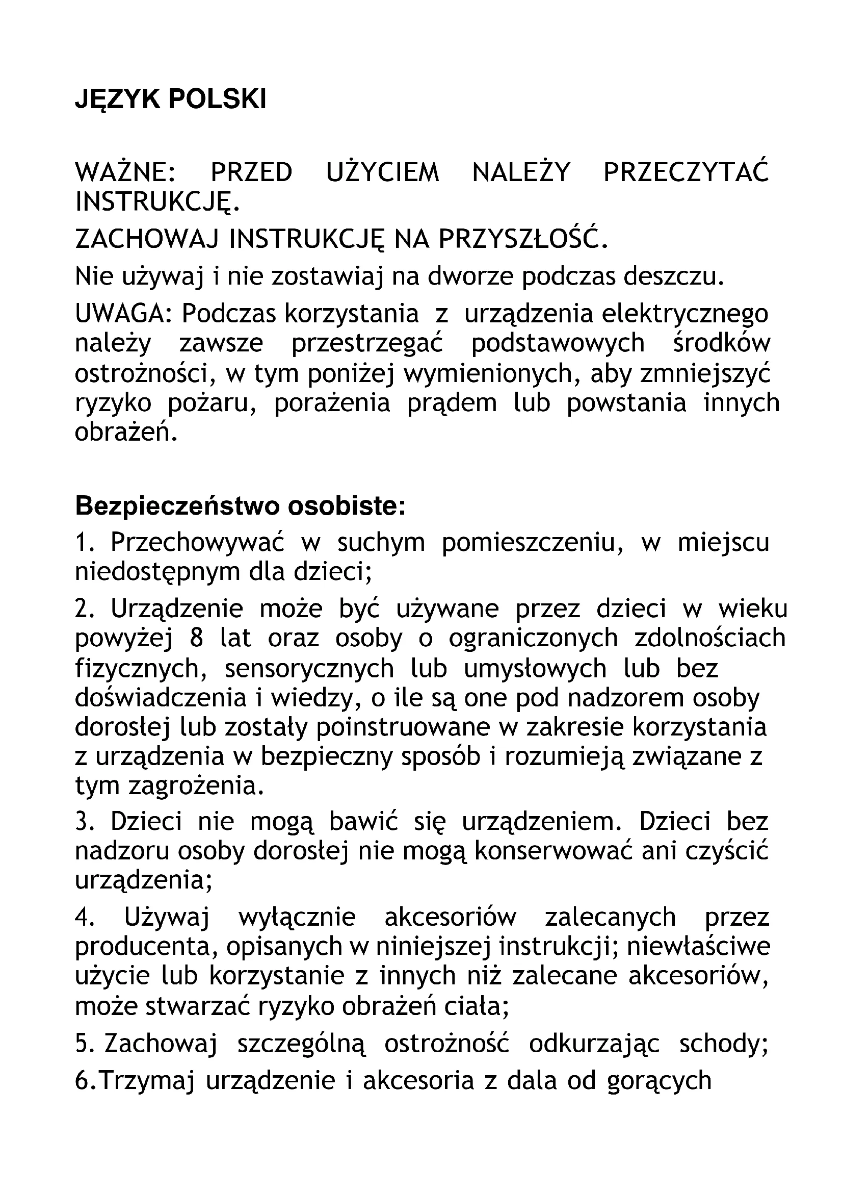 Podczas korzystania ze sprzętu elektrycznego należy zawsze zachowywać szczególną ostrożność w celu zapobieżenia ryzyku pożaru, porażenia prądem i/lub obrażeniom spowodowanym niewłaściwym używaniem urządzenia. Prosimy o zachowanie instrukcji i przekazanie go każdorazowemu właścicielowi urządzenia. Środki ostrożności dotyczące urządzeń elektrycznych: