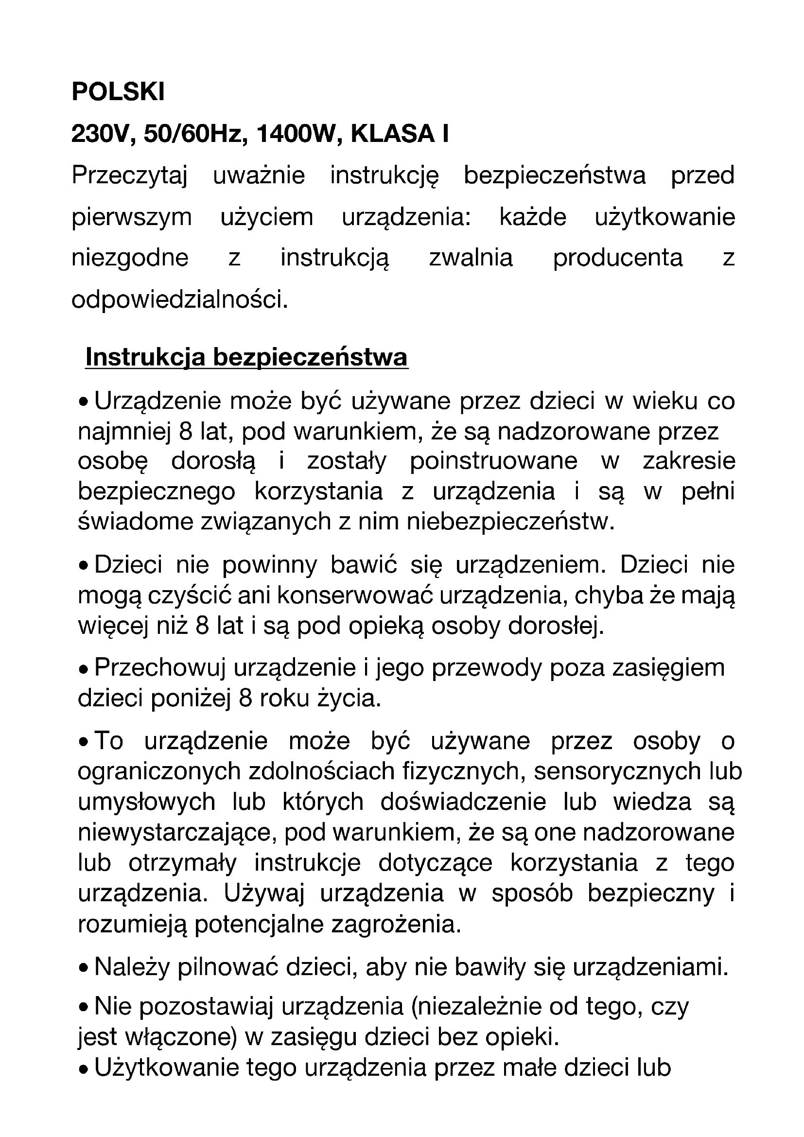 V2POLSKI 230V, 50/60Hz, 1400W, KLASA I Przeczytaj uważnie instrukcję bezpieczeństwa przed pierwszym użyciem urządzenia: każde użytkowanie niezgodne z instrukcją zwalnia producenta z odpowiedzialności. Instrukcja bezpieczeństwa