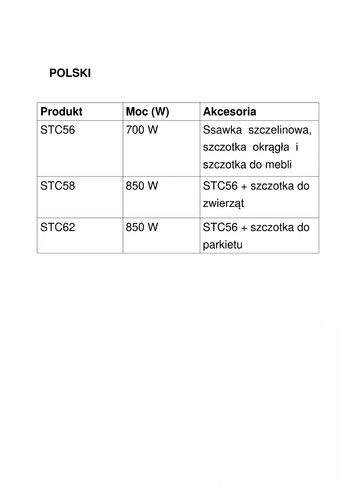 Produkt Moc (W) Akcesoria STC56 700 W Ssawka szczelinowa, szczotka okrągła i szczotka do mebli STC58 850 W STC56 + szczotka do zwierząt STC62 850 W STC56 + szczotka do parkietuKOMPONENTY URZĄDZENIA