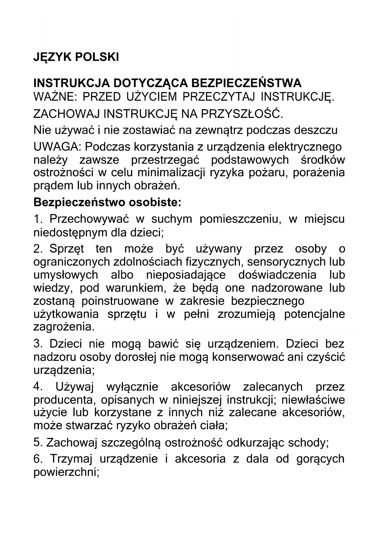 WAŻNE: PRZED UŻYCIEM PRZECZYTAJ INSTRUKCJĘ. ZACHOWAJ INSTRUKCJĘ NA PRZYSZŁOŚĆ. Nie używać i nie zostawiać na zewnątrz podczas deszczu UWAGA: Podczas korzystania z urządzenia elektrycznego należy zawsze przestrzegać podstawowych środków ostrożności w celu minimalizacji ryzyka pożaru, porażenia prądem lub innych obrażeń. Bezpieczeństwo osobiste: