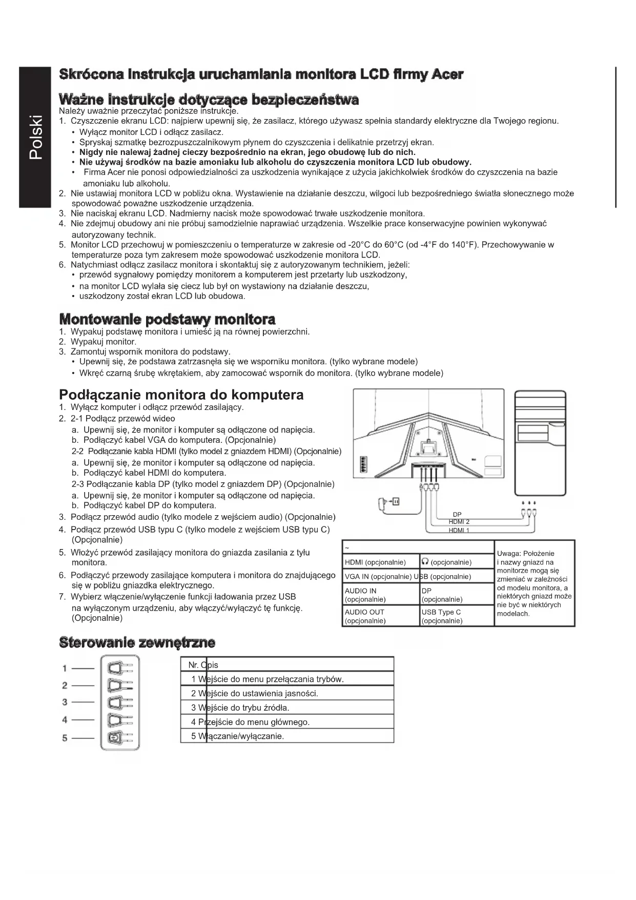 (opcjonalnie) AUDIO OUT (opcjonalnie) USB Type C (opcjonalnie) Sterowanie zewnętrzne Nr. Opis 1 Wejście do menu przełączania trybów. 2 Wejście do ustawienia jasności. 3 Wejście do trybu źródła. 4 Przejście do menu głównego. 5 Włączanie/wyłączanie.Polski Deklaracje wymagane przez organy nadzoru i dotyczące bezpieczeństwa Deklaracja FCC To urządzenie przeszło odpowiednie testy potwierdzające jego zgodność z limitami dla urządzeń cyfrowych klasy B określonymi w Części 15 Zasad FCC. Limity te określono w celu zapewnienia dostatecznej ochrony przed szkodliwymi zakłóceniami w warunkach mieszkalnych. To urządzenie generuje, wykorzystuje i może emitować energię o częstotliwości radiowej, a jeśli nie zostanie zainstalowane i nie będzie używane zgodnie z instrukcjami, może powodować zakłócenia w komunikacji radiowej. Nie ma jednak pewności, że w danych warunkach nie wystąpią zakłócenia. Jeśli urządzenie powoduje zakłócenia w odbiorze sygnału radiowego lub telewizyjnego (co można stwierdzić przez włączenie i wyłączenie urządzenia), zaleca się zastosowanie jednej lub więcej poniższych metod w celu wyeliminowania zakłóceń: