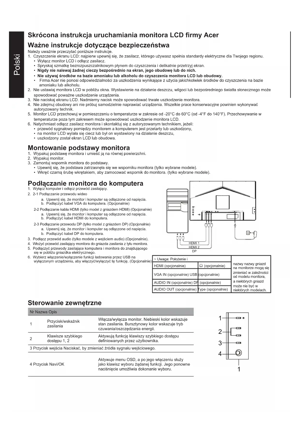 Pobór mocy Tryb włączenia 20 W (typowy) Tryb uśpienia 0,5 W (typowy) Tryb wyłączenia 0,3 W (typowy) Złącze wejściowe DP (tylko model z wejściem DP) HDMI ×2 (tylko model z wejściem HDMI) Sygnał wejścia video DP (tylko model z wejściem DP) HDMI ×2 (tylko model z wejściem HDMI) Głośniki 2 W × 2 USB USB 3.0 × 4 (ocjonalnie) Maksymalny rozmiar ekranu W poziomie: 597 mm W pionie: 336 mm Źródło zasilania WEJŚCIE: 100-240 V~ 50/60 Hz Warunki otoczenia Temp. działania: 0° do 40°C Temp. przechowywania: -20° do 60°C Wilgotność podczas pracy: 20% do 80% Wymiary 610,5 (szer.) × 406-556 (wys.) × 247 (głęb.) mm Masa (netto) 6,4 kg (netto) Dane techniczne mechanizmu Nachylanie: -5° do +35° Obracanie: ±60° Regulacja wysokości: 150 mm Przekręcanie: Nie Odłączane nóżki podstawy: Tak Zewnętrzne elementy sterowania Przełącznik/przyciski Przycisk Zasilanie Klawisz szybkiego dostępu 1 Klawisz szybkiego dostępu 2 Wejście Menu/Navi/OK Funkcje Jasność Kontrast Nieb. świat. Wzmocn. czerni ACM Super ostrość Gamma Temp. koloru Tryby Tryb sRGB Tryb odc. szar. 6-osiowa barwa Nasyc. 6-osiow Głośność Wyciszenie Over Drive Adaptive-Sync Częst. odśwież. Język Wyłączenie OSD Przezroczystość Blokada OSD Wejście Auto źródło Tryb szeroki Przypis. przyc. skrótu DDC/CI Poz. czarn. HDMI Tryb szyb. uruch Ładowania przez USB po rozładowaniu Informacje Dane techniczne zależą od modelu i/lub regionu. Podręczniki i inne dokumenty dla produktu Acer, można znaleźć na oficjalnej stronie internetowej pomocy technicznej Acer.Português Manual de início rápido (QSG) do monitor LCD da Acer Instruções de segurança importantes Leia atentamente as instruções que se seguem. 1. Limpar o ecrã do monitor LCD: primeiro, verificar se o adaptador de corrente que está a usar corresponde às normas elétricas da sua região.