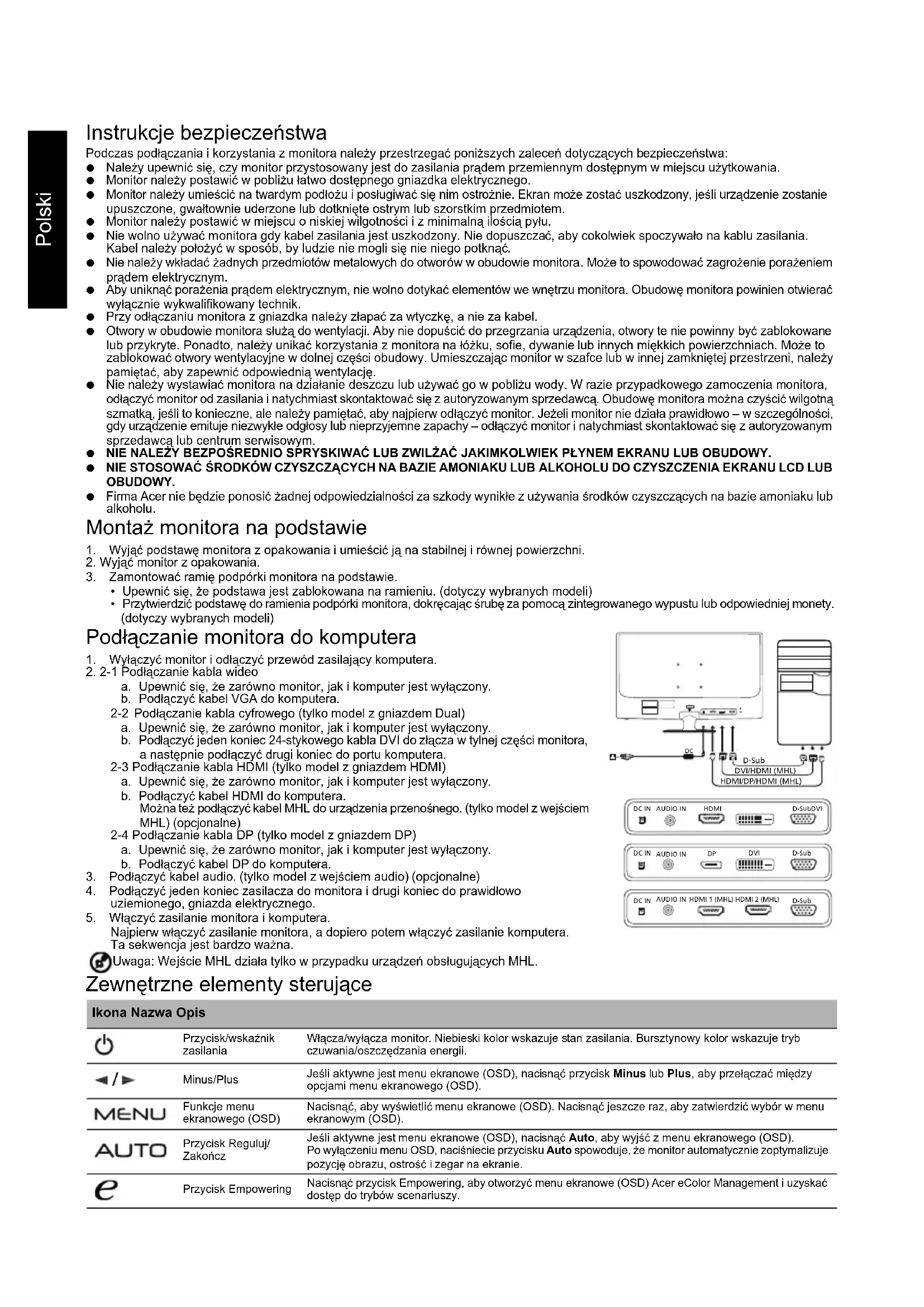(Warm) Kleur (Koel) Kleur RGB-kleurtemp. Taal OSD-positie Time-out OSD Autom.configuratie (alleen analoog model) Breedbeeldmodus (Volledig/Aspect) ACM Aan/Uit Selectie ingangssignaal (alleen dual-model) DDC/CI Aan/Uit Scherminformatie Opn.instellen Afsluiten Alle specificaties kunnen zonder voorafgaande kennisgeving worden gewijzigd.Polski Instrukcje bezpieczeństwa Podczas podłączania i korzystania z monitora należy przestrzegać poniższych zaleceń dotyczących bezpieczeństwa: Należy upewnić się, czy monitor przystosowany jest do zasilania prądem przemiennym dostępnym w miejscu użytkowania. Monitor należy postawić w pobliżu łatwo dostępnego gniazdka elektrycznego. Monitor należy umieścić na twardym podłożu i posługiwać się nim ostrożnie. Ekran może zostać uszkodzony, jeśli urządzenie zostanie upuszczone, gwałtownie uderzone lub dotknięte ostrym lub szorstkim przedmiotem. Monitor należy postawić w miejscu o niskiej wilgotności i z minimalną ilością pyłu. Nie wolno używać monitora gdy kabel zasilania jest uszkodzony. Nie dopuszczać, aby cokolwiek spoczywało na kablu zasilania. Kabel należy położyć w sposób, by ludzie nie mogli się nie niego potknąć. Nie należy wkładać żadnych przedmiotów metalowych do otworów w obudowie monitora. Może to spowodować zagrożenie porażeniem prądem elektrycznym. Aby uniknąć porażenia prądem elektrycznym, nie wolno dotykać elementów we wnętrzu monitora. Obudowę monitora powinien otwierać wyłącznie wykwalifikowany technik. Przy odłączaniu monitora z gniazdka należy złapać za wtyczkę, a nie za kabel. Otwory w obudowie monitora służą do wentylacji. Aby nie dopuścić do przegrzania urządzenia, otwory te nie powinny być zablokowane lub przykryte. Ponadto, należy unikać korzystania z monitora na łóżku, sofie, dywanie lub innych miękkich powierzchniach. Może to zablokować otwory wentylacyjne w dolnej części obudowy. Umieszczając monitor w szafce lub w innej zamkniętej przestrzeni, należy pamiętać, aby zapewnić odpowiednią wentylację. Nie należy wystawiać monitora na działanie deszczu lub używać go w pobliżu wody. W razie przypadkowego zamoczenia monitora, odłączyć monitor od zasilania i natychmiast skontaktować się z autoryzowanym sprzedawcą. Obudowę monitora można czyścić wilgotną szmatką, jeśli to konieczne, ale należy pamiętać, aby najpierw odłączyć monitor. Jeżeli monitor nie działa prawidłowo – w szczególności, gdy urządzenie emituje niezwykłe odgłosy lub nieprzyjemne zapachy – odłączyć monitor i natychmiast skontaktować się z autoryzowanym sprzedawcą lub centrum serwisowym. NIE NALEŻY BEZPOŚREDNIO SPRYSKIWAĆ LUB ZWILŻAĆ JAKIMKOLWIEK PŁYNEM EKRANU LUB OBUDOWY. NIE STOSOWAĆ ŚRODKÓW CZYSZCZĄCYCH NA BAZIE AMONIAKU LUB ALKOHOLU DO CZYSZCZENIA EKRANU LCD LUB OBUDOWY. Firma Acer nie będzie ponosić żadnej odpowiedzialności za szkody wynikłe z używania środków czyszczących na bazie amoniaku lub alkoholu. Montaż monitora na podstawie