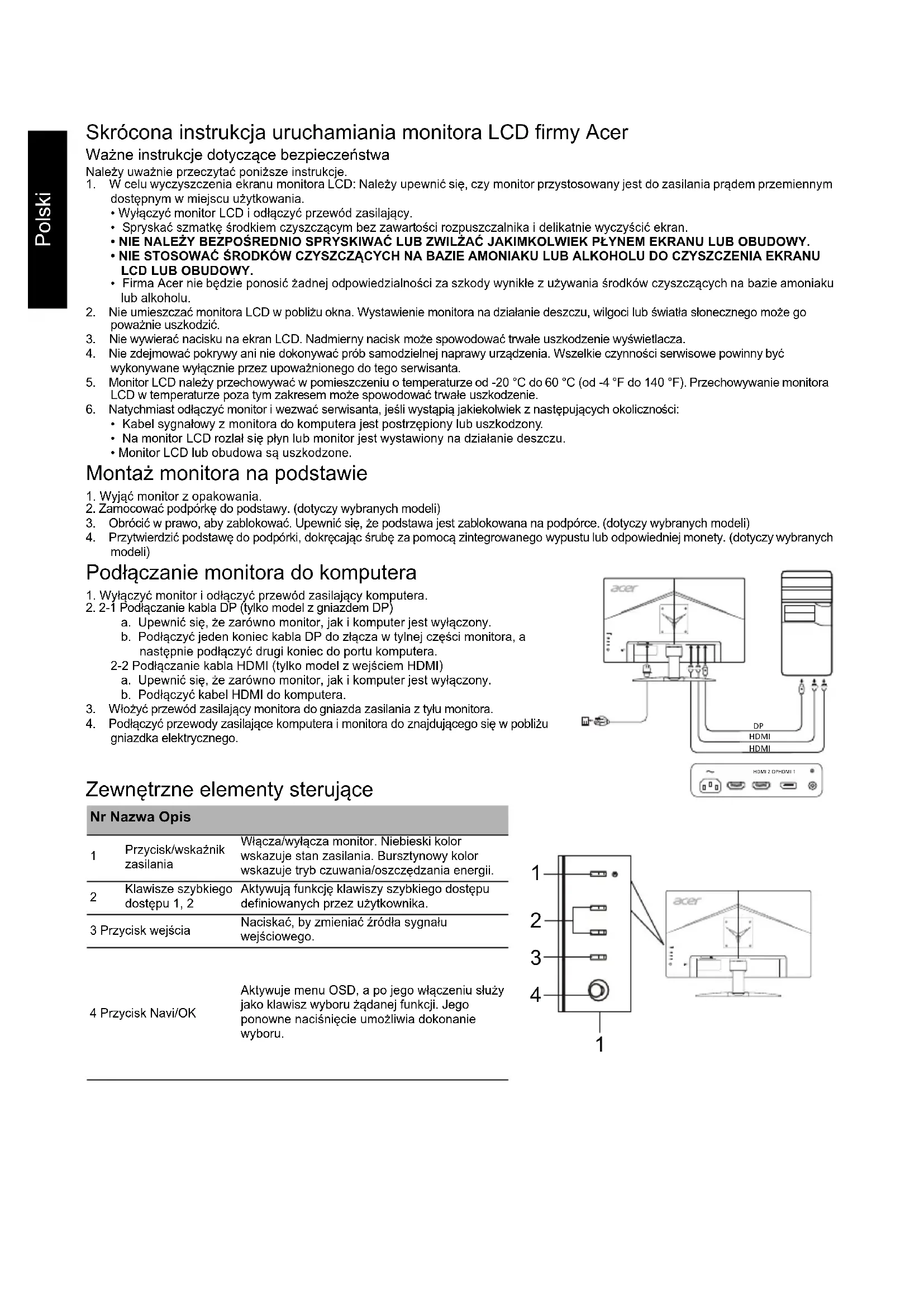 (typowa) Kontrast Maks. 100000000:1 (ACM) Kąt widzenia 178° (w poziomie) 178° (w pionie) (CR=10) Czas reakcji 1 ms (VRB) Typ panelu In-plane switching (IPS) Częstotliwość pozioma HDMI: 30 - 112 KHz DP: 112 - 112 KHz Częstotliwość pionowa HDMI: 56 - 76 Hz DP: 48 - 75 Hz Wyświetlane kolory 16,7 miliona Zegar punktowy 298,47 MHz Maksymalna rozdzielczość 2560 x 1440 przy częstotliwości 75 Hz Plug & Play VESA DDCCI/DDC2B Pobór mocy (przy 200 nitach) Tryb włączenia 24 W (typowy) Tryb uśpienia 0,35 W (typowy) Tryb wyłączenia 0,3 W (typowy) Złącze wejściowe HDMI (tylko model z wejściem HDMI) DP (tylko model z wejściem DP) Wejściowy sygnał wideo HDMI (tylko model z wejściem HDMI) (opcjonalne) DP (tylko model z wejściem DP) (opcjonalne) Głośniki 2 W x 2 (opcjonalne) Maksymalny rozmiar ekranu W poziomie: 596,74 mm W pionie: 335,66 mm Źródło zasilania 100–240 V, 50/60 Hz Kwestie środowiskowe Temperatura pracy: Od 0° do 40°C Temperatura przechowywania: Od -20° do 60°C Wilgotność otoczenia podczas pracy: Od 20% do 80% Wymiary 614 (szer.) × 454,02 (wys.) × 231,08 (głęb.) mm Waga: 5,06 kg (netto) Specyfikacje mechanizmów Pochylenie: Od -5° do +15° Obrót: Nie Regulacja wysokości: Nie Obrót w pionie: Nie Zdejmowalna podpórka: Tak Zewnętrzne elementy sterujące Przełącznik/przyciski Przycisk zasilania Klawisz szybkiego dostępu 1 Klawisz szybkiego dostępu 2 Wejście Menu/Navi/OK Funkcje Jasność Kontrast Nieb. światło Wzmocn. czerni Włączenie/wyłączenie ACM Super ostrość Gamma Temp. koloru Tryby sRGB Tryb odc. szar. 6-osiowa barwa Nasyc. 6-osiow Głośność Wyciszenie Over Drive FreeSync VRB Cel Język Wyłączenie OSD Przezroczystość Częst. odśwież. Blokada OSD Wejście Autom. źródło Format DP Przypis. przyc. skrótu Tryb szeroki Włączenie/wyłączenie DDC/CI Poz. czarn. HDMI Tryb szyb. uruch Wyświetlanie informacji Resetuj wszyst. ustaw. Zakończ Dane techniczne zależą od modelu i/lub regionu.Português Manual de início rápido (QSG) do monitor LCD da Acer Instruções de segurança importantes Leia atentamente as instruções que se seguem. 1. Para limpar o ecrã do monitor LCD: certifique-se de que o monitor tem a potência elétrica necessária para funcionar com a alimentação de CA disponível na sua localização.