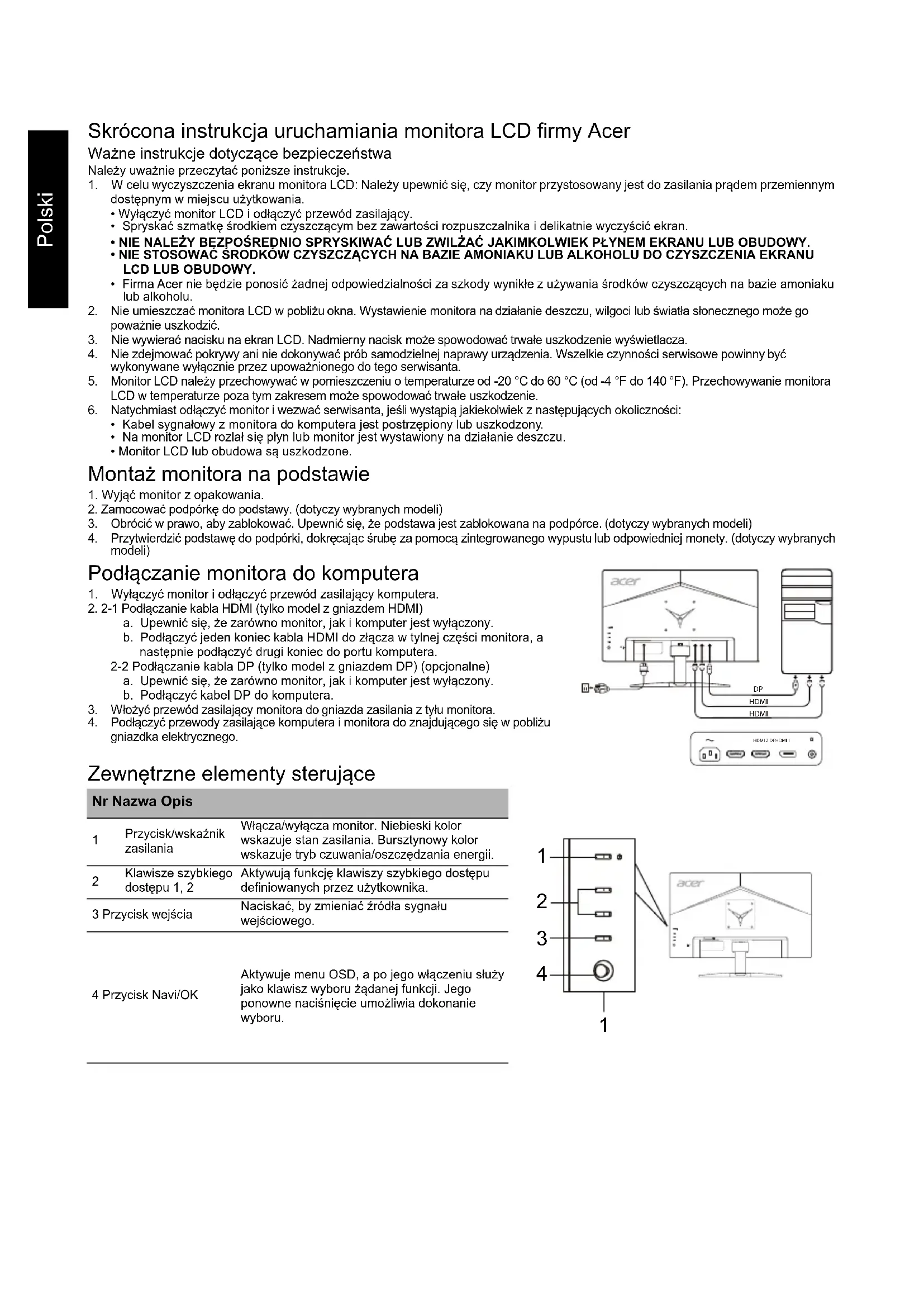 (typowa) Kontrast Maks. 100000000:1 (ACM) Kąt widzenia 178° (w poziomie) 178° (w pionie) (CR=10) Czas reakcji 1 ms (VRB) Typ panelu In-plane switching (IPS) Częstotliwość pozioma 31 - 292 kHz Częstotliwość pionowa 56 - 240 Hz Wyświetlane kolory 16,7 miliona Zegar punktowy 600 MHz Maksymalna rozdzielczość 1920 x 1080 przy częstotliwości 240 Hz Plug & Play VESA DDCCI/DDC2B Pobór mocy Tryb włączenia 23 W Tryb uśpienia 0,5 W Tryb wyłączenia 0,3 W Złącze wejściowe HDMI (tylko model z wejściem HDMI) DP (tylko model z wejściem DP) Wejściowy sygnał wideo HDMI (tylko model z wejściem HDMI) (opcjonalne) DP (tylko model z wejściem DP) (opcjonalne) Głośniki 2 W x 2 (tylko model z wejściem audio) (opcjonalne) Maksymalny rozmiar ekranu W poziomie: 543,744 mm W pionie: 302,616 mm Źródło zasilania 100–240 V, 50/60 Hz Kwestie środowiskowe Temperatura pracy: Od 0° do 40°C Temperatura przechowywania: Od -20° do 60°C Wilgotność otoczenia podczas pracy: Od 20% do 80% Wymiary 557,79 (szer.) × 419,61 (wys.) × 231,75 (głęb.) mm Waga: 4,34 kg (netto) Specyfikacje mechanizmów Pochylenie: Od -5° do +15° Obrót: Nie Regulacja wysokości: Nie Obrót w pionie: Nie Zdejmowalna podpórka: Tak Zewnętrzne elementy sterujące Przełącznik/przyciski Przycisk zasilania Klawisz szybkiego dostępu 1 Klawisz szybkiego dostępu 2 Wejście Menu/Navi/OK Funkcje Jasność Kontrast Nieb. światło Wzmocn. czerni ACM HDR Super ostrość Gamma Temp. koloru Tryby Przestrz. kolor. Tryb odc. szar. 6-osiowa barwa Nasyc. 6-osiow Głośność Wyciszenie Over Drive FreeSync Premium Częst. odśwież. VRB Bardzo małe opóźnienie Cel Język Wyłączenie OSD Przezroczystość Blokada OSD Wejście Autom. źródło Format DP Przypis. przyc. skrótu Tryb szeroki DDC/CI Poz. czarn. HDMI Tryb szyb. uruch Wyświetlanie informacji Resetuj wszyst. ustaw. Zakończ Dane techniczne zależą od modelu i/lub regionu.Português Manual de início rápido (QSG) do monitor LCD da Acer Instruções de segurança importantes Leia atentamente as instruções que se seguem. 1. Para limpar o ecrã do monitor LCD: certifique-se de que o monitor tem a potência elétrica necessária para funcionar com a alimentação de CA disponível na sua localização.