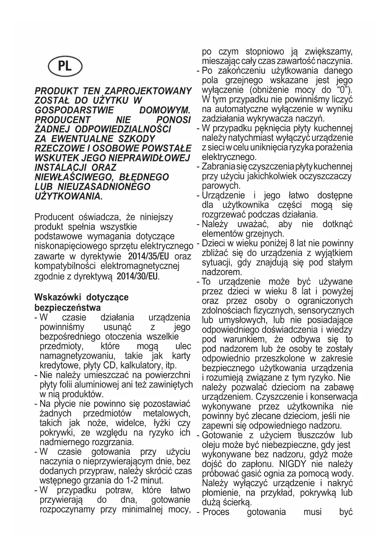 Wskazówki dotyczące bezpieczeństwa - W czasie działania urządzenia powinniśmy usunąć z jego bezpośredniego otoczenia wszelkie przedmioty, które mogą ulec namagnetyzowaniu, takie jak karty kredytowe, płyty CD, kalkulatory, itp. - Nie należy umieszczać na powierzchni płyty folii aluminiowej ani też zawiniętych w nią produktów. - Na płycie nie powinno się pozostawiać żadnych przedmiotów metalowych, takich jak noże, widelce, łyżki czy pokrywki, ze względu na ryzyko ich nadmiernego rozgrzania. - W czasie gotowania przy użyciu naczynia o nieprzywierającym dnie, bez dodanych przypraw, należy skrócić czas wstępnego grzania do 1-2 minut. - W przypadku potraw, które łatwo przywierają do dna, gotowanie rozpoczynamy przy minimalnej mocy, po czym stopniowo ją zwiększamy, mieszając cały czas zawartość naczynia. - Po zakończeniu użytkowania danego pola grzejnego wskazane jest jego wyłączenie (obniżenie mocy do “0”). W tym przypadku nie powinniśmy liczyć na automatyczne wyłączenie w wyniku zadziałania wykrywacza naczyń. - W przypadku pęknięcia płyty kuchennej należy natychmiast wyłączyć urządzenie z sieci w celu uniknięcia ryzyka porażenia elektrycznego. - Zabrania się czyszczenia płyty kuchennej przy użyciu jakichkolwiek oczyszczaczy parowych. - Urządzenie i jego łatwo dostępne dla użytkownika części mogą się rozgrzewać podczas działania. - Należy uważać, aby nie dotknąć elementów grzejnych. - Dzieci w wieku poniżej 8 lat nie powinny zbliżać się do urządzenia z wyjątkiem sytuacji, gdy znajdują się pod stałym nadzorem. - To urządzenie może być używane przez dzieci w wieku 8 lat i powyżej oraz przez osoby o ograniczonych zdolnościach zycznych, sensorycznych lub umysłowych, lub nie posiadające odpowiedniego doświadczenia i wiedzy pod warunkiem, że odbywa się to pod nadzorem lub że osoby te zostały odpowiednio przeszkolone w zakresie bezpiecznego użytkowania urządzenia i rozumieją związane z tym ryzyko. Nie należy pozwalać dzieciom na zabawę urządzeniem. Czyszczenie i konserwacja wykonywane przez użytkownika nie powinny być zlecane dzieciom, jeśli nie zapewni się odpowiedniego nadzoru. - Gotowanie z użyciem tłuszczów lub oleju może być niebezpieczne, gdy jest wykonywane bez nadzoru, gdyż może dojść do zapłonu. NIGDY nie należy próbować gasić ognia za pomocą wody. Należy wyłączyć urządzenie i nakryć płomienie, na przykład, pokrywką lub dużą ścierką. - Proces gotowania musi być PLnadzorowany. Krótki proces gotowania musi być nadzorowany nieustannie. - Gotowanie bez nadzoru na płycie grzejnej na tłuszczu lub oleju może być niebezpieczne oraz może spowodować pożar. - Ryzyko zapłonu: nie gromadzić przedmiotów na powierzchni służącej do gotowania. - Używać wyłącznie elementów zabez