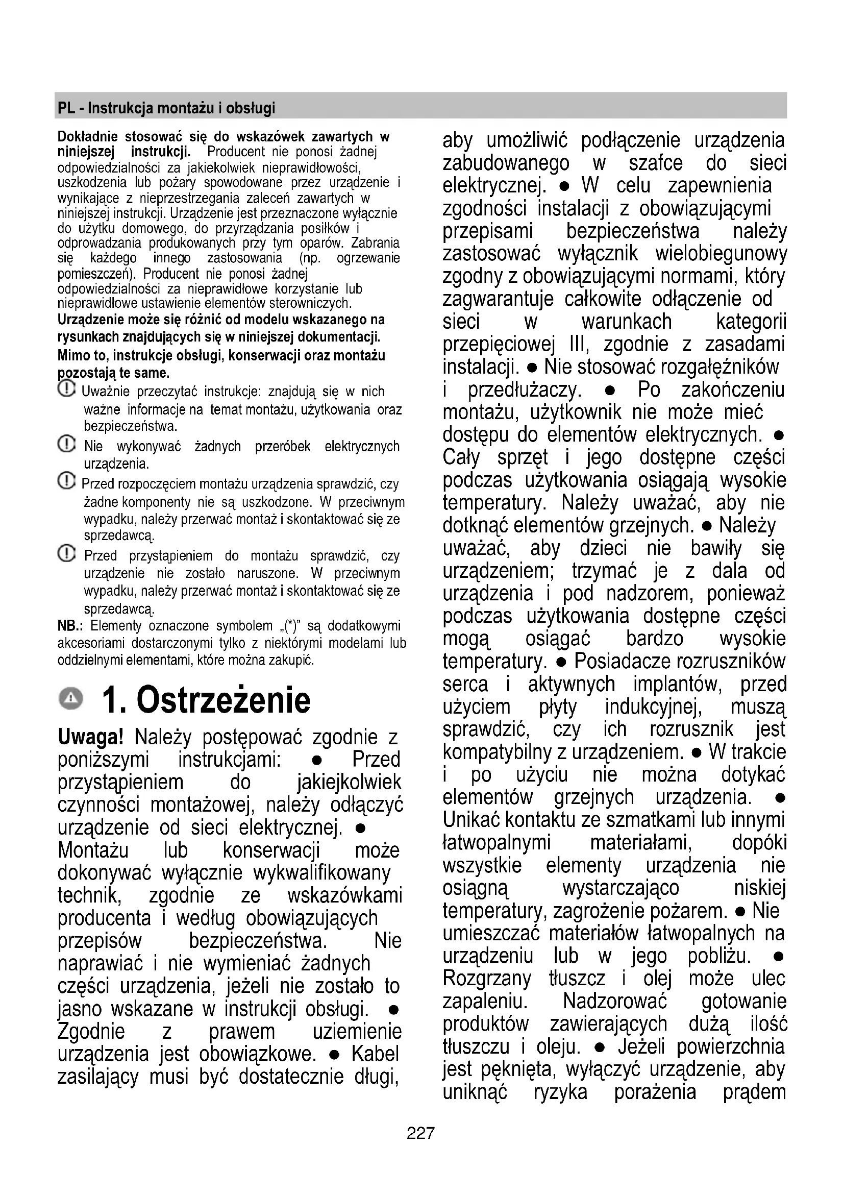 Hvis problemet efter de ovenfor anført eftersyn vedvarer, skal du kontakte din nærmeste serviceafdeling.227 PL - Instrukcja montażu i obsługi Dokładnie stosować się do wskazówek zawartych w niniejszej instrukcji. Producent nie ponosi żadnej odpowiedzialności za jakiekolwiek nieprawidłowości, uszkodzenia lub pożary spowodowane przez urządzenie i wynikające z nieprzestrzegania zaleceń zawartych w niniejszej instrukcji. Urządzenie jest przeznaczone wyłącznie do użytku domowego, do przyrządzania posiłków i odprowadzania produkowanych przy tym oparów. Zabrania się każdego innego zastosowania (np. ogrzewanie pomieszczeń). Producent nie ponosi żadnej odpowiedzialności za nieprawidłowe korzystanie lub nieprawidłowe ustawienie elementów sterowniczych. Urządzenie może się różnić od modelu wskazanego na rysunkach znajdujących się w niniejszej dokumentacji. Mimo to, instrukcje obsługi, konserwacji oraz montażu pozostają te same. Uważnie przeczytać instrukcje: znajdują się w nich ważne informacje na temat montażu, użytkowania oraz bezpieczeństwa. Nie wykonywać żadnych przeróbek elektrycznych urządzenia. Przed rozpoczęciem montażu urządzenia sprawdzić, czy żadne komponenty nie są uszkodzone. W przeciwnym wypadku, należy przerwać montaż i skontaktować się ze sprzedawcą. Przed przystąpieniem do montażu sprawdzić, czy urządzenie nie zostało naruszone. W przeciwnym wypadku, należy przerwać montaż i skontaktować się ze sprzedawcą. NB.: Elementy oznaczone symbolem „(*)” są dodatkowymi akcesoriami dostarczonymi tylko z niektórymi modelami lub oddzielnymi elementami, które można zakupić.