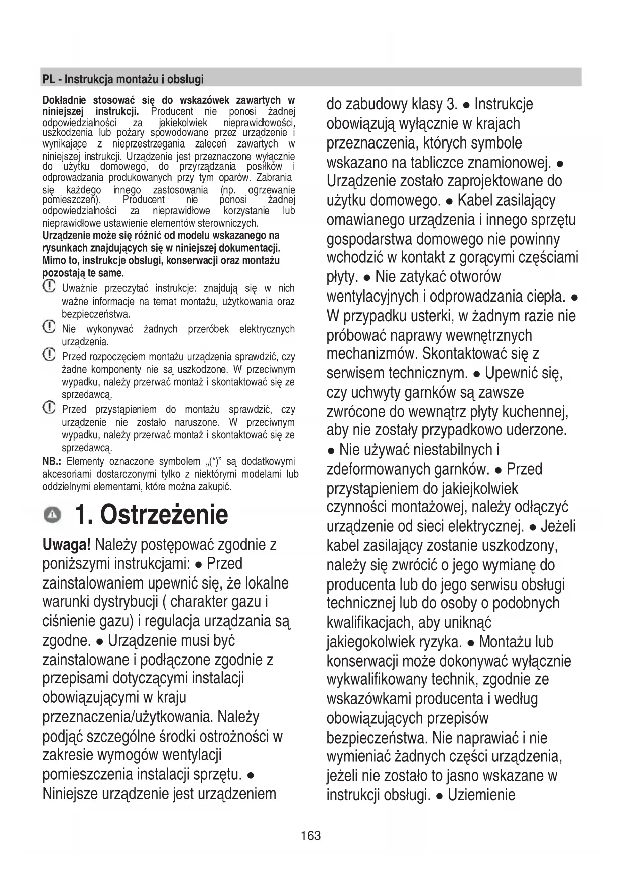 Uwaga! Należy postępować zgodnie z poniższymi instrukcjami: ● Przed zainstalowaniem upewnić się, że lokalne warunki dystrybucji ( charakter gazu i ciśnienie gazu) i regulacja urządzania są zgodne. ● Urządzenie musi być zainstalowane i podłączone zgodnie z przepisami dotyczącymi instalacji obowiązującymi w kraju przeznaczenia/użytkowania. Należy podjąć szczególne środki ostrożności w zakresie wymogów wentylacji pomieszczenia instalacji sprzętu. ● Niniejsze urządzenie jest urządzeniem do zabudowy klasy 3. ● Instrukcje obowiązują wyłącznie w krajach przeznaczenia, których symbole wskazano na tabliczce znamionowej. ● Urządzenie zostało zaprojektowane do użytku domowego. ● Kabel zasilający omawianego urządzenia i innego sprzętu gospodarstwa domowego nie powinny wchodzić w kontakt z gorącymi częściami płyty. ● Nie zatykać otworów wentylacyjnych i odprowadzania ciepła. ● W przypadku usterki, w żadnym razie nie próbować naprawy wewnętrznych mechanizmów. Skontaktować się z serwisem technicznym. ● Upewnić się, czy uchwyty garnków są zawsze zwrócone do wewnątrz płyty kuchennej, aby nie zostały przypadkowo uderzone. ● Nie używać niestabilnych i zdeformowanych garnków. ● Przed przystąpieniem do jakiejkolwiek czynności montażowej, należy odłączyć urządzenie od sieci elektrycznej. ● Jeżeli kabel zasilający zostanie uszkodzony, należy się zwrócić o jego wymianę do producenta lub do jego serwisu obsługi technicznej lub do osoby o podobnych kwalifikacjach, aby uniknąć jakiegokolwiek ryzyka. ● Montażu lub konserwacji może dokonywać wyłącznie wykwalifikowany technik, zgodnie ze wskazówkami producenta i według obowiązujących przepisów bezpieczeństwa. Nie naprawiać i nie wymieniać żadnych części urządzenia, jeżeli nie zostało to jasno wskazane w instrukcji obsługi. ● Uziemienie164 urządzenia jest obowiązkowe. ● Aby instalacja elektryczna była zgodna z obowiązującymi normami, należy zastosować wyłącznik wielobiegunowy zgodny z obowiązującymi normami, który zagwarantuje całkowite odłączenie od sieci w warunkach kategorii przepięciowej III, zgodnie z zasadami instalacji. ● Nie stosować rozgałęźników i przedłużaczy. ● Po zakończeniu montażu, użytkownik nie może mieć dostępu do elementów elektrycznych. ● Cały sprzęt i jego dostępne części są gorące podczas użytkowania. Należy uważać, aby nie dotknąć elementów grzejnych. ● Należy uważać, aby dzieci nie bawiły się urządzeniem; trzymać je z dala od urządzenia i pod nadzorem, ponieważ podczas użytkowania dostępne części mogą być gorące. ● W trakcie i po użyciu nie można dotykać elementów grzejnych urządzenia. ● Nie kłaść na urządzeniu ściereczek lub innych materiałów łatwopalnych, dopóki wszystkie jego elementy nie ostygną. ● Nie umieszczać materiałów łatwopalnych na urządzeniu lub w jego pobliżu. ● Rozgrzany tłuszcz i olej może ulec zapaleniu. Zwrócić szczególną uwagę podczas przyrządzania potraw bogatych w tłuszcz i olej. ● Jeżeli powierzchnia jest pęknięta, wyłączyć urządzenie, aby uniknąć ryzyka porażenia prądem elektrycznym. ● Urządzenie nie jest przeznaczone do uruchamiania za pomocą zewnętrznego regulatora czasowego lub oddzielnego systemu zdalnego sterowania. ● Proces gotowania powinien być nadzorowany. ● NIGDY nie próbować gasić płomienia wodą. Przeciwnie, wyłączyć urządzenie i zgasić ogień pokrywką lub kocem gaśniczym. Niebezpieczeństwo pożaru: nie kłaść przedmiotów na powierzchniach grzewczych. ● Nie używać urządzeń czyszczących parą. ● Przed podłączeniem do sieci elektrycznej: sprawdzić tabliczkę znamionową (umieszczoną na dolnej części urządzenia), aby upewnić się, że napięcie i moc są zgodne z wartościami sieci oraz, że gniazdko jest odpowiednie. W razie wątpliwości skontaktować się z wykwalifikowanym elektrykiem. Ważne: ● Po użyciu należy wyłączyć płytę kuchenną przy pomocy urządzenia sterowniczego. ● Aby uniknąć wycieku cieczy, zmniejszyć dopływ ciepłą. ● Nie pozostawiać włączonych elementów grzejnych, gdy na płycie znajdują się puste garnki lub patelnie lub, gdy płyta jest pusta. ● Po zakończeniu gotowania, wyłączyć daną strefę grzewczą. ● Nigdy nie pozostawiać pustych garnków na działających elementach grzejnych. ● Nie używać garnków wykraczających poza krawędzie płyty. ● UWAGA! W przypadku pęknięcia szklanej płyty: ● 1) natychmiast wyłączyć wszystkie palniki i odłączyć urządzenie od zasilania. ● 2) nie dotykać powierzchni urządzania. ● 3) nie używać urządzenia. ● UWAGA! Użytkowanie płyty gazowej powoduje wytwarzanie ciepła, wilgoci i produktów spalania w pomieszczeniu, w którym jest ona zainstalowana. Upewnić się, że pomieszczenie jest dobrze wentylowane, zwłaszcza podczas użytkowania165 urządzenia. Utrzymywać otwarte otwory wentylacyjne lub zainstalować mechaniczne urządzenie wentylacyjne.