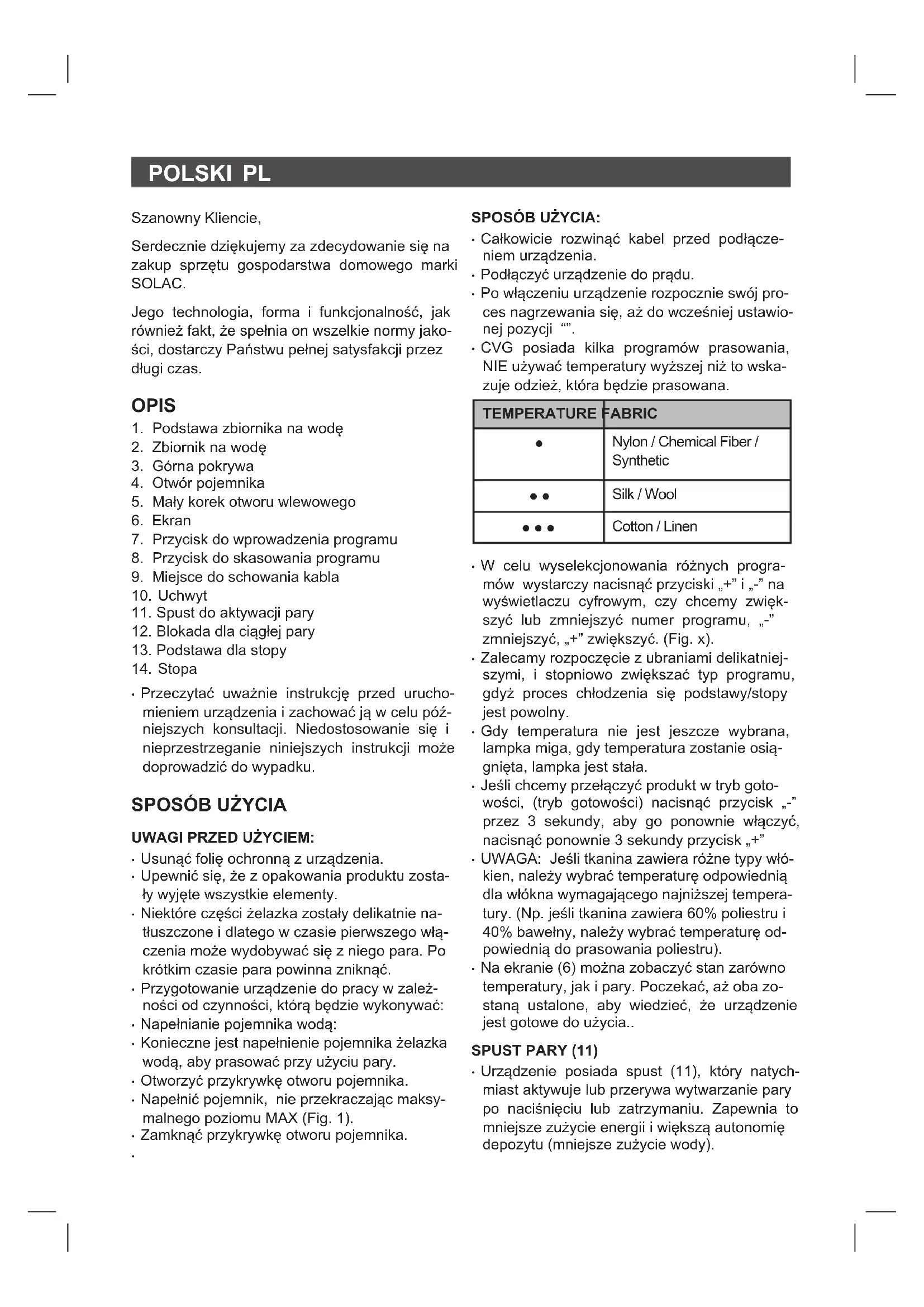 Yosemite Ceramic PC1510 - żelazko SOLAC - Bezpłatna instrukcja obsługi
