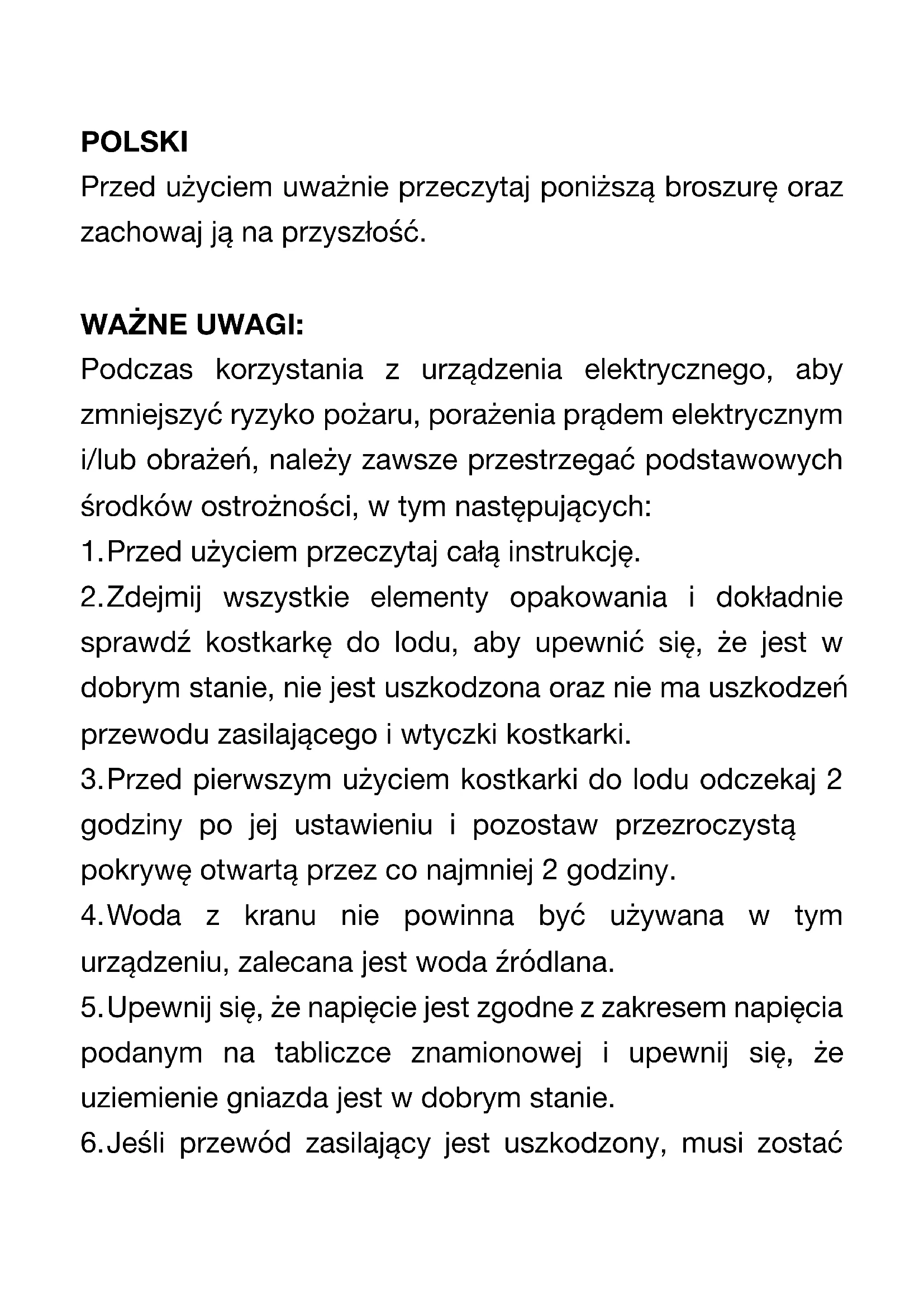 2.Zdejmij wzystkie elementy opakowania i dokadnie sprawdź kostenkäre do lodu, aby upewnić są, ze jest w dobrym stanie, nie jest uszkodzona oraz nie ma uszkodzen przyzewodu zasilajść o wtyczki kostenkär. - Przed pierwszym użyciem kostenkari do lodu odczekaj 2 godziny po jej ustawieniu i pozostaw przyezroczysta pewy otwartą przyez co najmiej 2 godziny.