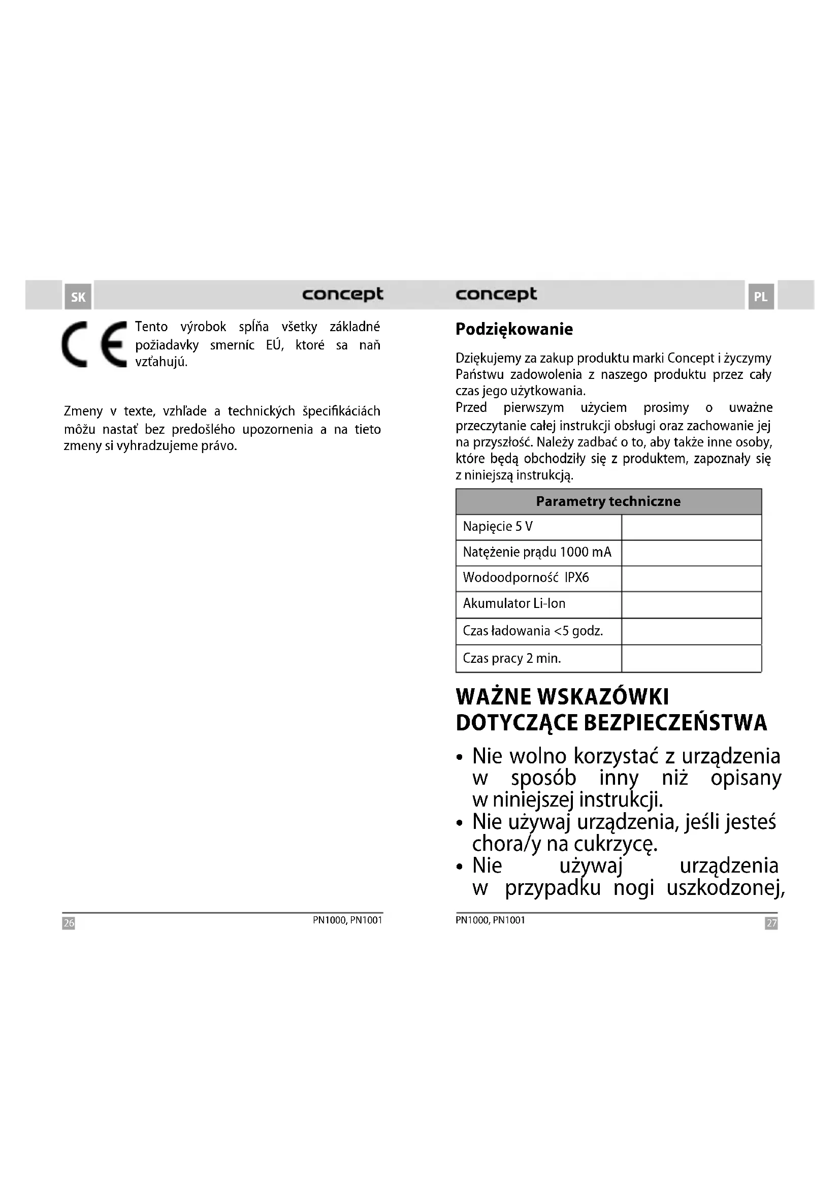Tento výrobok spĺňa všetky základné požiadavky smerníc EÚ, ktoré sa naň vzťahujú. Zmeny v texte, vzhľade a technických špecifikáciách môžu nastať bez predošlého upozornenia a na tieto zmeny si vyhradzujeme právo. Podziękowanie Dziękujemy za zakup produktu marki Concept iżyczymy Państwu zadowolenia z naszego produktu przez cały czas jego użytkowania. Przed pierwszym użyciem prosimy o uważne przeczytanie całej instrukcji obsługi oraz zachowanie jej na przyszłość. Należy zadbać o to, aby także inne osoby, które będą obchodziły się z produktem, zapoznały się zniniejszą instrukcją. Parametry techniczne Napięcie 5 V Natężenie prądu 1000 mA Wodoodporność IPX6 Akumulator Li-Ion Czas ładowania <5 godz. Czas pracy 2 min.