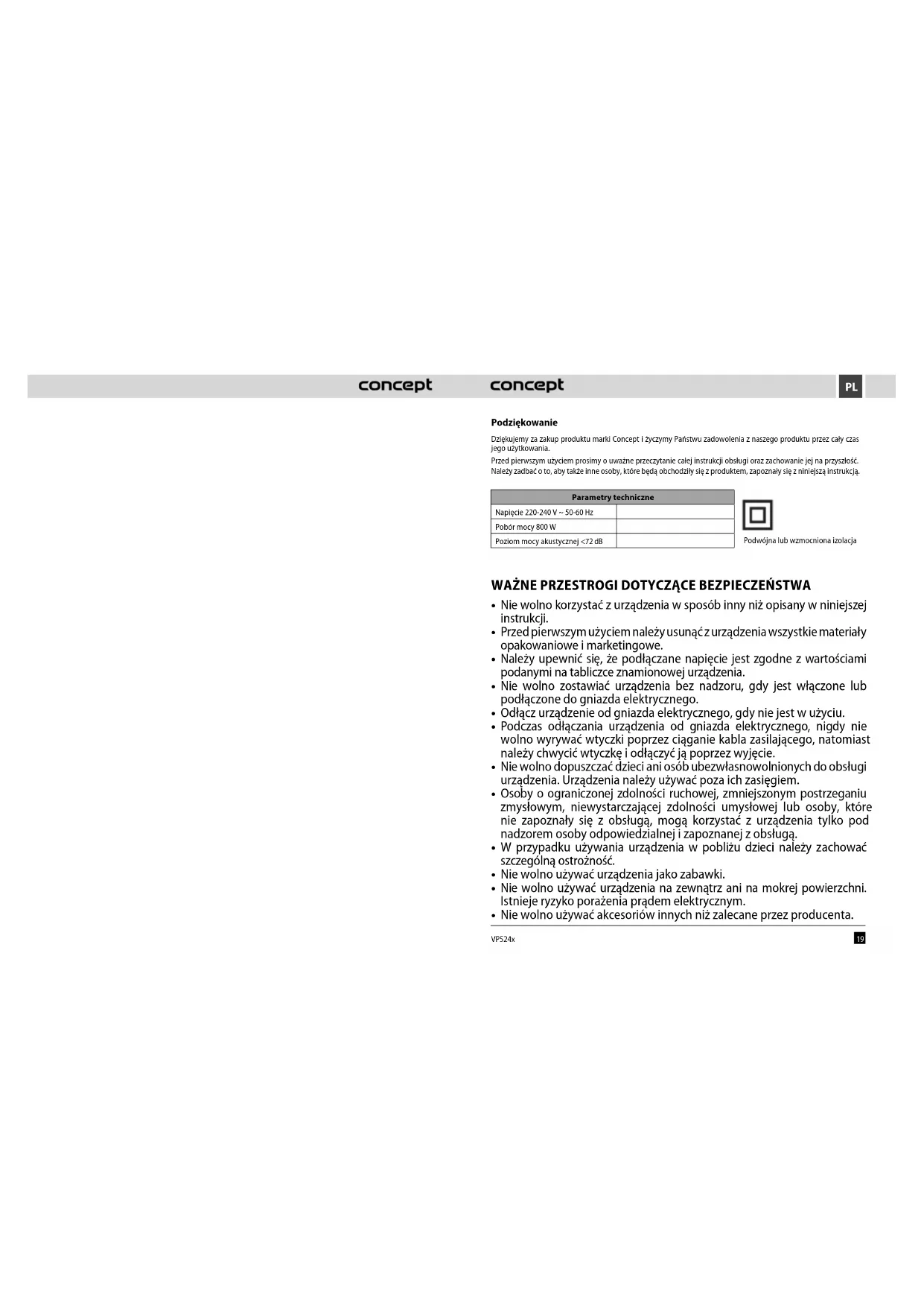 VP524x Podziękowanie Dziękujemy za zakup produktu marki Concept i życzymy Państwu zadowolenia z naszego produktu przez cały czas jego użytkowania. Przed pierwszym użyciem prosimy o uważne przeczytanie całej instrukcji obsługi oraz zachowanie jej na przyszłość. Należy zadbać o to, aby także inne osoby, które będą obchodziły się z produktem, zapoznały się z niniejszą instrukcją. Parametry techniczne Napięcie 220-240 V ~ 50-60 Hz Pobór mocy 800 W Poziom mocy akustycznej <72 dB WAŻNE PRZESTROGI DOTYCZĄCE BEZPIECZEŃSTWA