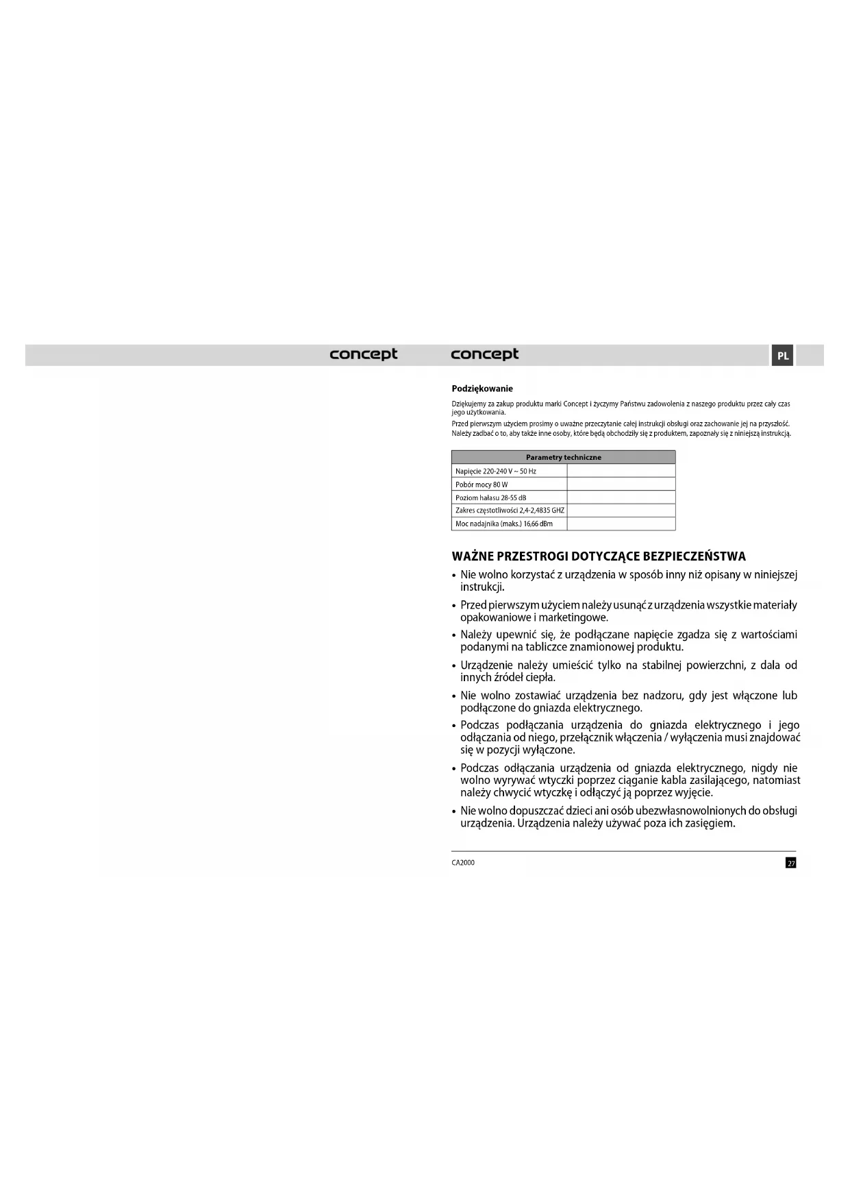 CA2000 Podziękowanie Dziękujemy za zakup produktu marki Concept i życzymy Państwu zadowolenia z naszego produktu przez cały czas jego użytkowania. Przed pierwszym użyciem prosimy o uważne przeczytanie całej instrukcji obsługi oraz zachowanie jej na przyszłość. Należy zadbać o to, aby także inne osoby, które będą obchodziły się z produktem, zapoznały się z niniejszą instrukcją. Parametry techniczne Napięcie 220-240 V ~ 50 Hz Pobór mocy 80 W Poziom hałasu 28-55 dB Zakres częstotliwości 2,4-2,4835 GHZ Moc nadajnika (maks.) 16,66 dBm WAŻNE PRZESTROGI DOTYCZĄCE BEZPIECZEŃSTWA