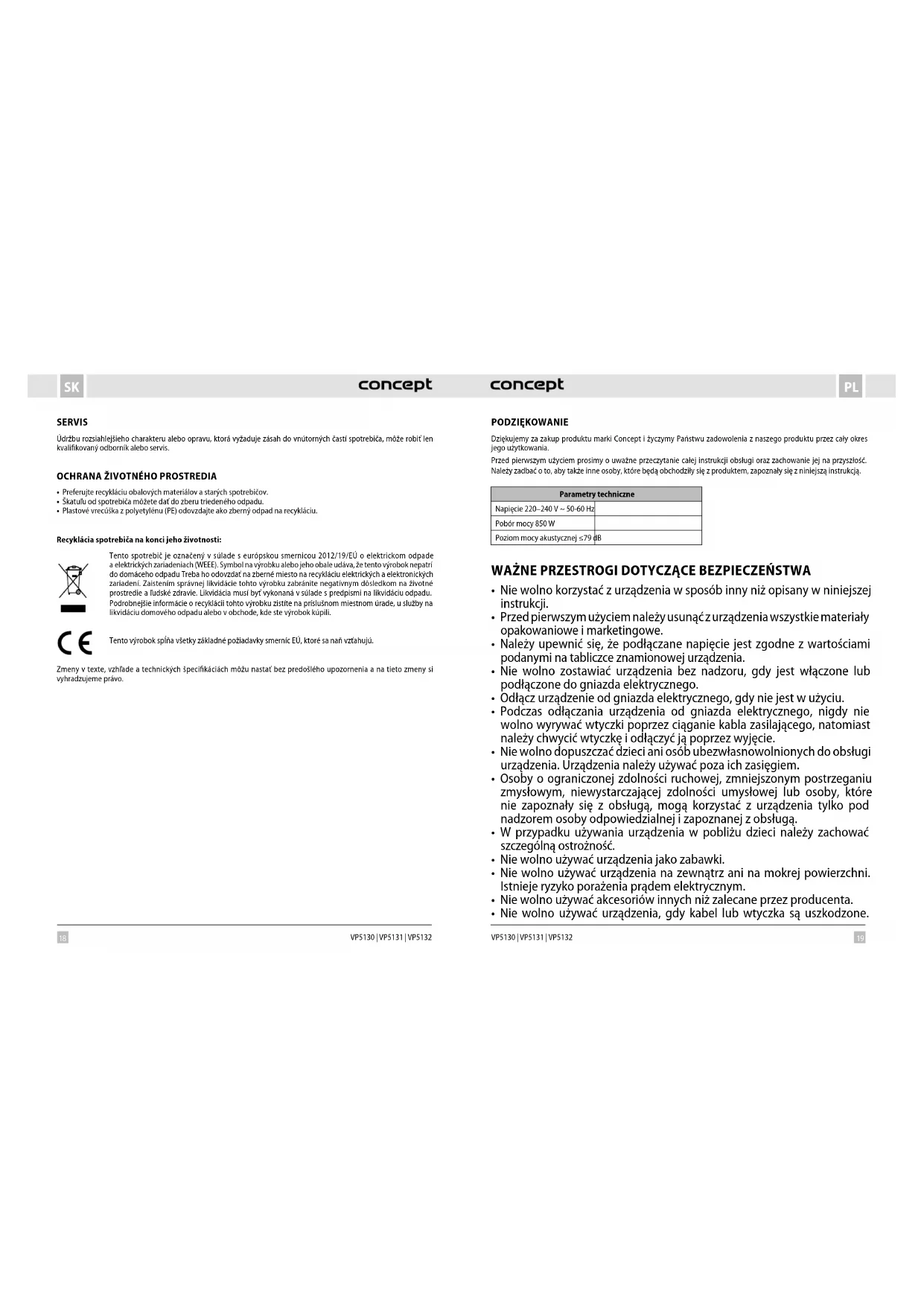 VP5130 | VP5131 | VP5132 SERWIS Bardziej kompleksową konserwację lub naprawy wymagające ingerencji w wewnętrzne elementy produktu powinien wykonywać wykwalifikowany specjalista lub serwis. OCHRONA ŚRODOWISKA