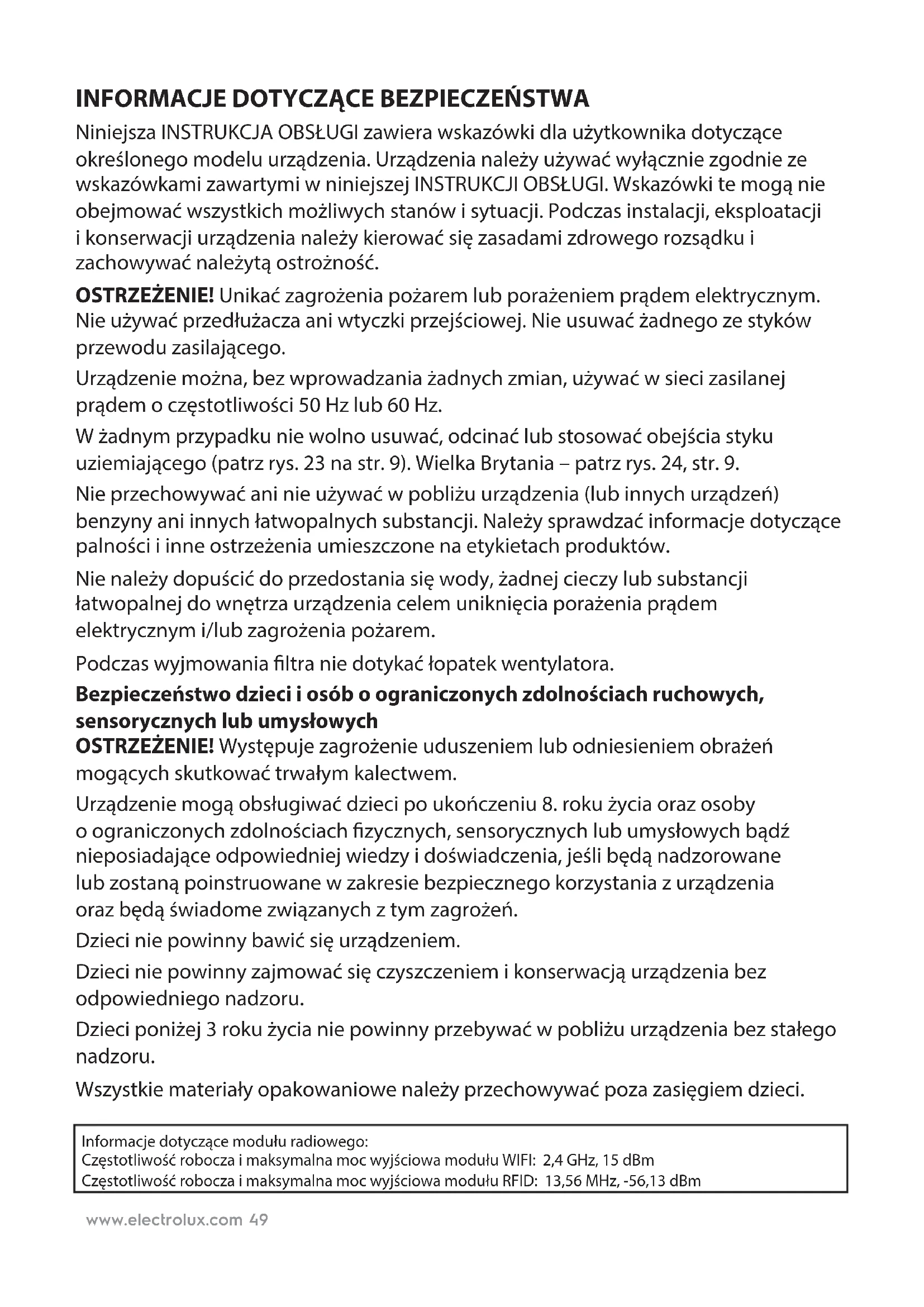 Niniejsza INSTRUKCJA OBSŁUGI zawiera wskazówki dla użytkownika dotyczące określonego modelu urządzenia. Urządzenia należy używać wyłącznie zgodnie ze wskazówkami zawartymi w niniejszej INSTRUKCJI OBSŁUGI. Wskazówki te mogą nie obejmować wszystkich możliwych stanów i sytuacji. Podczas instalacji, eksploatacji i konserwacji urządzenia należy kierować się zasadami zdrowego rozsądku i zachowywać należytą ostrożność. OSTRZEŻENIE! Unikać zagrożenia pożarem lub porażeniem prądem elektrycznym. Nie używać przedłużacza ani wtyczki przejściowej. Nie usuwać żadnego ze styków przewodu zasilającego. Urządzenie można, bez wprowadzania żadnych zmian, używać w sieci zasilanej prądem o częstotliwości 50 Hz lub 60 Hz. W żadnym przypadku nie wolno usuwać, odcinać lub stosować obejścia styku uziemiającego (patrz rys. 23 na str. 9). Wielka Brytania – patrz rys. 24, str. 9. Nie przechowywać ani nie używać w pobliżu urządzenia (lub innych urządzeń) benzyny ani innych łatwopalnych substancji. Należy sprawdzać informacje dotyczące palności i inne ostrzeżenia umieszczone na etykietach produktów. Nie należy dopuścić do przedostania się wody, żadnej cieczy lub substancji łatwopalnej do wnętrza urządzenia celem uniknięcia porażenia prądem elektrycznymi/lub zagrożenia pożarem. Podczas wyjmowania ltra nie dotykać łopatek wentylatora. Bezpieczeństwo dzieci i osób o ograniczonych zdolnościach ruchowych, sensorycznych lub umysłowych OSTRZEŻENIE! Występuje zagrożenie uduszeniem lub odniesieniem obrażeń mogących skutkować trwałym kalectwem. Urządzenie mogą obsługiwać dzieci po ukończeniu 8. roku życia oraz osoby oograniczonych zdolnościach zycznych, sensorycznych lub umysłowych bądź nieposiadające odpowiedniej wiedzy i doświadczenia, jeśli będą nadzorowane lubzostaną poinstruowane w zakresie bezpiecznego korzystania z urządzenia orazbędą świadome związanych z tym zagrożeń. Dzieci nie powinny bawić się urządzeniem. Dzieci nie powinny zajmować się czyszczeniem i konserwacją urządzenia bez odpowiedniego nadzoru. Dzieci poniżej 3 roku życia nie powinny przebywać w pobliżu urządzenia bez stałego nadzoru. Wszystkie materiały opakowaniowe należy przechowywać poza zasięgiem dzieci. Informacje dotyczące modułu radiowego: Częstotliwość robocza i maksymalna moc wyjściowa modułu WIFI: 2,4 GHz, 15 dBm Częstotliwość robocza i maksymalna moc wyjściowa modułu RFID: 13,56 MHz, -56,13 dBmwww.electrolux.com50 Informacje dotyczące podłączenia elektrycznego OSTRZEŻENIE! Unikać zagrożenia pożarem lub porażeniem prądem elektrycznym. Jeżeli nie ma pewności, że gniazdo jest odpowiednio uziemione lub zabezpieczone bezpiecznikiem zwłocznym lub wyłącznikiem automatycznym, należy zwrócić się do wykwalikowanego elektryka, aby zainstalował odpowiednie gniazdo zgodnie z krajowymi przepisami iwymogami dotyczącymi instalacji elektrycznych. Nie używać przedłużacza ani wtyczki przejściowej. Nie odłączać urządzenia od zasilania, ciągnąc za przewód zasilający. Należy zawsze mocno chwytać za wtyczkę iwyciągać ją prostopadle z gniazda. Nie ściskać, nie zaginać ani robić węzłów na przewodzie zasilającym. Uważać, aby nie przeciąć ani nie uszkodzić przewodu zasilającego. Jeśli przewód zasilający uległ uszkodzeniu, należy go wymienić w autoryzowanym serwisie rmy Electrolux. Urządzenie zawiera elementy nie podlegające serwisowaniu przez użytkownika. Gdy wystąpi konieczność obsługi serwisowej lub naprawy urządzenia, należy zwrócić się do autoryzowanego serwisu rmy Electrolux. Jeśli przewód zasilający jest uszkodzony, aby uniknąć niebezpieczeństwa, należy zlecić jego wymianę producentowi, przedstawicielowi serwisu lub innej kompetentnej osobie. Przed przystąpieniem do czyszczenia należy wyjąć wtyczkę, co pozwoli uniknąć zagrożenia porażeniem prądem lub wybuchem pożaru. POLSKI Dziękujemy za wybór odświeżacza powietrza ElectroluxPURE A9-40/PURE A9-60. Aby uzyskać najlepsze efekty, należy zawsze używać oryginalnych akcesoriów i części zamiennych. Ten produkt zaprojektowano z myślą o ochronie środowiska. Jego wszystkie plastikowe części oznaczono jako nadające siędorecyklingu.