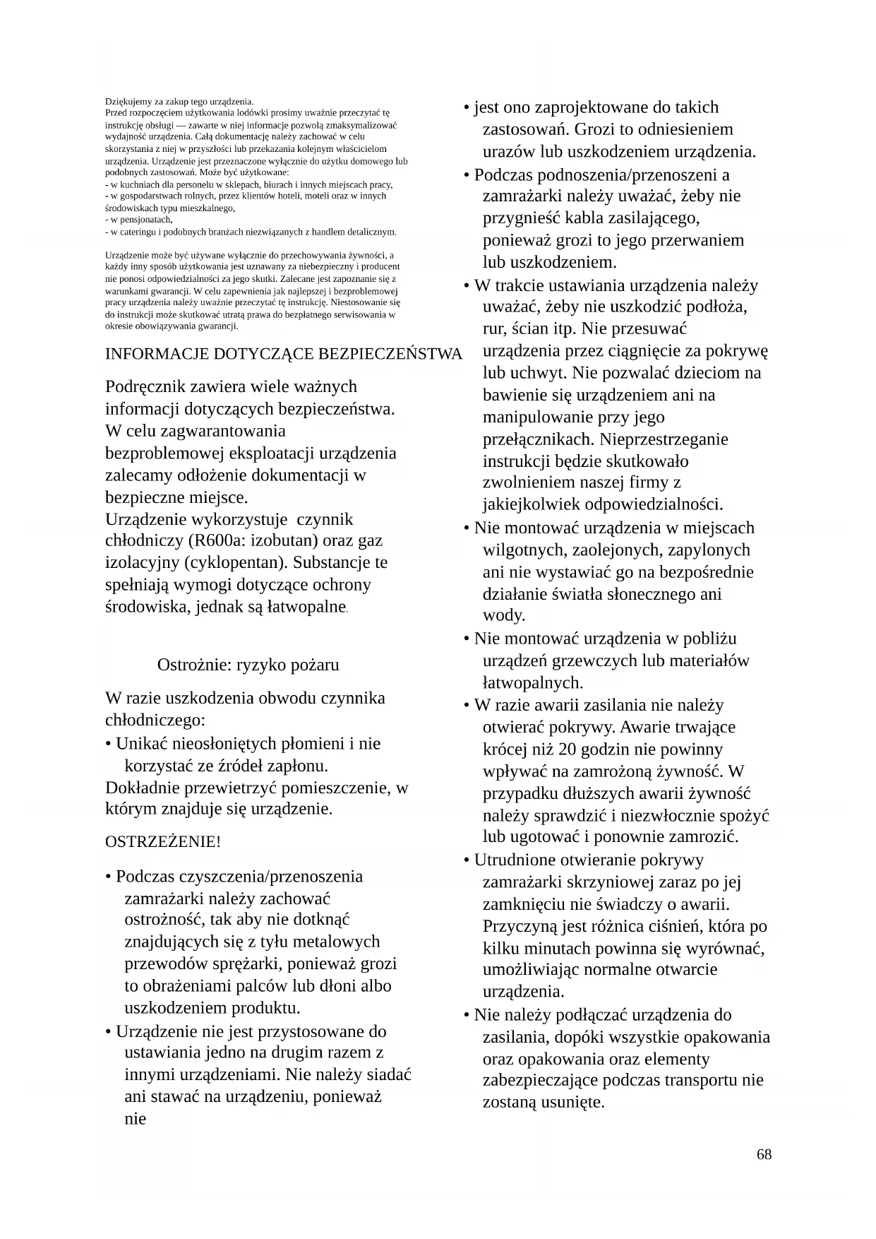 Podręcznik zawiera wiele ważnych informacji dotyczących bezpieczeństwa. W celu zagwarantowania bezproblemowej eksploatacji urządzenia zalecamy odłożenie dokumentacji w bezpieczne miejsce. Urządzenie wykorzystuje czynnik chłodniczy (R600a: izobutan) oraz gaz izolacyjny (cyklopentan). Substancje te spełniają wymogi dotyczące ochrony środowiska, jednak są łatwopalne. Ostrożnie: ryzyko pożaru W razie uszkodzenia obwodu czynnika chłodniczego:
