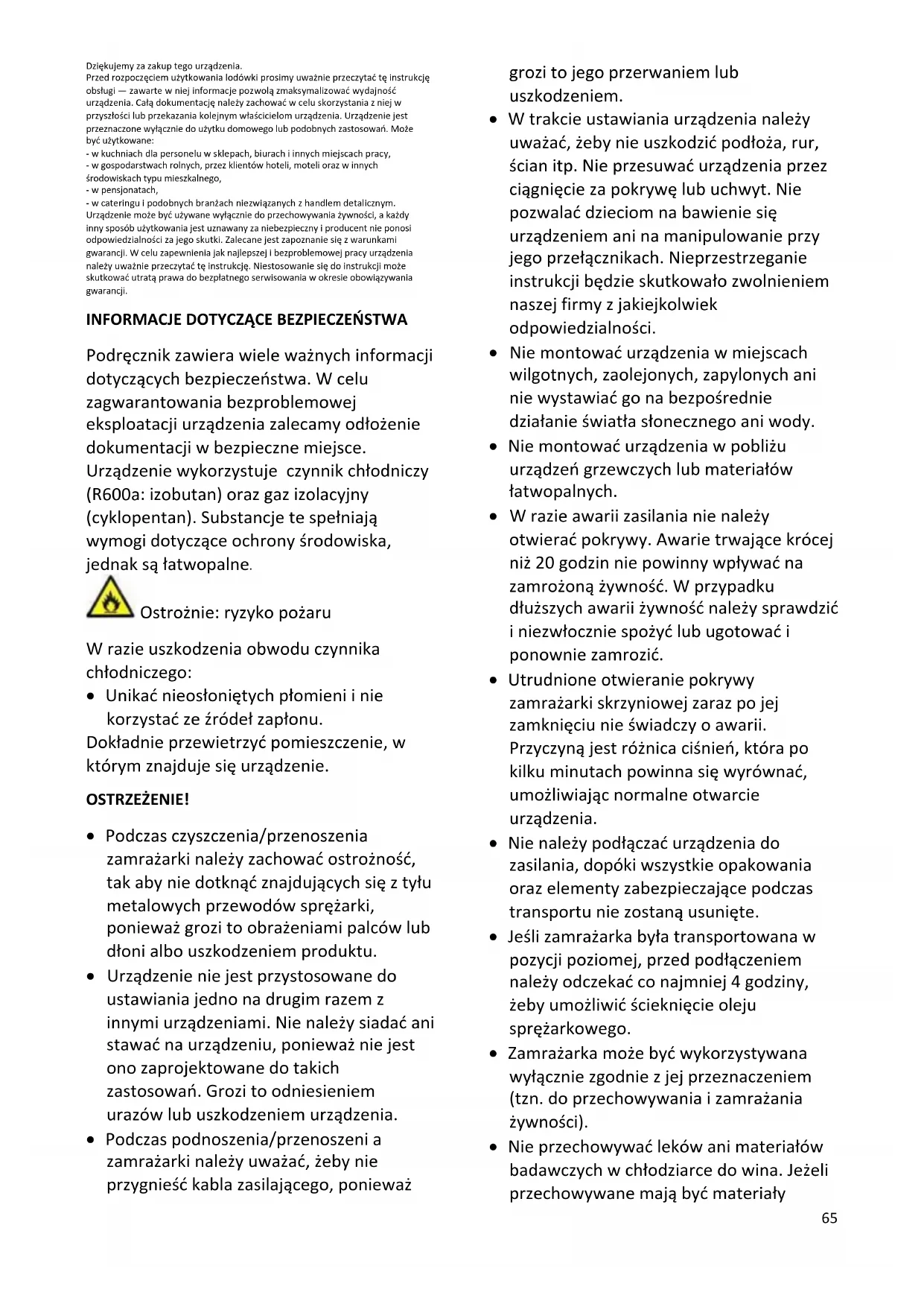 Podręcznik zawiera wiele ważnych informacji dotyczących bezpieczeństwa. W celu zagwarantowania bezproblemowej eksploatacji urządzenia zalecamy odłożenie dokumentacji w bezpieczne miejsce. Urządzenie wykorzystuje czynnik chłodniczy (R600a: izobutan) oraz gaz izolacyjny (cyklopentan). Substancje te spełniają wymogi dotyczące ochrony środowiska, jednak są łatwopalne