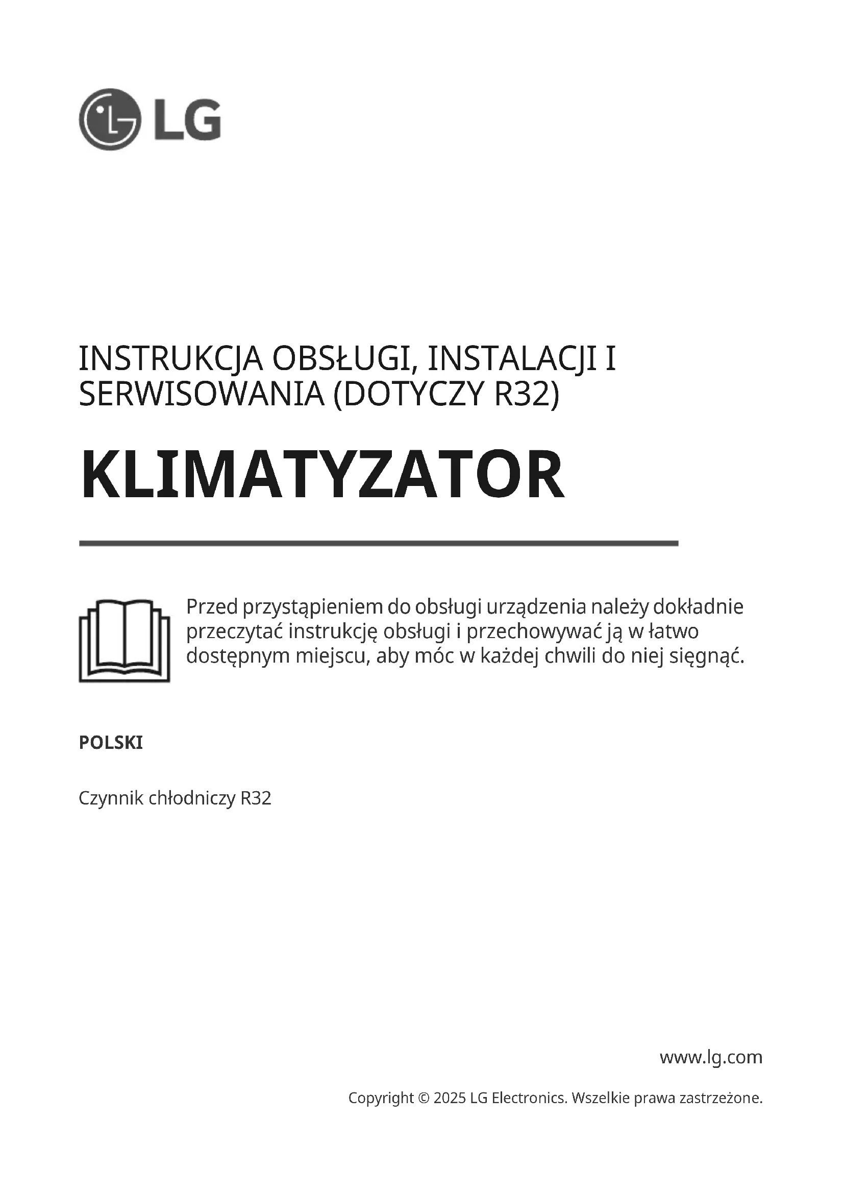 Is de werkelijke lading koudemiddel in het systeem in kg; is de toegestane maximale koelmiddelvulling in het systeem in kg, berekend volgens onderstaande vergelijking of 15,964 kg.INSTRUKCJA OBSŁUGI, INSTALACJI I SERWISOWANIA (DOTYCZY R32) KLIMATYZATOR Przed przystąpieniem do obsługi urządzenia należy dokładnie przeczytać instrukcję obsługi i przechowywać ją w łatwo dostępnym miejscu, aby móc w każdej chwili do niej sięgnąć. POLSKI Czynnik chłodniczy R32 www.lg.com Copyright © 2025 LG Electronics. Wszelkie prawa zastrzeżone.SPIS TREŚCI Zamieszczone winstrukcji ilustracje lub treści mogą różnić się w zależności od modelu posiadanego przez użytkownika. Niniejszy podręcznik może podlegać zmianom wprowadzanym przez producenta.