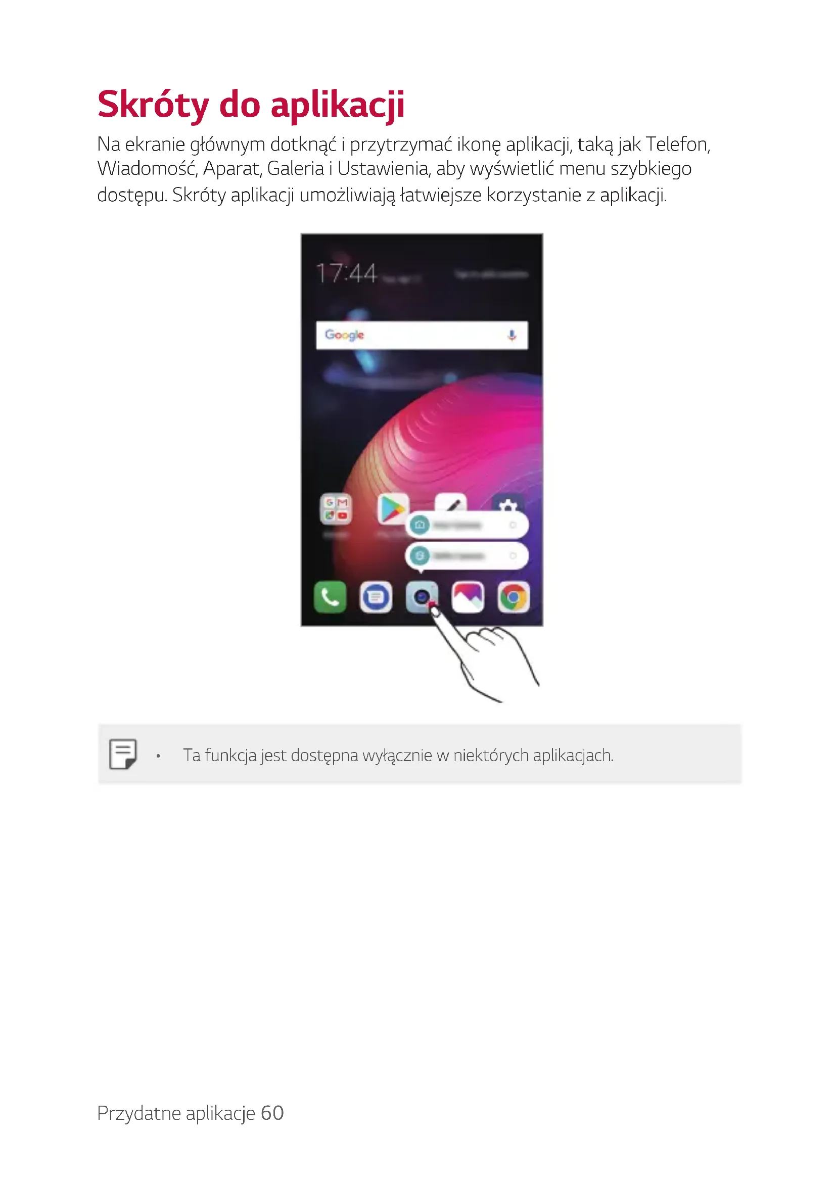 - Niektórychdanychniemożnaprzesyłaćwzależnościodwersji oprogramowania, wersji aplikacji, systemu operacyjnego, producenta lub polityki operatora sieci.Dodatek 123 Obsługiwane częstotliwości Moc wyjściowa nadajnika GSM 900 33 dBm GSM 1800 29.5 dBm WCDMA B1 22.5 dBm WCDMA B8 24.5 dBm LTE B1 22.5 dBm LTE B3 22.5 dBm LTE B7 21.5 dBm LTE B8 24.5 dBm LTE B20 24.5 dBm LTE B38 23.5 dBm BT 2.4GHz 6.5 dBm WLAN 2.4GHz 16 dBm NFC -16 dBuA/mDodatek 124 Utylizacja starego urządzenia 1.Symbolprzekreślonegopojemnikanaodpadynakółkachoznacza,że produktyelektrycznelubelektroniczne(WEEE)należyzutylizować poza obiegiem odpadów komunalnych. 2.Stareproduktyelektronicznemogązawieraćniebezpiecznesubstancje. Właściwautylizacjastaregourządzeniapozwoliuniknąćpotencjalnych negatywnychskutkówdlaśrodowiskaizdrowia.Stareurządzenie możezawieraćczęściwielokrotnegoużytku,któremogązostać wykorzystanedonaprawyinnychproduktówlubinnewartościowe materiały,któremożnaprzetworzyć,abyoszczędzaćzasobynaturalne. 3.Możeszzanieśćurządzeniedosklepu,wktórymzostałokupionelub skontaktowaćsięzlokalnymurzędemgospodarkiodpadami,aby uzyskaćinformacjeonajbliższympunkciezbiórkiWEEE.Abyuzyskać aktualneinformacjezzakresugospodarkiodpadamiobowiązującejw Twoimkraju,odwiedźstronę http://www.lg.com/global/sustainability/ environment/take-back-recycling/global-network-europe (plik PDF :„FormoreinformationabouthowtorecycleLGproductsinyour country”.) Postępowanie ze zużytymi bateriami/akumulatorami 1.Jeśliwskładbateriiwchodzipowyżej0,0005%rtęci,0,002%kadmu lub0,004%ołowiu,symboltenmożewystępowaćwrazzoznaczeniami symbolichemicznychrtęci(Hg),kadmu(Cd)lubołowiu(Pb). 2.Zabraniasięwyrzucaniazużytychbaterii/akumulatorówrazemze zwykłymiodpadamikomunalnymi.Powinnyonezostaćprzekazanedo punktówzbiórkiodpadówwyznaczonychprzezwładzelokalne. 3.Odpowiedniepostępowaniezezużytymibateriami/akumulatorami zapobiegapotencjalnymnegatywnymkonsekwencjomdlaśrodowiska naturalnegoizdrowialudziizwierząt. 4.Szczegółoweinformacjedotyczącesposobupostępowaniazezużytymi bateriami/akumulatoramimożnauzyskaćwewłaściwymurzędzie miejskim,przedsiębiorstwieutylizacjiodpadówlubsklepie,wktórym zostałnabytyprodukt.Dodatek 125 Często zadawane pytania Tenrozdziałzawierainformacjeoniektórychproblemach,któremogą wystąpićpodczasużytkowaniatelefonu.Wprzypadkuniektórychproblemów koniecznejestskontaktowaniesięzdostawcąusług,jednakwiększośćznich możnawłatwysposóbrozwiązaćsamodzielnie. Błąd karty SIM Upewnićsię,żekartaSIMjestwłożonaprawidłowo. Brak połączenia z siecią lub połączenie z siecią przerwane Słabysygnał.Podejdźzurządzeniemdooknalubwyjdźnaotwartąprzestrzeń. Użytkownikznajdujesiępozazasięgiemsieci.Przejdźwinnemiejsceisprawdź zasięg. Połączenia są niedostępne Brak autoryzacji dla nowej sieci. Upewnijsię,żenieustawionoblokowaniapołączeńprzychodzących. Upewnijsię,żenieustawionoblokowaniapołączeńwychodzącychdlanumeru, który wybierasz. Nie można włączyć urządzenia Jeślibateriajestcałkowicierozładowana,urządzeniesięniewłączy. Przedponownymwłączeniemurządzeniacałkowicienaładujbaterię. Błąd ładowania Urządzeniepowinnobyćładowanewnormalnejtemperaturze. Sprawdźładowarkęipołączenieładowarkizurządzeniem. Należyużywaćwyłącznieakcesoriówdołączonychdozestawui autoryzowanychprzezfirmęLG.Dodatek 126 Bateria wyczerpuje się szybciej niż na początku jej użytkowania Żywotnośćbateriimożesięskrócićpowystawieniuurządzenialubsamej bateriinadziałaniebardzoniskichlubbardzowysokichtemperatur. Zużyciebateriiwzrastawprzypadkuużywanianiektórychfunkcjilubaplikacji, takich jak GPS, gry czy Internet. Bateriaulegazużyciuizczasemjejczaspracystajesiękrótszy. Wyświetlanie komunikatów o błędach w momencie uruchamiania aparatu Naładujakumulator. Zwolnijmiejscewpamięci,przenoszącplikidokomputeralubusuwającplikiz urządzenia. ponowneuruchomienieurządzenia. Jeślipozastosowaniusiędotychwskazówekproblemynieustąpią,skontaktuj sięzcentrumserwisowymfirmyLGElectronics. Słaba jakość zdjęcia Jakośćzdjęćmożesięróżnićwzależnościodotoczeniaorazużywanych technik fotografowania. Jakośćzdjęćiklipówwideojestlepszawprzypadkustosowania standardowegowidokuzamiastwidokuszerokokątnego. Jeślizdjęciejestrobionewciemnymmiejscu,nocąlubwpomieszczeniu,obraz możebyćnieostrylubmogąwystępowaćnanimszumy. W przypadku problemów zresetuj opcje.Dodatek 127 Ekran dotykowy reaguje wolno lub nieprawidłowo Jeślinaurządzeniuzamocowanesąakcesorialubfoliaochronna,ekran dotykowymożedziałaćnieprawidłowo. Wprzypadkudotykaniaekranuwrękawiczkach,brudnymirękami,ostro zakończonymiprzedmiotamilubopuszkamipalcówekrandotykowymoże działaćnieprawidłowo. Wilgotneotoczenieorazkontaktzwodąmogązakłócićdziałanieekranu dotykowego. Abyusunąćewentualnetymczasowebłędyoprogramowania,zresetuj urządzenie. Jeśliekrandotykowyjestpodrapanylubuszkodzony,odwiedźcentrum serwisowe firmy LG Electronics. Urządzenie się zawiesza Ponownie uruchom urządzenie