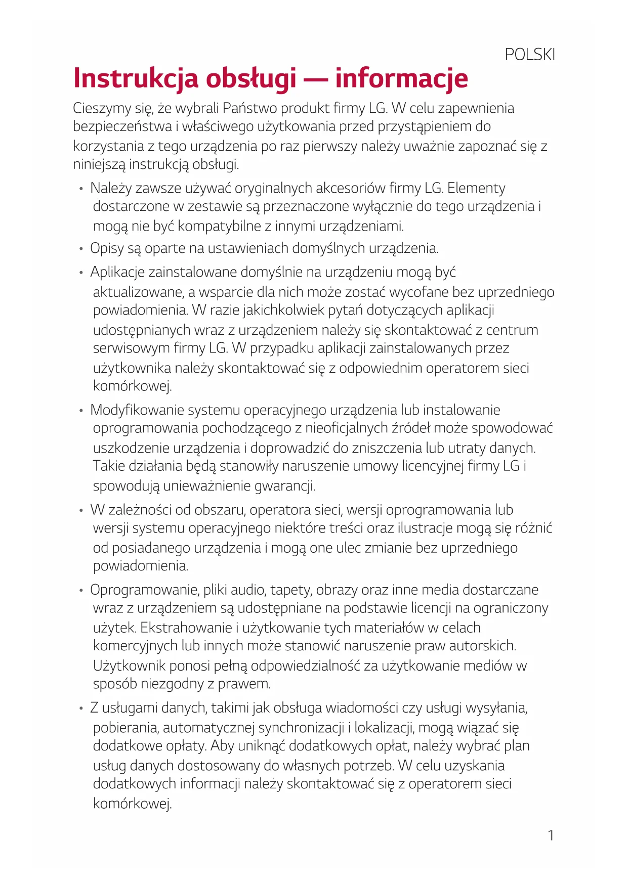 - Dane osobiste użytkownika zapisane w pamięci wewnętrznej telefonu — w tym dane konta Google i innych kont, dane i ustawienia systemu i aplikacji, wszelkie pobrane aplikacje i licencje DRM — mogą zostać utracone podczas aktualizacji oprogramowania telefonu. Z tego względu firma LG zaleca wykonanie kopii zapasowej danych użytkownika przed przystąpieniem do aktualizacji oprogramowania telefonu. Firma LG nie odpowiada za utratę danych użytkownika.