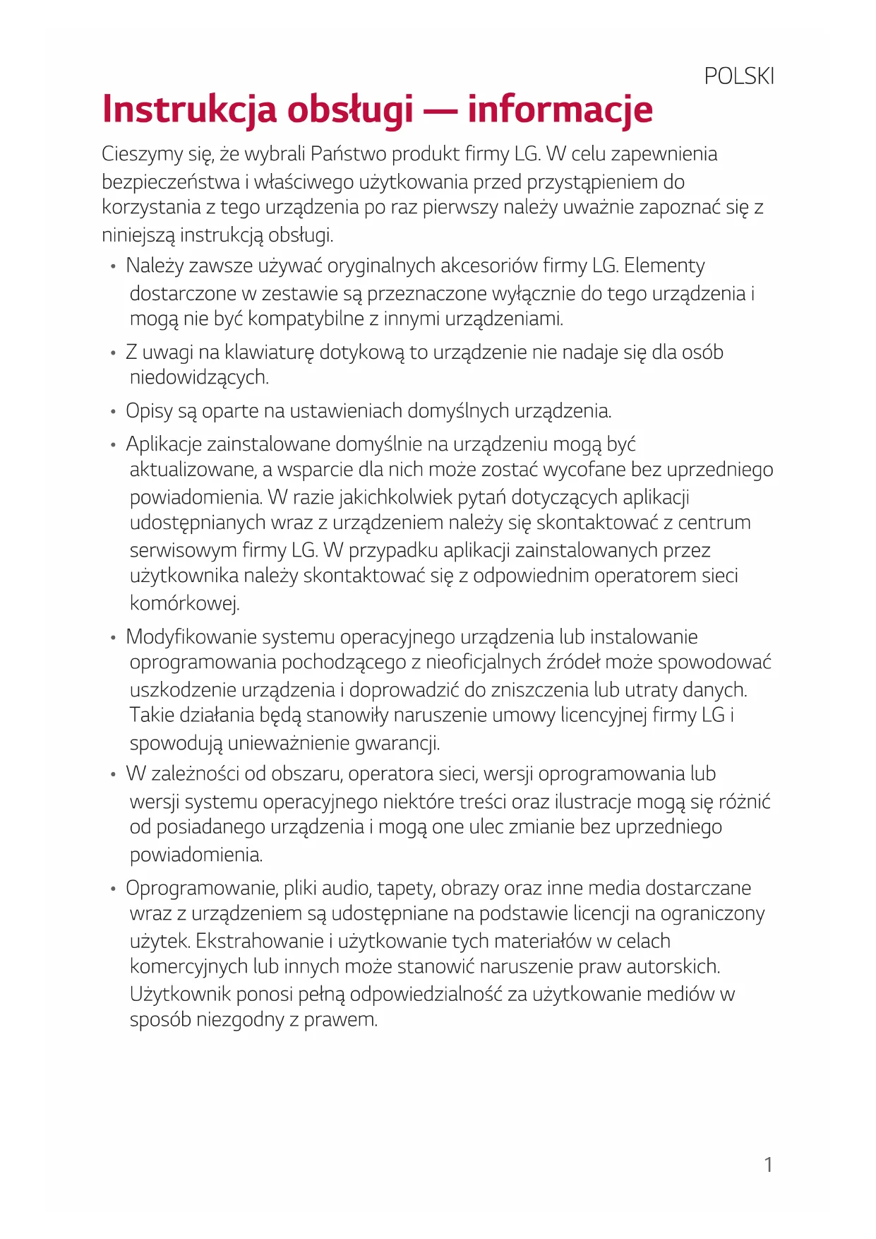 - Dane osobiste użytkownika zapisane w pamięci wewnętrznej telefonu — w tym dane konta Google i innych kont, dane i ustawienia systemu i aplikacji, wszelkie pobrane aplikacje i licencje DRM — mogą zostać utracone podczas aktualizacji oprogramowania telefonu. Z tego względu firma LG zaleca wykonanie kopii zapasowej danych użytkownika przed przystąpieniem do aktualizacji oprogramowania telefonu. Firma LG nie odpowiada za utratę danych użytkownika.
