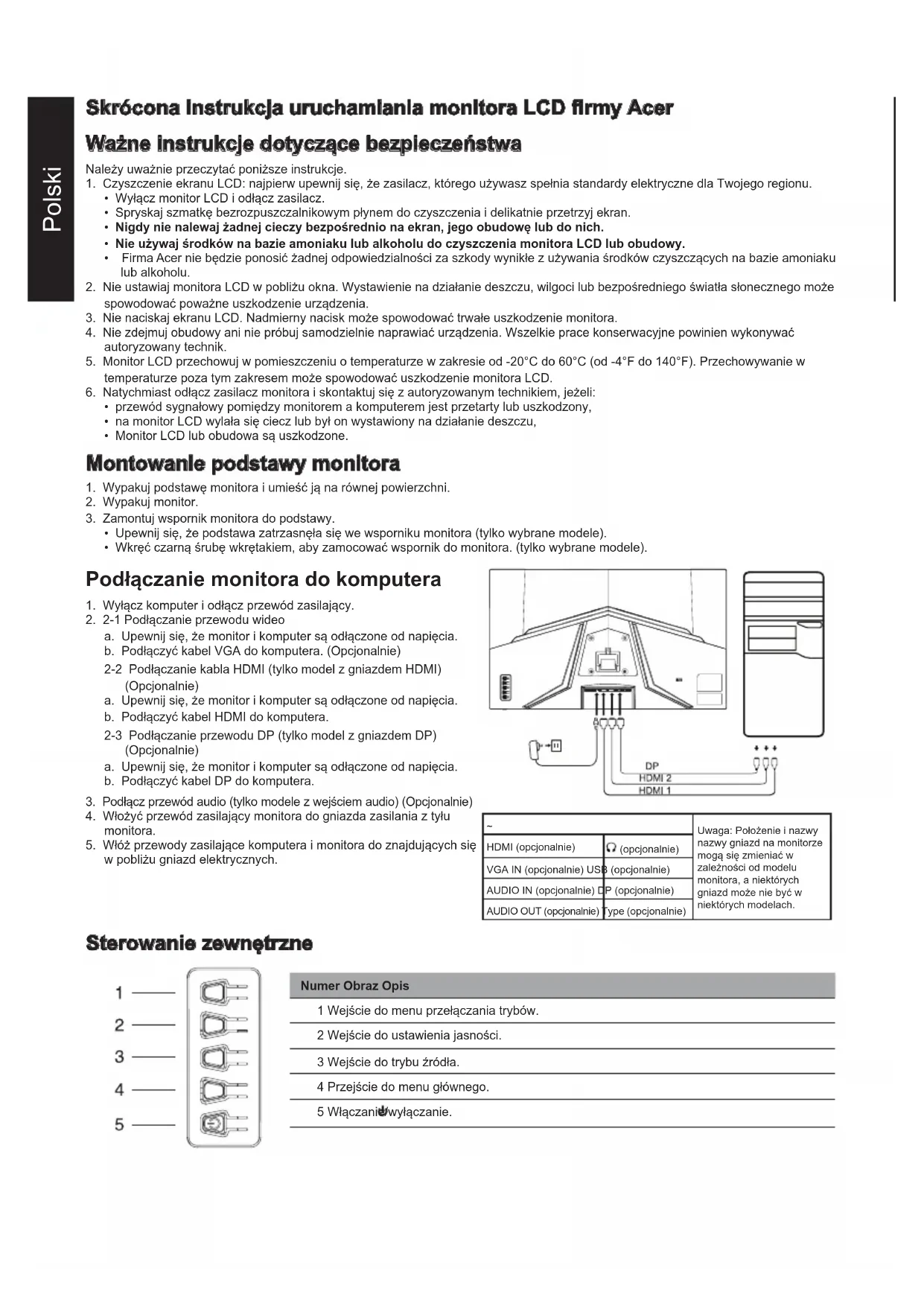 HDMI (tylko modele z wejściem HDMI) (opcjonalnie) Głośniki 2 W x 2 (tylko model z wejściem audio) (opcjonalne) Maksymalny rozmiar ekranu W poziomie: 698 mm W pionie: 393 mm Źródło zasilania WEJŚCIE: 100-240 V ~ 50/60 Hz Kwestie środowiskowe Temperatura pracy: Od 0° do 40°C Temperatura przechowywania: Od -20° do 60°C Wilgotność otoczenia podczas pracy: Od 20% do 80% Wymiary 713 (szer.) x 512,5 (wys.) x 198,6 (głęb.) mm Masa (netto) 5 kg (netto) Specykacje mechanizmów Pochylenie: Od -5° do +20° Obracanie: Nie Regulacja wysokości: Nie Obrót w pionie: Nie Zdejmowalna podpórka: Nie Zewnętrzne elementy sterujące Przełącznik/przyciski Przycisk zasilania Klawisz szybkiego dostępu 1 Klawisz szybkiego dostępu 2 Klawisz szybkiego dostępu 3 Klawisz szybkiego dostępu 4 Funkcje Jasność Kontrast Nieb. świat. Wzmocn. czerni ACM HDR10 Super ostrość Gamma Temp. koloru Tryby Przestrz. kolor. Tryb odc. szar. 6-osiowa barwa Nasyc. 6-osiow Głośność Wyciszenie Over Drive FreeSync Premium VRB Bardzo małe opóźnienie Częst. odśwież. Cel Język Wyłączenie OSD Przezroczystość Blokada OSD Wejście Auto źródło Format DP Tryb szeroki Przypis. przyc. skrótu DDC/CI Poz. czarn. HDMI Tryb szyb. uruch Informacje Resetuj wszyst. ustaw. Dane techniczne zależą od modelu i/lub regionu. Instrukcje i inne dokumenty dotyczące produktu firmy Acer można znaleźć w oficjalnej witrynie pomocy technicznej firmy Acer.Português Manual de início rápido (QSG) do monitor LCD da Acer Instruções de segurança importantes Leia atentamente as instruções que se seguem. 1. Limpar o ecrã do monitor LCD: primeiro, verificar se o adaptador de corrente que está a usar corresponde às normas elétricas da sua região.