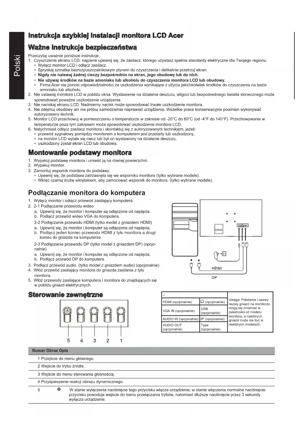 - Jaarlijks energieverbruik wordt berekend op basis van standaard stroomverbruik 4 uur per dag, 365 dagen per jaar.Polski Instrukcja szybkiej instalacji monitora LCD Acer Ważne instrukcje bezpieczeństwa Przeczytaj uważnie poniższe instrukcje. 1. Czyszczenie ekranu LCD: najpierw upewnij się, że zasilacz, którego używasz spełnia standardy elektryczne dla Twojego regionu.
