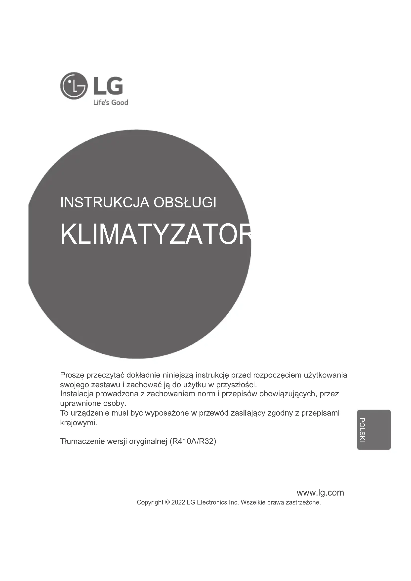 Proszę przeczytać dokładnie niniejszą instrukcję przed rozpoczęciem użytkowania swojego zestawu i zachować ją do użytku w przyszłości. Instalacja prowadzona z zachowaniem norm i przepisów obowiązujących, przez uprawnione osoby. To urządzenie musi być wyposażone w przewód zasilający zgodny z przepisami krajowymi. Tłumaczenie wersji oryginalnej (R410A/R32) KLIMATYZATOR Copyright © 2022 LG Electronics Inc. Wszelkie prawa zastrzeżone. POLSKISpis Treści 2 Jednostka wewnętrzna