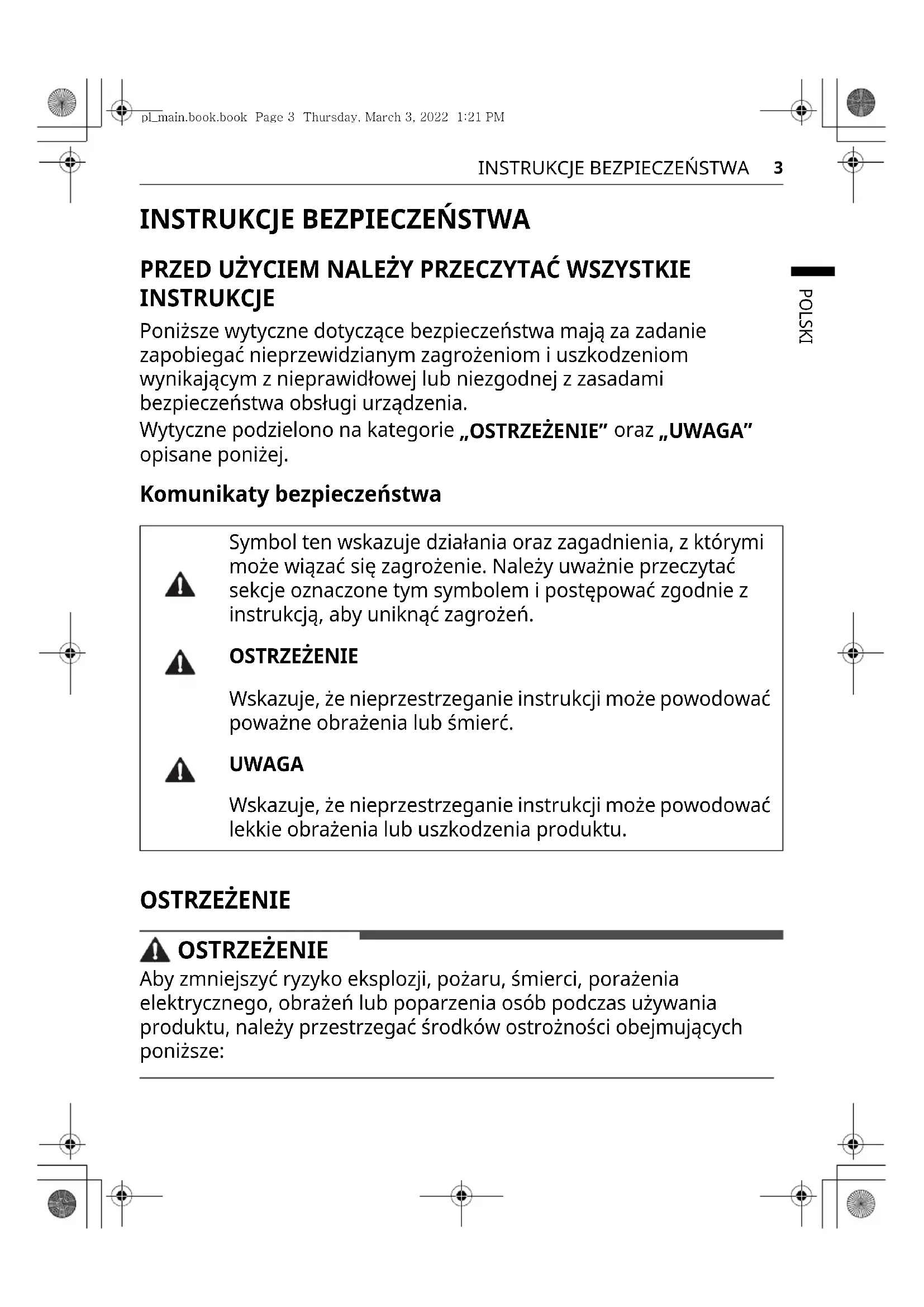 PRZED UŻYCIEM NALEŻY PRZECZYTAĆ WSZYSTKIE INSTRUKCJE Poniższe wytyczne dotyczące bezpieczeństwa mają za zadanie zapobiegać nieprzewidzianym zagrożeniom i uszkodzeniom wynikającym z nieprawidłowej lub niezgodnej z zasadami bezpieczeństwa obsługi urządzenia. Wytyczne podzielono na kategorie „OSTRZEŻENIE” oraz „UWAGA” opisane poniżej. Komunikaty bezpieczeństwa OSTRZEŻENIE OSTRZEŻENIE Aby zmniejszyć ryzyko eksplozji, pożaru, śmierci, porażenia elektrycznego, obrażeń lub poparzenia osób podczas używania produktu, należy przestrzegać środków ostrożności obejmujących poniższe: Symbol ten wskazuje działania oraz zagadnienia, z którymi może wiązać się zagrożenie. Należy uważnie przeczytać sekcje oznaczone tym symbolem i postępować zgodnie z instrukcją, aby uniknąć zagrożeń. OSTRZEŻENIE Wskazuje, że nieprzestrzeganie instrukcji może powodować poważne obrażenia lub śmierć. UWAGA Wskazuje, że nieprzestrzeganie instrukcji może powodować lekkie obrażenia lub uszkodzenia produktu. pl_main.book.book Page 3 Thursday, March 3, 2022 1:21 PM4
