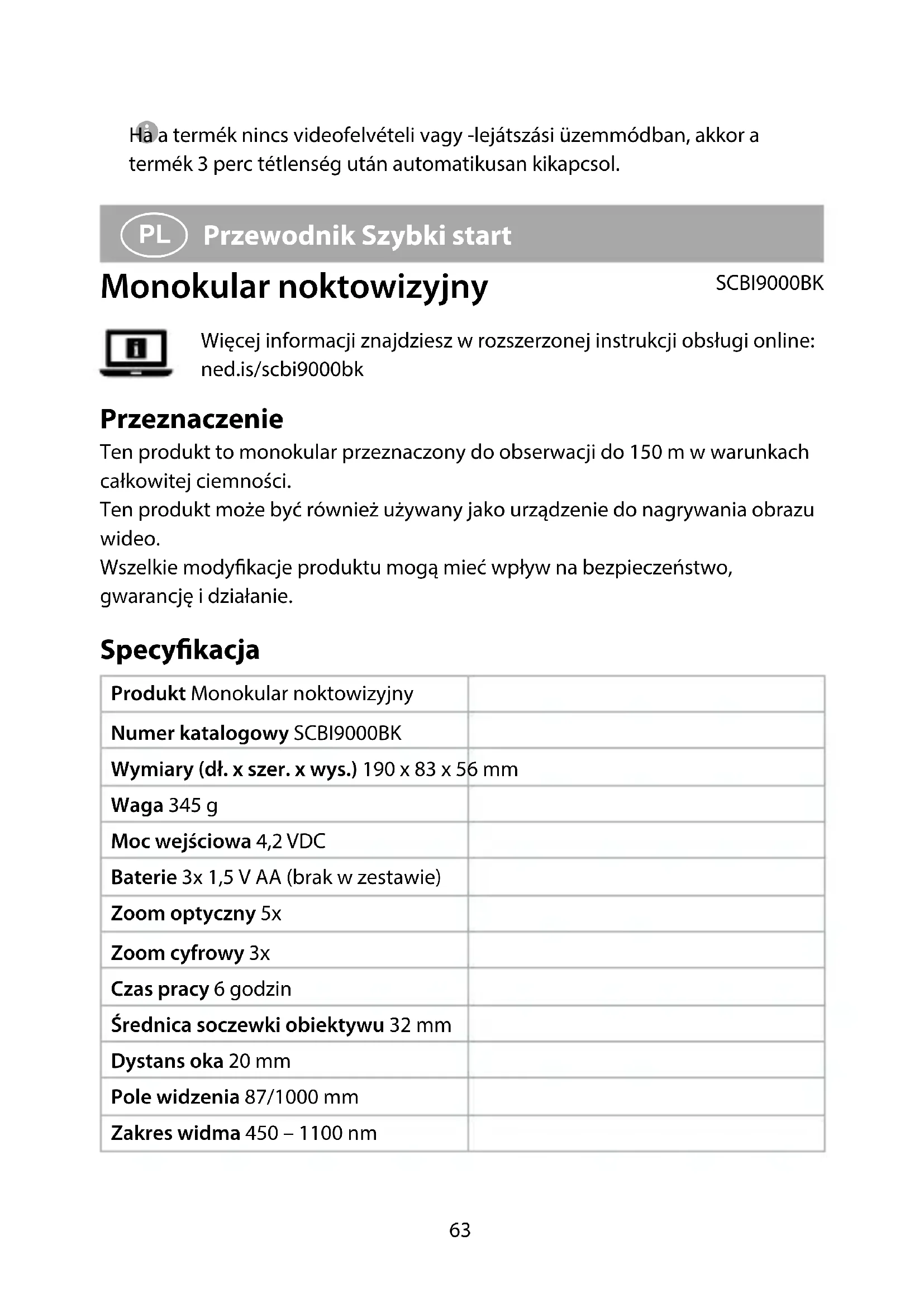 Przewodnik Szybki start Monokular noktowizyjny SCBI9000BK Więcej informacji znajdziesz w rozszerzonej instrukcji obsługi online: ned.is/scbi9000bk Przeznaczenie Ten produkt to monokular przeznaczony do obserwacji do 150 m w warunkach całkowitej ciemności. Ten produkt może być również używany jako urządzenie do nagrywania obrazu wideo. Wszelkie modykacje produktu mogą mieć wpływ na bezpieczeństwo, gwarancję i działanie. Specykacja Produkt Monokular noktowizyjny Numer katalogowy SCBI9000BK Wymiary (dł. x szer. x wys.) 190 x 83 x 56 mm Waga 345 g Moc wejściowa 4,2 VDC Baterie 3x 1,5 V AA (brak w zestawie) Zoom optyczny 5x Zoom cyfrowy 3x Czas pracy 6 godzin Średnica soczewki obiektywu 32 mm Dystans oka 20 mm Pole widzenia 87/1000 mm Zakres widma 450 – 1100 nm64 Odległość widzenia przy słabym świetle 2,0 m Odległość widzenia w całkowitej ciemności