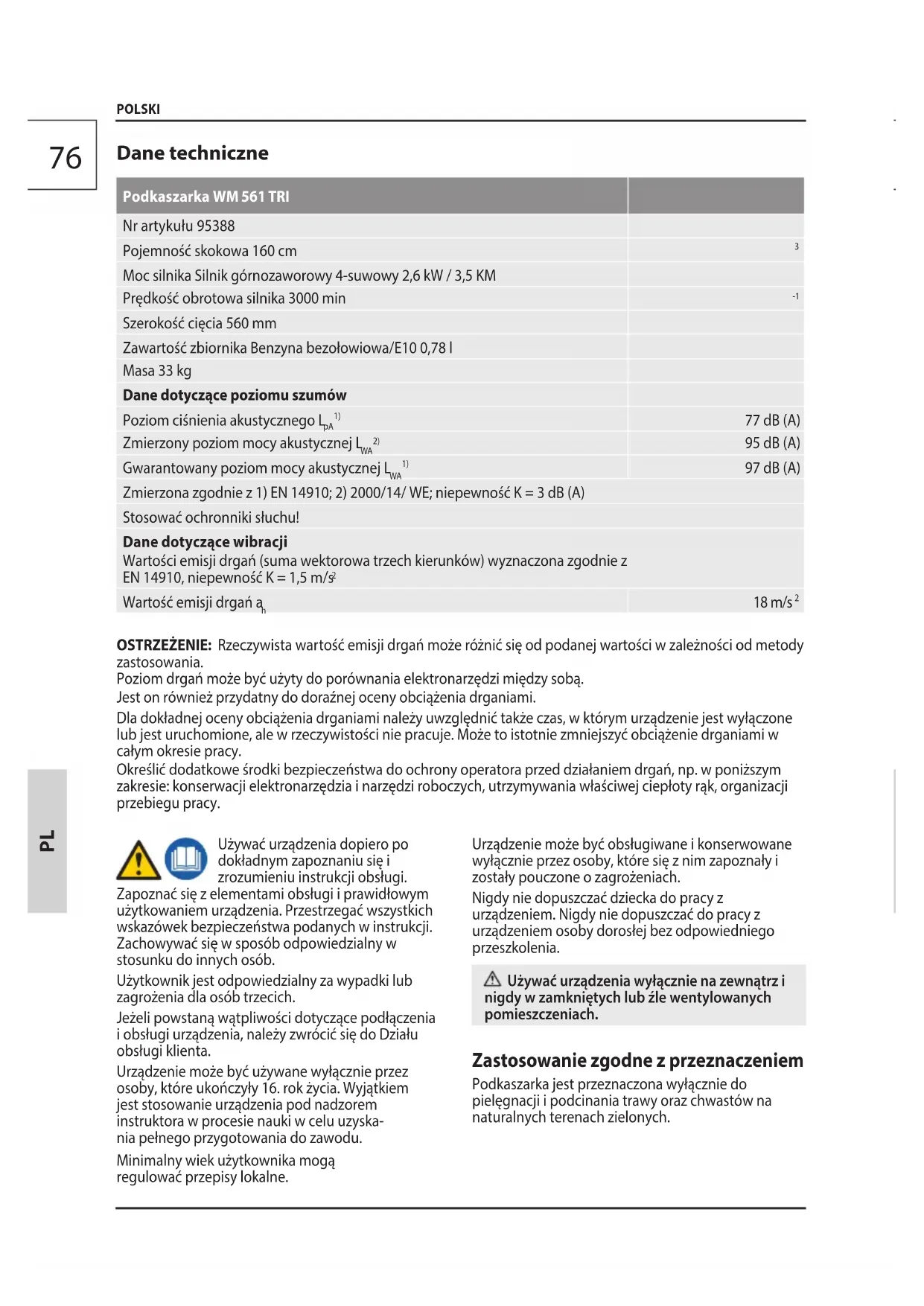 97 dB (A) Zmierzona zgodnie z 1) EN 14910; 2) 2000/14/ WE; niepewność K = 3 dB (A) Stosować ochronniki słuchu! Dane dotyczące wibracji Wartości emisji drgań (suma wektorowa trzech kierunków) wyznaczona zgodnie z EN 14910, niepewność K = 1,5 m/s