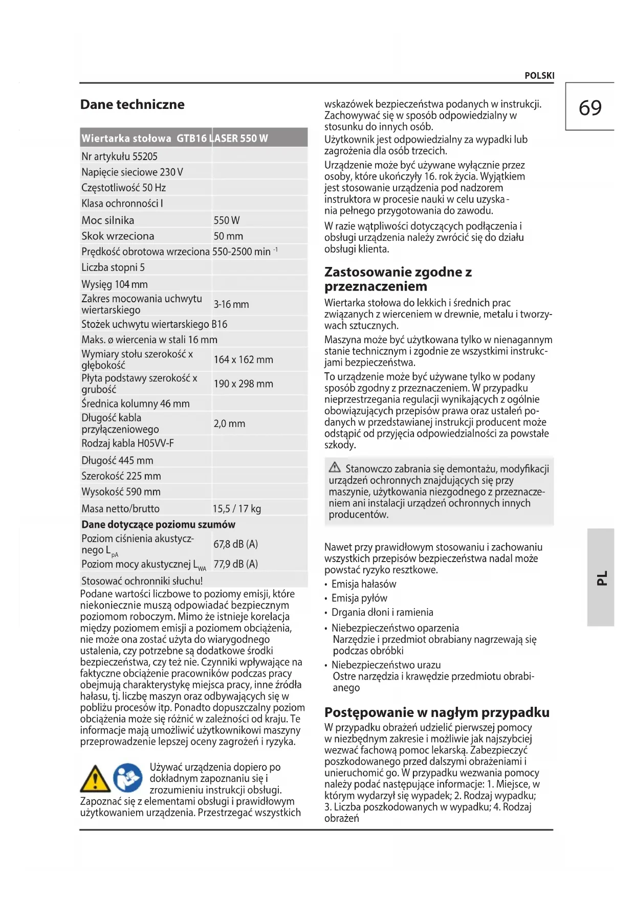 POLSKI Dane techniczne Wiertarka stołowa GTB16 LASER 550 W Nr artykułu 55205 Napięcie sieciowe 230 V Częstotliwość 50 Hz Klasa ochronności I Moc silnika 550 W Skok wrzeciona 50 mm Prędkość obrotowa wrzeciona 550-2500 min