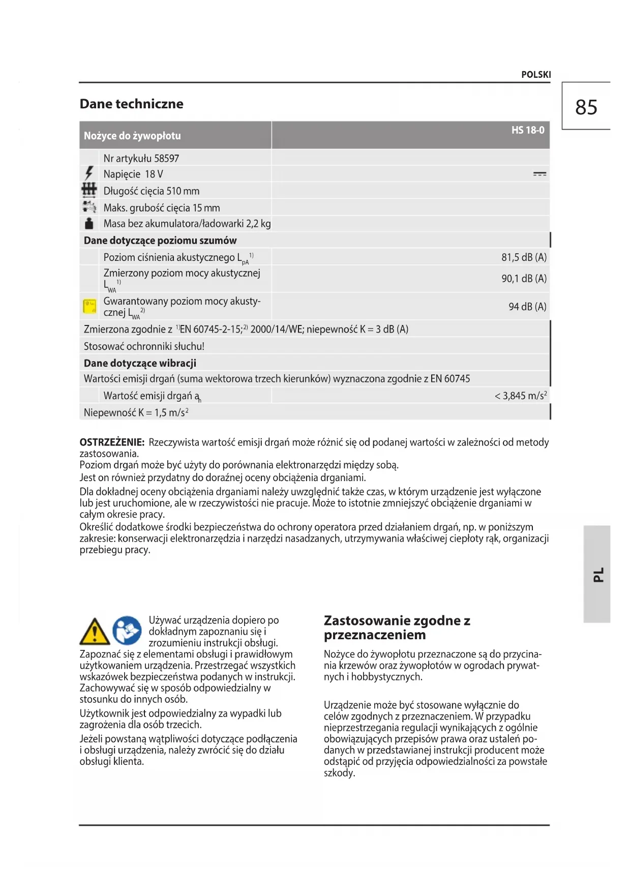 OSTRZEŻENIE: Rzeczywista wartość emisji drgań może różnić się od podanej wartości w zależności od metody zastosowania. Poziom drgań może być użyty do porównania elektronarzędzi między sobą. Jest on również przydatny do doraźnej oceny obciążenia drganiami. Dla dokładnej oceny obciążenia drganiami należy uwzględnić także czas, w którym urządzenie jest wyłączone lub jest uruchomione, ale w rzeczywistości nie pracuje. Może to istotnie zmniejszyć obciążenie drganiami w całym okresie pracy. Określić dodatkowe środki bezpieczeństwa do ochrony operatora przed działaniem drgań, np. w poniższym zakresie: konserwacji elektronarzędzia i narzędzi nasadzanych, utrzymywania właściwej ciepłoty rąk, organizacji przebiegu pracy. POLSKI Używać urządzenia dopiero po dokładnym zapoznaniu się i zrozumieniu instrukcji obsługi. Zapoznać się z elementami obsługi i prawidłowym użytkowaniem urządzenia. Przestrzegać wszystkich wskazówek bezpieczeństwa podanych w instrukcji. Zachowywać się w sposób odpowiedzialny w stosunku do innych osób. Użytkownik jest odpowiedzialny za wypadki lub zagrożenia dla osób trzecich. Jeżeli powstaną wątpliwości dotyczące podłączenia i obsługi urządzenia, należy zwrócić się do działu obsługi klienta. Zastosowanie zgodne z przeznaczeniem Nożyce do żywopłotu przeznaczone są do przycina- nia krzewów oraz żywopłotów w ogrodach prywat- nych i hobbystycznych. Urządzenie może być stosowane wyłącznie do celów zgodnych z przeznaczeniem. W przypadku nieprzestrzegania regulacji wynikających z ogólnie obowiązujących przepisów prawa oraz ustaleń po