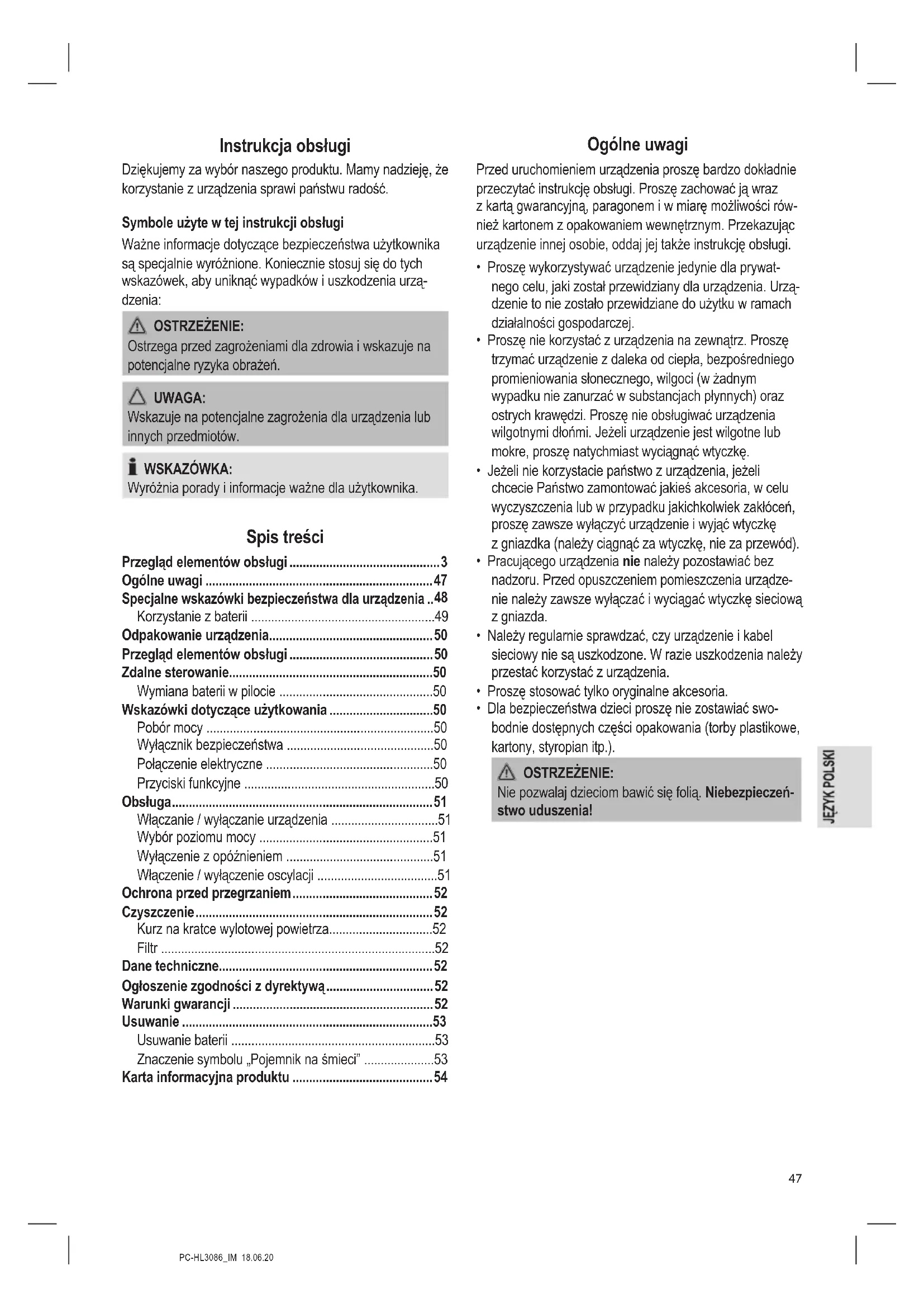 - Dla bezpieczeństwa dzieci proszę nie zostawiać swo- bodnie dostępnych części opakowania (torby plastikowe, kartony, styropian itp.). OSTRZEŻENIE: Nie pozwalaj dzieciom bawić się folią. Niebezpieczeń- stwo uduszenia!PC-HL3086_IM 18.06.20