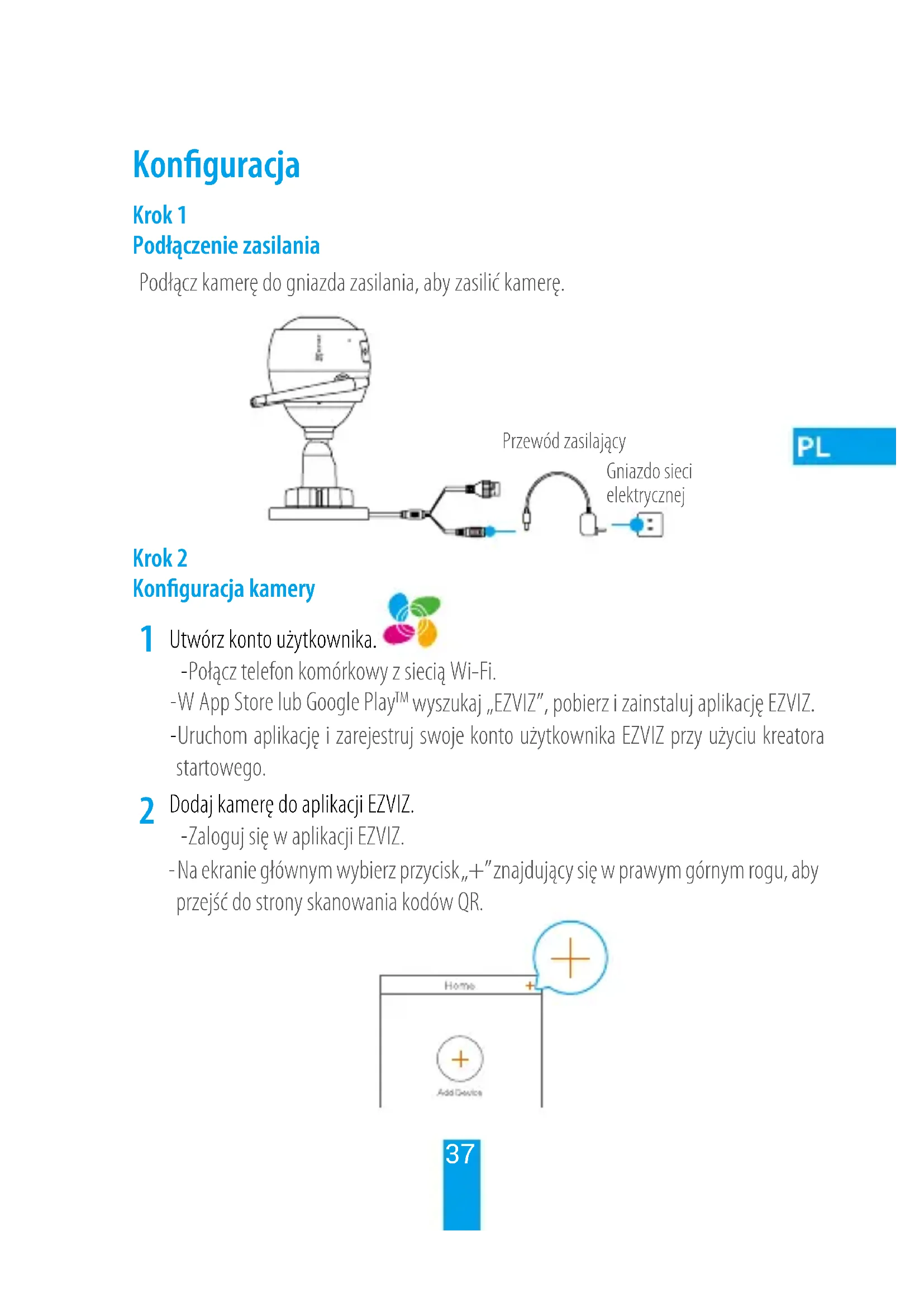 Dodaj kamerę do aplikacji EZVIZ. -Zaloguj się w aplikacji EZVIZ. -Na ekranie głównym wybierz przycisk „+” znajdujący się w prawym górnym rogu, aby przejść do strony skanowania kodów QR.38 -Zeskanuj kod QR znajdujący się na korpusie kamery. -Postępuj zgodnie z instrukcjami aystenta aplikacji EZVIZ w celu zakończenia konguracji Wi-Fi.