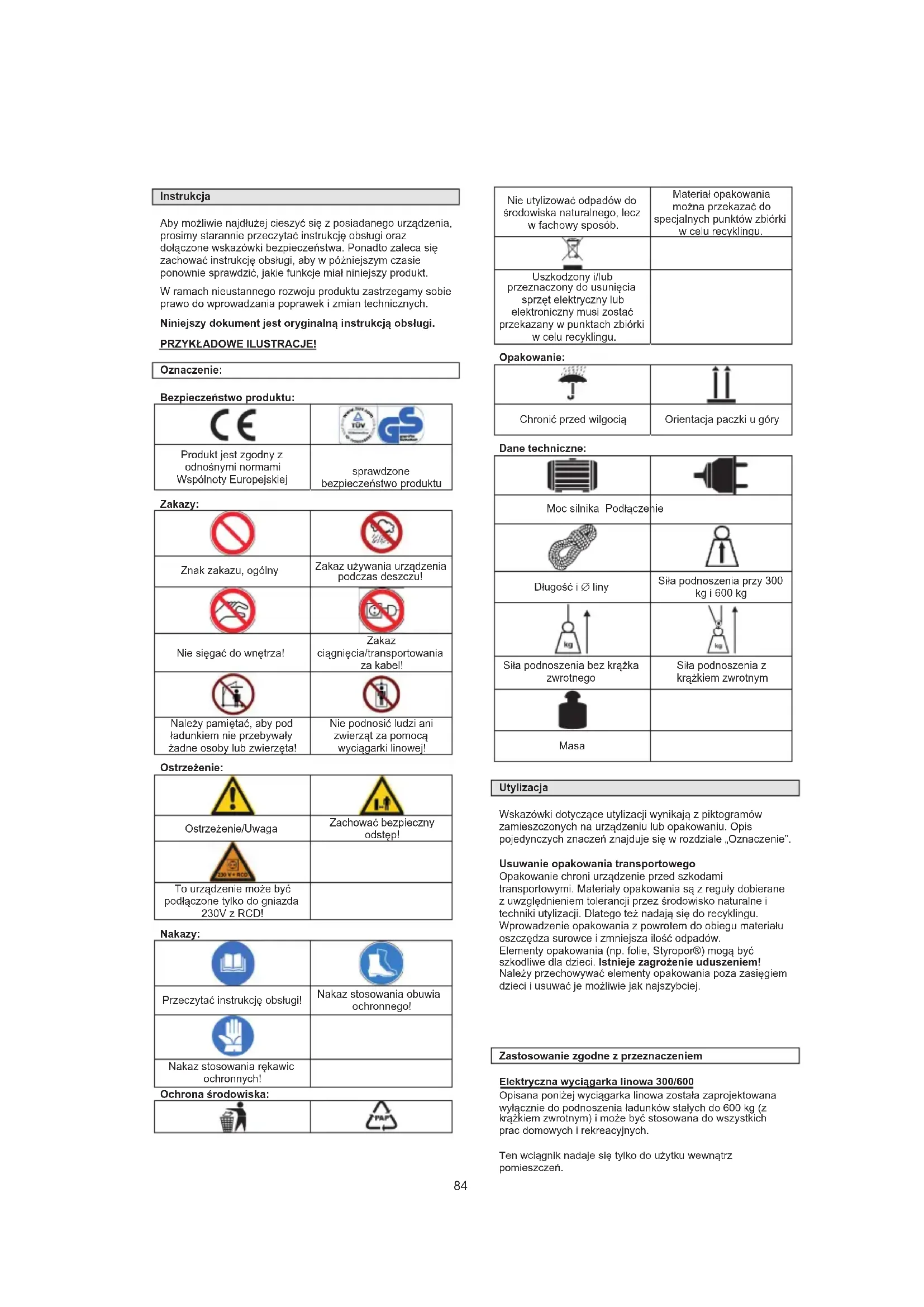 rąĪkiem zwrotnym) i moĪe byü stosowana do wszystkich prac domowych i rekreacyjnych. Ten wciągnik nadaje się tylko do użytku wewnątrz pomieszczeń. 84Urządzenie nie może być używane w rolnictwie. Za pomocą niniejszej maszyny nie moĪna wykonywaü innych pracy niĪ te, do których maszyna zostaáa skonstruowana i te, które opisano w instrukcji obs áugi. KaĪde uĪycie wykraczające poza ten zakres jest uznawane za niezgodne z przeznaczeniem. Producent nie ponosi odpowiedzialnoĞci za wynikające z tego szkody lub obraĪenia. ProszĊ pamiĊtaü o tym, Īe niniejsze urządzenie, zgodnie z jego przeznaczeniem, nie zostaáo skonturowane do uĪycia do celów komercyjnych. Zakres dostawy Wyjąü urządzenie z opakowania transportowego i sprawdziü kompletnoĞü oraz dostĊpnoĞü poniĪszych czĊĞci: 1x KrąĪek zwrotny 4x ĝruba z ábem szeĞciokątnym 2x Uchwyt mocujący 1x Instrukcja uĪytkowania W przypadku brakujących lub uszkodzonych czĊĞci zakresu dostawy prosimy o kontakt ze sprzedawcą. Opis urządzenia (Rys. 1 i 2) a Uchwyt mocujący b ĝruba z ábem szeĞciokątnym c Uchwyt wyáączający d Hak áadunkowy e Wyáącznik kraĔcowy podnoszenia f Silnik g Obudowy wyáącznika h Przeáącznik sterowania i Wyáącznik awaryjny j Uchwyt haka k BĊben na linĊ l CiĊĪar wyáączenia m Lina stalowa n KrąĪek zwrotny o Obudowa noĞnika p Wyáącznik kraĔcowy opuszczania Gwarancja Okres gwarancji wynosi 12 miesiĊcy w przypadku uĪytkowania komercyjnego, a 24 miesiące dla uĪytkowników indywidualnych i rozpoczyna siĊ on w momencie zakupu urządzenia. Gwarancja dotyczy wyáącznie wad materiaáowych i báĊdów zaistniaáych w procesie produkcji. W przypadku roszczeĔ z powodu wady towaru naleĪy, zgodnie z warunkami gwarancji, przedstawiü dowód zakupu z datą sprzedaĪy. Gwarancja nie obejmuje niewáaĞciwego uĪywania, np.: przeciąĪenia urządzenia, zastosowania z uĪyciem siáy zewnĊtrznej, uszkodzeĔ na skutek dziaáania czynników zewnĊtrznych lub przez ciaáa obce, nieprzestrzegania instrukcji obsáugi i montaĪu oraz zwykáego zuĪycia. WaĪne podstawowe wskazówki bezpieczeĔstwa Przed rozpoczĊciem pracy z urządzeniem naleĪy uwaĪnie przeczytaü poniĪsze przepisy dotyczące bezpieczeĔstwa i instrukcjĊ obsáugi. W przypadku przekazania urządzenia innej osobie, prosimy o przekazanie instrukcji obsáugi. InstrukcjĊ obsáugi naleĪy zawsze przechowywaü w bezpiecznym miejscu! Opakowanie: Urządzenie znajduje siĊ w opakowaniu w celu ochrony przed uszkodzeniem podczas transportu. Opakowanie jest surowcem i dlatego nadaje siĊ do ponownego uĪycia lub moĪe byü oddane do recyklingu. ProszĊ dokáadnie przeczytaü instrukcjĊ uĪytkowania i postĊpowaü zgodnie z jej wskazówkami. W oparciu o niniejszą instrukcjĊ obsáugi naleĪy zapoznaü siĊ z urządzeniem, jego prawidáowym uĪytkowaniem i instrukcjami bezpieczeĔstwa. Instrukcje te naleĪy przechowywaü w bezpiecznym miejscu w celu przyszáego uĪycia. x Wyc iągarka linow a moĪe byü obsáugiwana wyáącznie przez osoby, które dokáadnie przeczytaáy i zrozumiaáy niniejszą instrukcjĊ; wyciągarka linowa nie moĪe byü obsáugiwana przez osoby, które nie zostaáy odpowiednio przeszkolone lub których stan zdrowia jest zagroĪony. x Przed kaĪdym uĪyciem naleĪy przeprowadziü oglĊdziny urządzenia. Nie uĪywaü urządzenia, jeĞli urządzenia zabezpieczające są uszkodzone lub zuĪyte. Nigdy nie wyáączaü urządzeĔ zabezpieczających. x Urządzenie naleĪy stosowaü wyáącznie do celów okreĞlonych w niniejszej instrukcji uĪytkowania. x NaleĪy zawsze pracowaü ostroĪnie. NaleĪy obser wowaü swoją pracĊ. NaleĪy postĊpowaü rozsądnie. Nie uĪywaü wyciągarki linowej przy braku koncentracji. x JesteĞ odpowiedzialny za bezpieczeĔstwo w miejscu pracy. x Nigdy nie pozostawiaü urządzenia bez nadzoru. x W przypadku przerwy w pracy naleĪy skáadowaü urządzenie w bezpiecznym miejscu. x Nigdy nie uĪywaü urządzenia podczas deszczu lub w wilgotnym, mokrym Ğrodowisku. x Nigdy nie spryskiwaü wyciągarki wodą ani nie zanurzaü jej w cieczy. x Nie uĪywaü narzĊdzi elektrycznych w pobliĪu áatwopalnych cieczy lub gazów. x Nie wáączaü urządzenia, gdy jest ono odwrócone lub gdy nie znajduje siĊ w pozycji roboczej. x Urządzenie naleĪy przechowywaü z dala od osób postronnyc h, w szczególnoĞci dzieci i zwierząt domowych. Nie pozwoliü aby osoby postronne dotknĊáy narzĊdzia lub kabla, x Po zakoĔczeniu pracy naleĪy wyciągnąü wtyczkĊ sieciową i sprawdziü maszynĊ pod kątem uszkodzeĔ. x Gdy urządzenie nie jest uĪywane, naleĪy przechowywaü je w suchym miejscu, niedostĊpnym dla dzieci. x NapiĊcie sieciowe musi odpowiadaü napiĊciu podanemu na tabliczce znamionowej. x Naprawy mogą byü wykonywane wyáącznie przez wykwalifikowanego elektryka. x Przed uruchomieniem maszyny i po kaĪdym uderzeniu sprawdziü, czy nie ma Ğladów zuĪycia lub uszkodzenia i zleciü wykonanie koniecznych napraw. x Nigdy nie naleĪy uĪywaü czĊĞci zamiennych i akcesoriów, które nie są przeznaczone lub zalecane przez producenta. x Maszy nĊ naleĪy sto sowaü wyáącznie w Ğwietle dziennym lub przy odpowiednim oĞwietleniu sztucznym. x Upewniü siĊ, Īe inne obiekty nie spowodują zwarcia na stykach urządzenia. x Wszystkie kable naleĪy ukáadaü w taki sposób, aby nie wystąpiáo niebezpieczeĔstwo potkniĊcia siĊ i uszkodzenia kabla! x Podczas wykonywania pracy naleĪy przez caáy czas nosiü odzieĪ ochronną odpowiednią dla Ğrodowiska i podejmowaü odpowiednie Ğrodki w celu ochrony przed wypadkami. x Nie uĪywaü kabla niezgodnie z przeznaczeniem. Nie nosiü narzĊdzia za kabel i nie uĪywaü go do wyjmowania wtyczki z gniazdka. Chroniü kabel przed wysoką temperaturą, olejem i ostrymi krawĊdziami. x NarzĊdzia naleĪy pielĊgnowaü z najwyĪszą starannoĞcią. Utrzy mywaü s woje narzĊdzia w czystym 85stanie, aby pracowaü dobrze i bezpiecznie. NaleĪy reg