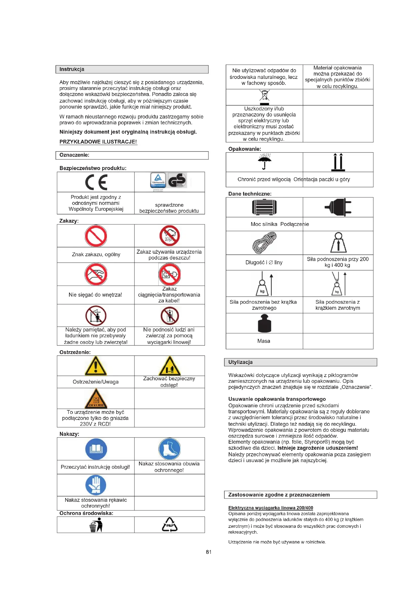 naczenie: Bez pieczeństwo produktu: Produkt jest zgodny z odnośnymi normami Wspólnoty Europejskiej sprawdzone bezpieczeństwo produktu Zakazy: Znak zakazu, ogólny Zakaz używania urządzenia podczas deszczu! Nie sięgać do wnętrza! Zakaz ciągnięcia/transportowania za kabel! Należy pamiętać, aby pod ładunkiem nie przebywały żadne osoby lub zwierzęta! Nie podnosić ludzi ani zwierząt za pomocą wyciągarki linowej! Ostrzeżenie: Ostrzeżenie/Uwaga Zachować bezpieczny odstęp! To urządzenie może być podłączone tylko do gniazda 230V z RCD! Nakazy: Przeczytać instrukcję obsługi! Nakaz stosowania obuwia ochronnego! Nakaz stosowania rękawic ochronnych! Ochrona środowiska: Nie utylizować odpadów do środowiska naturalnego, lecz w fachowy sposób. Materiał opakowania można przekazać do specjalnych punktów zbiórki w celu recyklingu. Uszkodzony i/lub przeznaczony do usunięcia sprzęt elektryczny lub elektroniczny musi zostać przekazany w punktach zbiórki w celu recyklingu. Opakowanie: Chronić przed wilgocią Orientacja paczki u góry Dane techniczne: Moc silnika Podłączenie Długość i ∅ liny Siła podnoszenia przy 200 kg i 400 kg Siła podnoszenia bez krążka zwrotnego Siła podnoszenia z krążkiem zwrotnym Masa Utylizacja