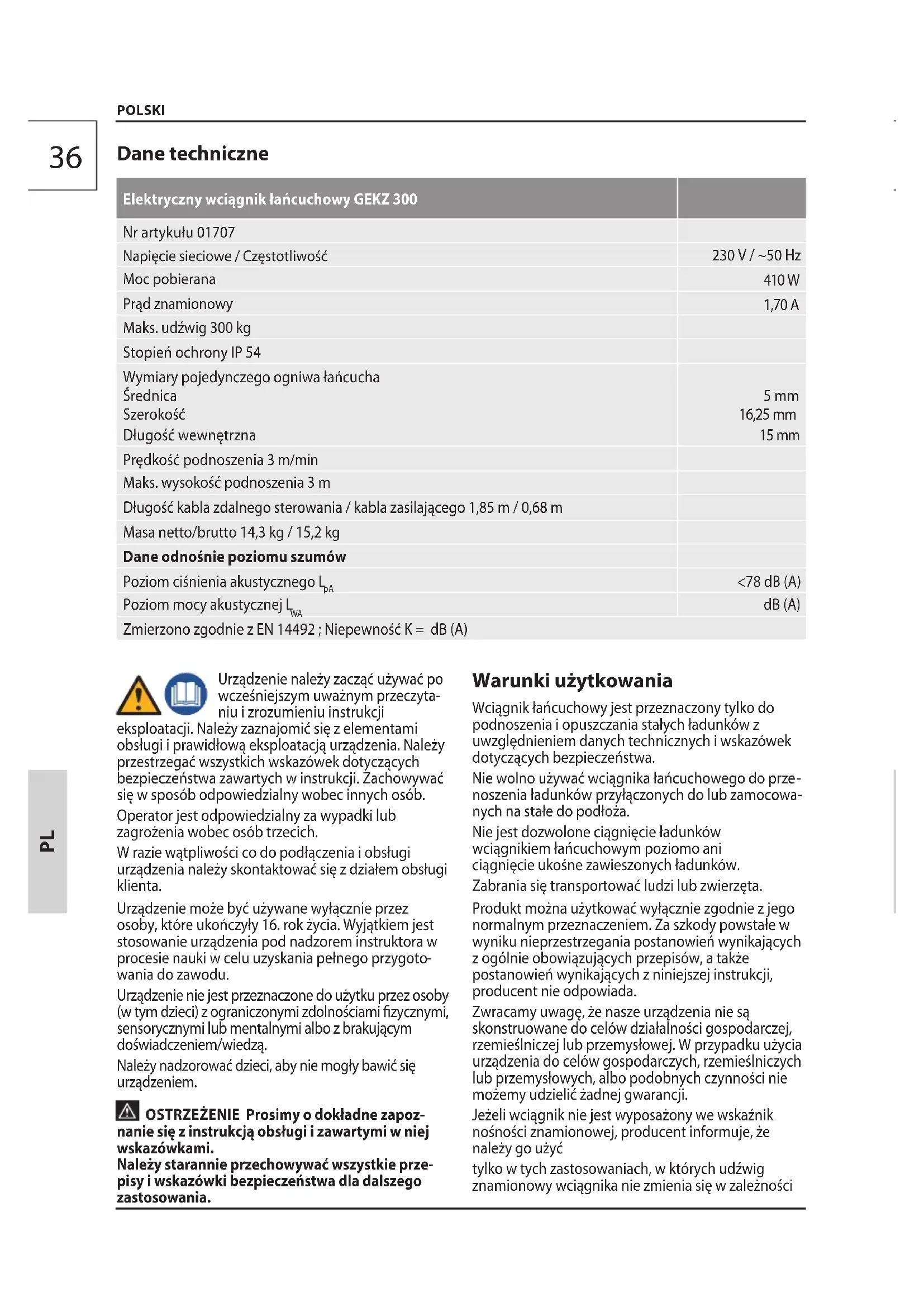noszenia ładunków przyłączonych do lub zamocowa- nych na stałe do podłoża. Nie jest dozwolone ciągnięcie ładunków wciągnikiem łańcuchowym poziomo ani ciągnięcie ukośne zawieszonych ładunków. Zabrania się transportować ludzi lub zwierzęta. Produkt można użytkować wyłącznie zgodnie z jego normalnym przeznaczeniem. Za szkody powstałe w wyniku nieprzestrzegania postanowień wynikających z ogólnie obowiązujących przepisów, a także postanowień wynikających z niniejszej instrukcji, producent nie odpowiada. Zwracamy uwagę, że nasze urządzenia nie są skonstruowane do celów działalności gospodarczej, rzemieślniczej lub przemysłowej. W przypadku użycia urządzenia do celów gospodarczych, rzemieślniczych lub przemysłowych, albo podobnych czynności nie możemy udzielić żadnej gwarancji. Jeżeli wciągnik nie jest wyposażony we wskaźnik nośności znamionowej, producent informuje, że należy go użyć tylko w tych zastosowaniach, w których udźwig znamionowy wciągnika nie zmienia się w zależności Dane techniczne Elektryczny wciągnik łańcuchowy GEKZ 300 Nr artykułu 01707 Napięcie sieciowe / Częstotliwość 230 V / ~50 Hz Moc pobierana 410 W Prąd znamionowy 1,70 A Maks. udźwig 300 kg Stopień ochrony IP 54 Wymiary pojedynczego ogniwa łańcucha Średnica Szerokość Długość wewnętrzna 5 mm 16,25 mm 15 mm Prędkość podnoszenia 3 m/min Maks. wysokość podnoszenia 3 m Długość kabla zdalnego sterowania / kabla zasilającego 1,85 m / 0,68 m Masa netto/brutto 14,3 kg / 15,2 kg Dane odnośnie poziomu szumów Poziom ciśnienia akustycznego L