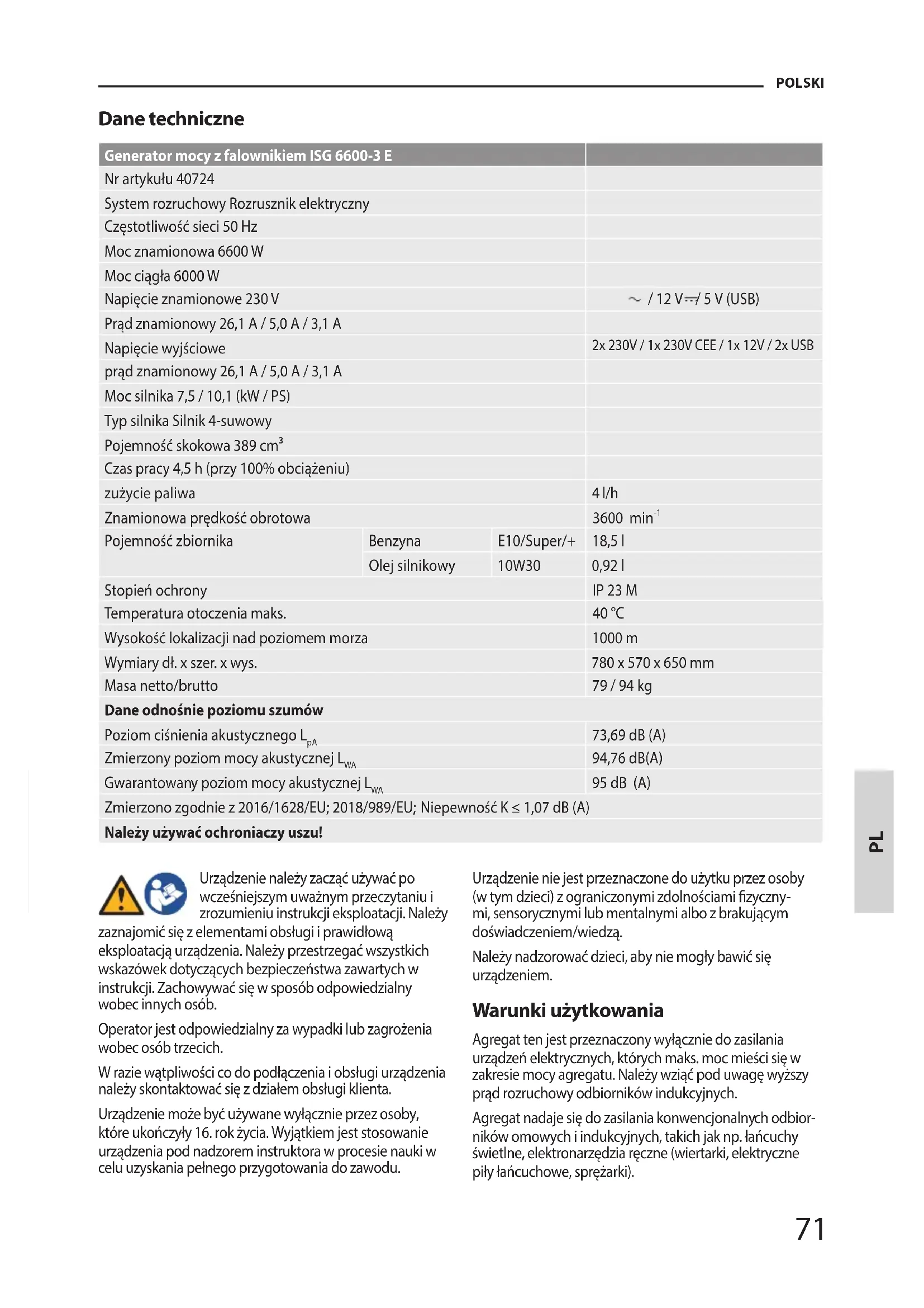 Pojemność zbiornika Benzyna E10/Super/+ 18,5 l Olej silnikowy 10W30 0,92 l Stopień ochrony IP 23 M Temperatura otoczenia maks. 40 °C Wysokość lokalizacji nad poziomem morza 1000 m Wymiary dł. x szer. x wys. 780 x 570 x 650 mm Masa netto/brutto 79 / 94 kg Dane odnośnie poziomu szumów Poziom ciśnienia akustycznego L